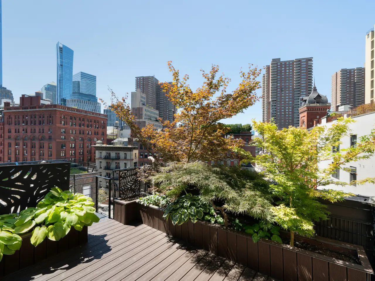 This meticulously renovated Tribeca loft seamlessly blends the iconic character of the neighborhood with contemporary luxury living. Atop a 6 story walkup and crowned with a 420 SF private roof deck this home offers a unique layout of multiple levels and an unparalleled indoor-outdoor living experience in one of NYC's most coveted neighborhoods. Tucked away on a picturesque, tree-lined street, this 2-bed, 2.5-bath loft exudes classic Tribeca charm-soaring beamed ceilings, exposed brick, and a stunning wall of floor-to-ceiling windows where you can enjoy sunset views over the cobblestone streets and eclectic architecture of the surrounding area. The gourmet kitchen seamlessly integrates into the living/dining area, featuring Carrara marble countertops and top-tier Bosch and Bertazzoni appliances. Thoughtfully designed for privacy, both bedrooms have en-suite baths and generous closet space, positioned on opposite sides of the loft. Enter the primary suite through a salvaged freight elevator door from the original manufacturing space, where you'll find 14' ceilings, a skylight, a sitting area perfect for a home office or dressing room, a walk-in closet, and a luxurious marble bath with a deep soaking tub. A retractable staircase in the living room leads to a landscaped private outdoor space with additional access to the building's furnished common roof deck. As an added bonus, the original mechanical room for the building's freight elevator shaft has been reconstructed into a flexible space unlike any other in NYC. With its own heating/cooling system, this space is ideal as a gym, home office, studio, or anything you could imagine. Additional highlights of this one of a kind home include central heating & air, an in-unit washer/dryer, abundant built in closet space throughout and a video intercom. Please note: gas and water are an additional $153/month. 1 Worth Street offers unparalleled access to one of NYC's most sought-after neighborhoods. Known for its cobblestone streets, historic architecture, and vibrant arts scene, Tribeca is home to some of the city's best dining, shopping, and entertainment. Indulge in Michelin-starred cuisine at Marc Forgione or enjoy classic Italian at Locanda Verde and modern French cuisine at The Odeon. For brunch, Bubby's is a neighborhood favorite. High-end shopping awaits at Shinola and Patron of the New, while the Tribeca Film Festival adds a cultural touch each year. Enjoy outdoor escapes at Hudson River Park and Pier 25, featuring waterfront views, a skate park, and mini golf. Convenient access to multiple subway lines (1, 2, 3, A, C, E, 4, 5, 6, R, W) ensures effortless travel throughout the city.