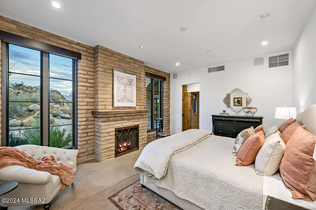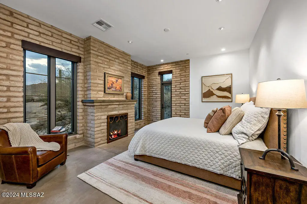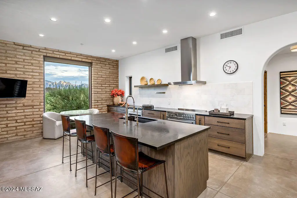 Burnt Adobe Brick Home with Modern Influences in Stone Canyon.Experience refined desert living in this beautifully executed burnt adobe brick home that blends timeless character with modern design. Soft arches, exposed adobe walls, and metal accents pair seamlessly with concrete floors and clean, organic finishes for a minimalist yet inviting aesthetic.Presented fully furnished, the interiors reflect a cohesive modern desert style, allowing for an effortless move-in experience. The kitchen is sleek with a functional layout, generous island and breakfast nook. The mudroom includes a built-in bench, drop zone, and storage closet, while the spacious laundry room provides additional cabinetry, a workstation, and sink.