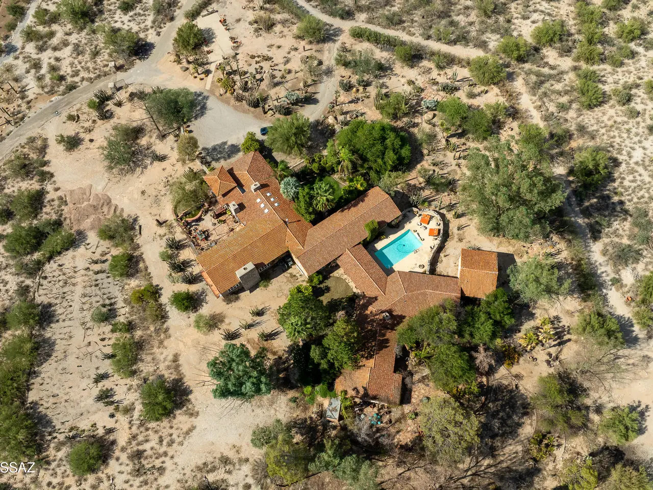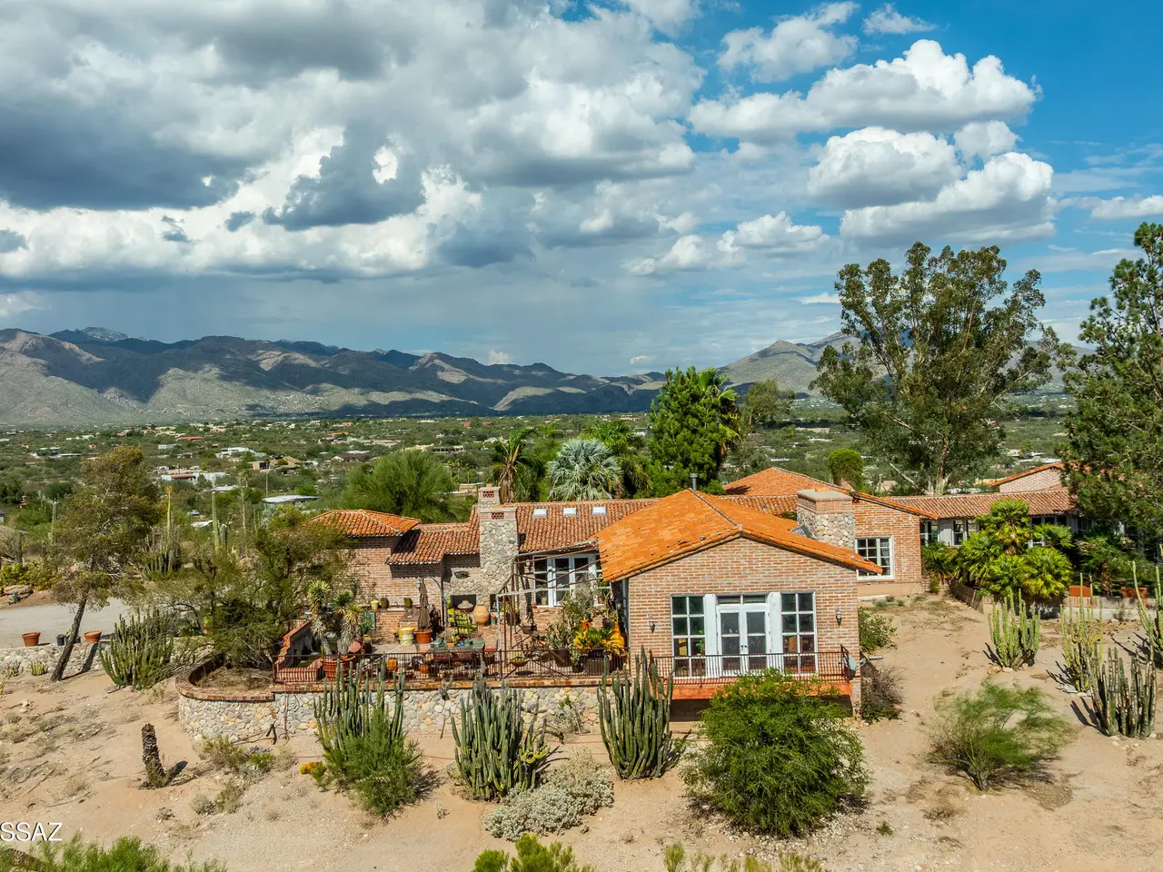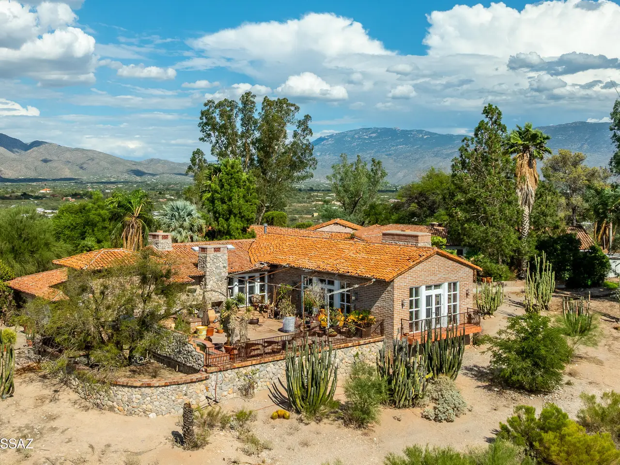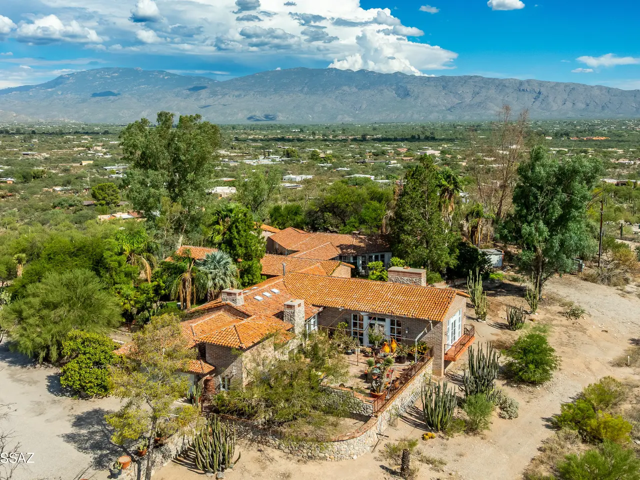 TAR Home Winner & Long Realty Tanque Verde Office Winner. Timeless elegance meets western charm in this historic estate set among sweeping desert landscapes. Featuring original burnt adobe architecture, soaring ceilings, stone floors, wood beams, fireplaces, and generous living spaces, the home offers a rare blend of heritage and modern comfort. Designed with equestrian potential, it includes two 3.4-acre parcels where stables and corrals once stood, providing space to build, ride, or sell, along with a private well. This hillside property boasts panoramic mountain and desert views, a spacious updated kitchen, pantry, and grand entertaining areas, making it a unique opportunity rich in history and character.