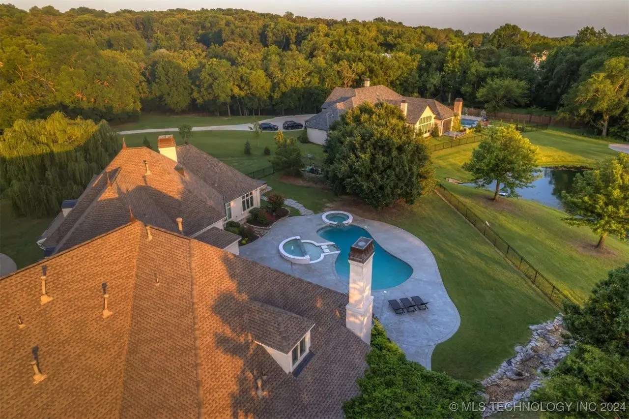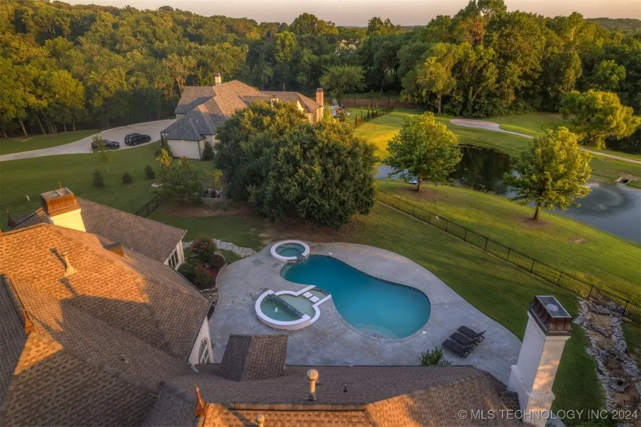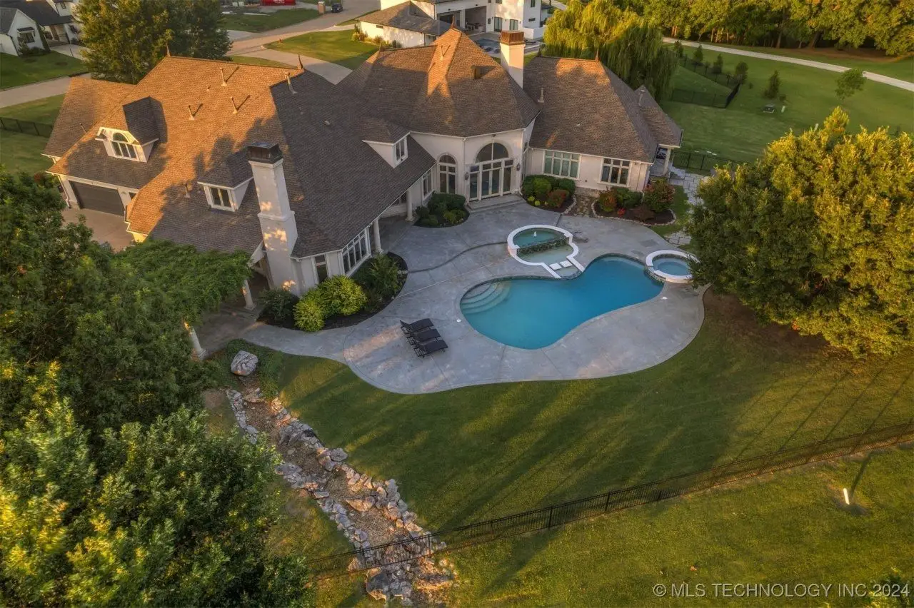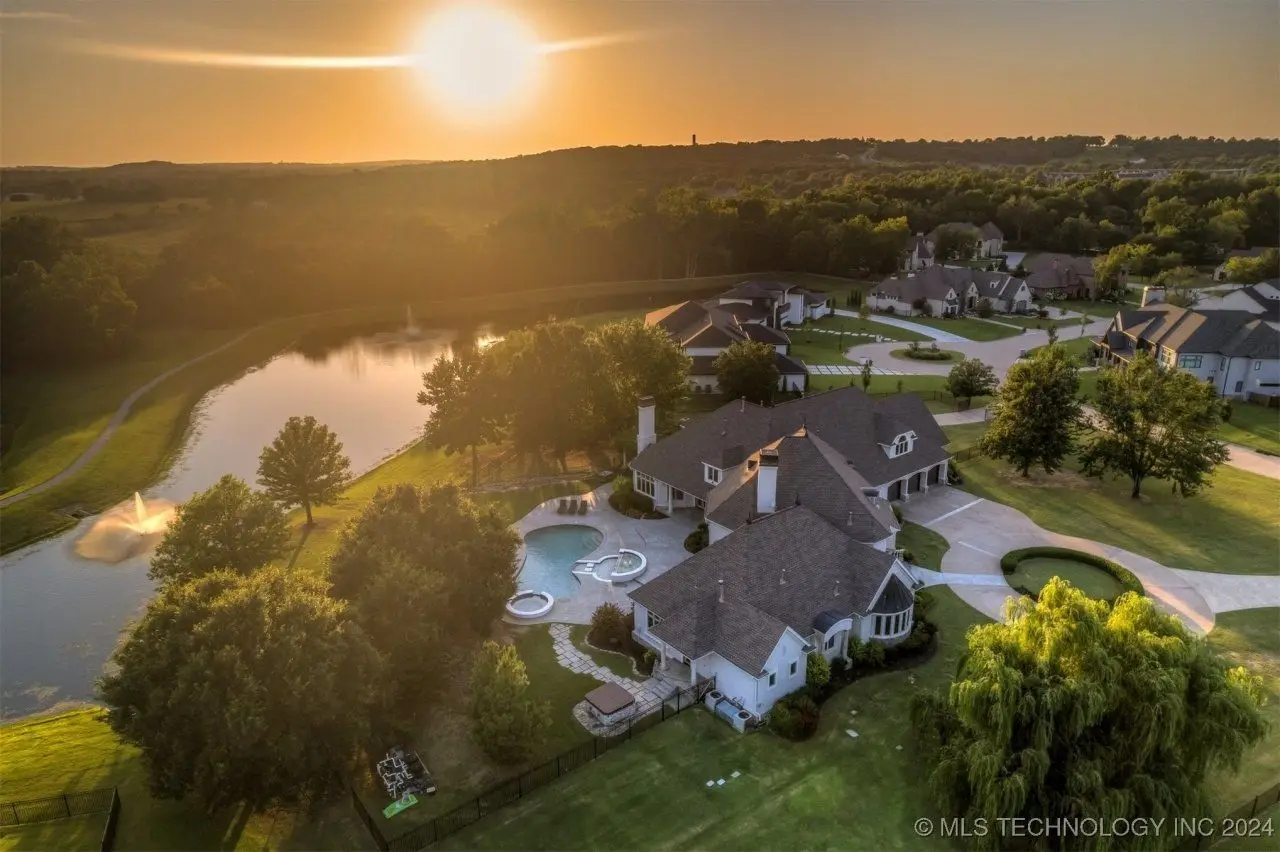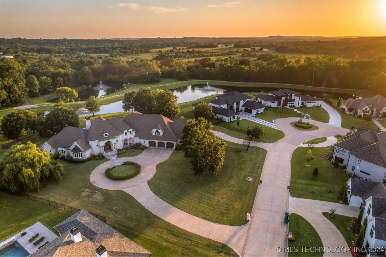 This incredible custom built Estate is perfectly situated on almost 1.5 acres, in the gated community of Oak Leaf Estates. Within a mile of the Oaks Country Club and close to dining and shopping, the location is unmatched! All brand new HVAC systems, in winter 2024, Pool resurfaced and new pool tile in fall/winter 2024 and new roof scheduled to be completed January 2025! This estate is perfect for entertaining with nearly 10,000 square feet and panoramic views of a 4 acre pond with fountains and custom lit walkways. Entertain in the outdoor space which includes a custom pool, spa plus wood burning fireplace. This home features, dual offices, tiered theatre room seating 14 with ticket booth and full bar, stunning kitchen, relaxing living space with incredible views, a home gym and private spa. The primary bathroom has heated floors with separate vanities, walk in shower, Jacuzzi tub and the California closet includes washer/dryer. The generously sized bonus space was built to also be utilized as a Mother-in-law suite / guest quarters, complete with bath and kitchenette. The incredible 7-car pass thru garage also opens to a back gated driveway allowing for additional entry.