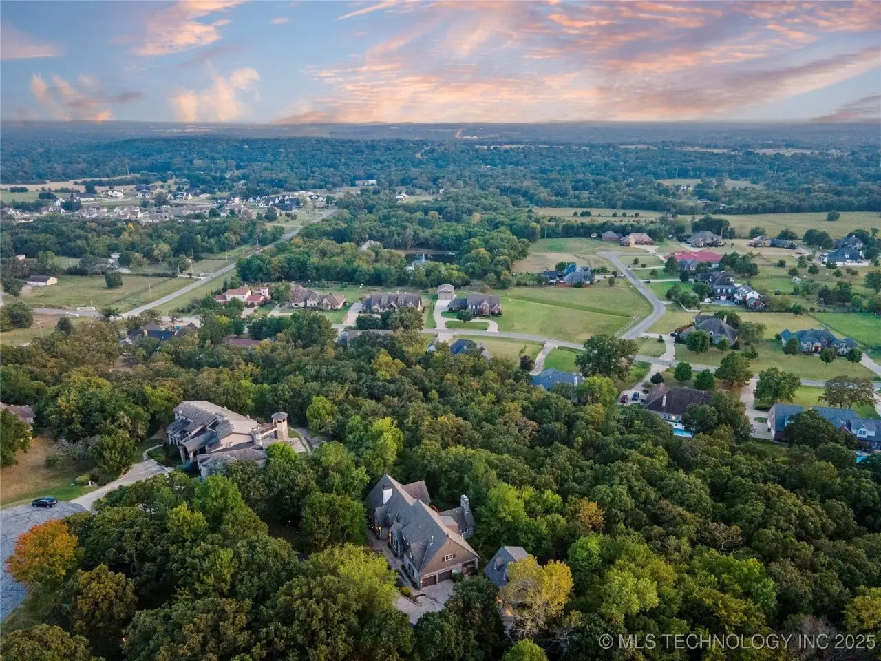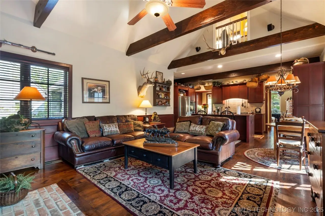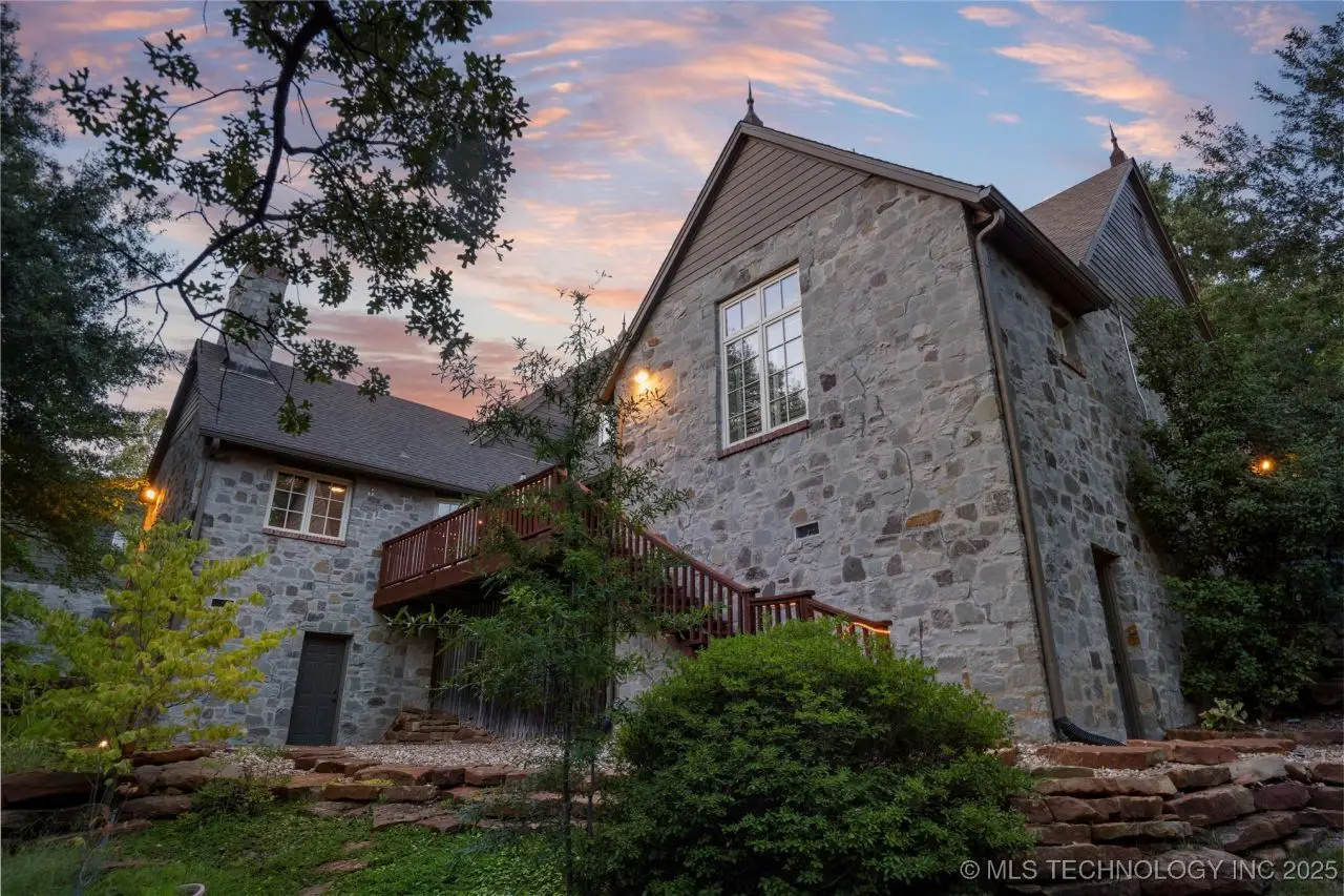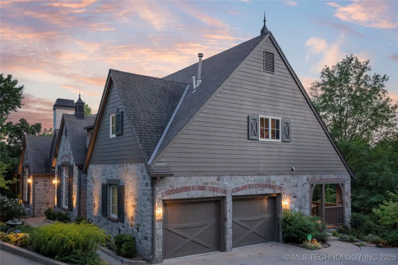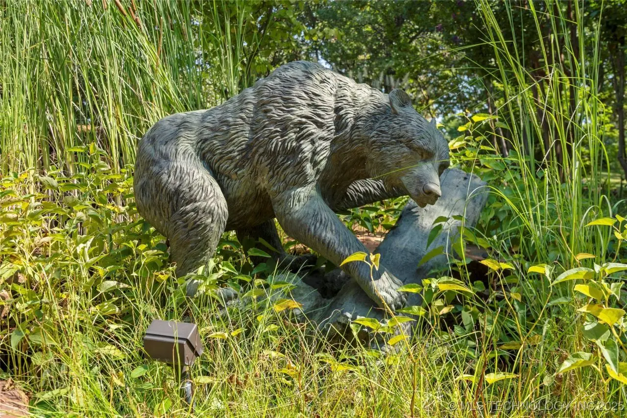 Welcome to a home that's more than a house-it's a lifestyle. Set on just over two acres at the Oaks Country Club, this retreat offers peace and privacy while keeping you minutes from Tulsa Hills and Highway 75. Bronze sculptures-an elk, a mama and baby bear, and a boy fishing-dot the property, adding character to this one-of-a-kind setting. The home itself blends stone masonry and lodge-like warmth. The great room, anchored by a wood-burning fireplace and wall of windows, flows into a chef's kitchen with gas cooktop, large island, and eating area. A prep pantry, wet bar, and formal dining room create seamless entertaining space. Both the formal living room and primary suite feature gas log fireplaces, and oversized bedrooms, each with a private ensuite, give everyone space and privacy. Downstairs also includes an office and a utility room that doubles as a prep kitchen. Upstairs, a comfortable hangout with built-in desks provides space to work or relax. Reclaimed pine floors bring warmth throughout both levels. Step outside to find not just one garage but two-an attached two-car plus a detached three-car with finished guest quarters above that could have multiple uses. Perfect as a hangout, guest suite, or rental income (furniture included). Two additional sheds offer storage for gardening tools and outdoor toys. Enjoy mornings on the screened porch or evenings on the deck with a glass of wine as the sculptures glow under night lights. This isn't just a home. It's a private retreat where nature, art, and convenience come together. (Per APPRAISAL: home 3,884 square feet plus 639 square foot guest quarters above garage for 4,523 total livable square feet.)