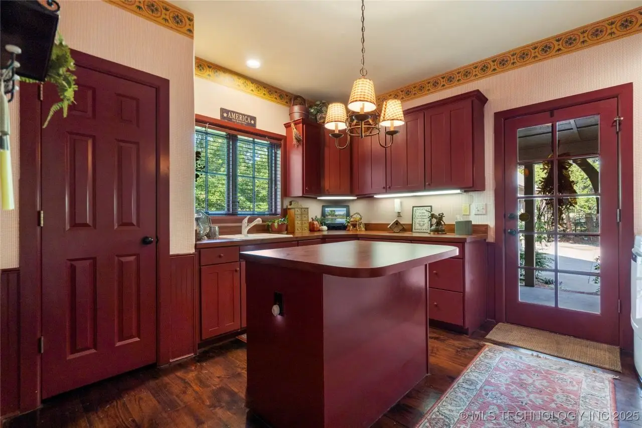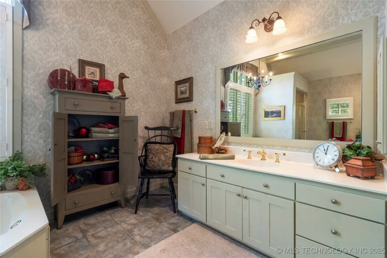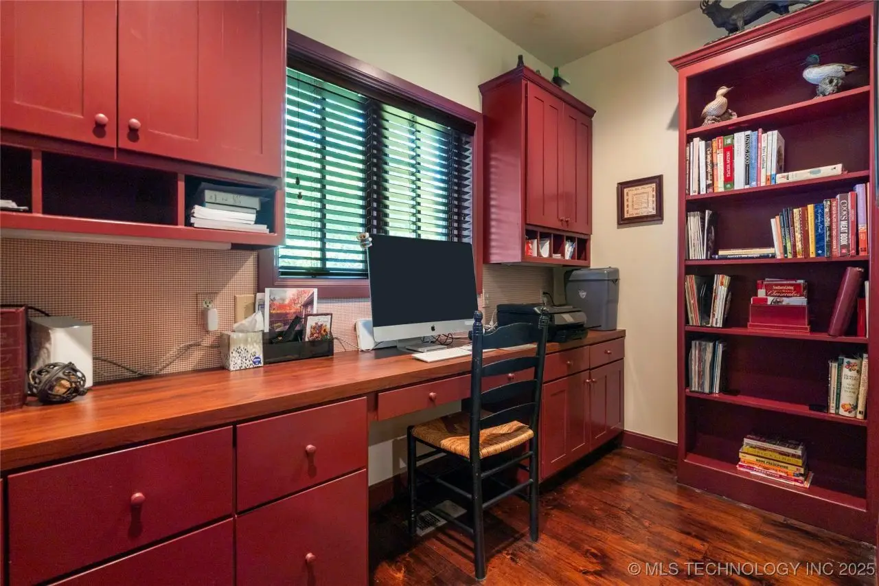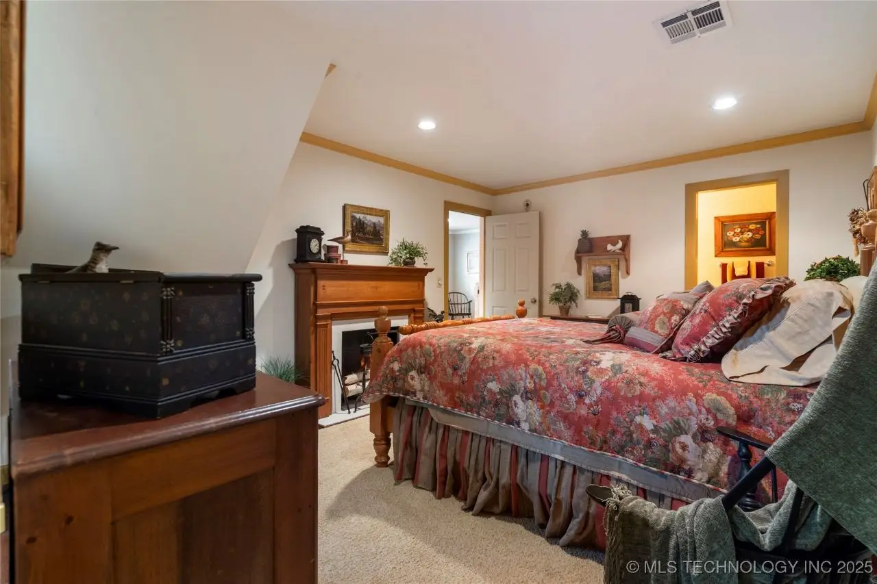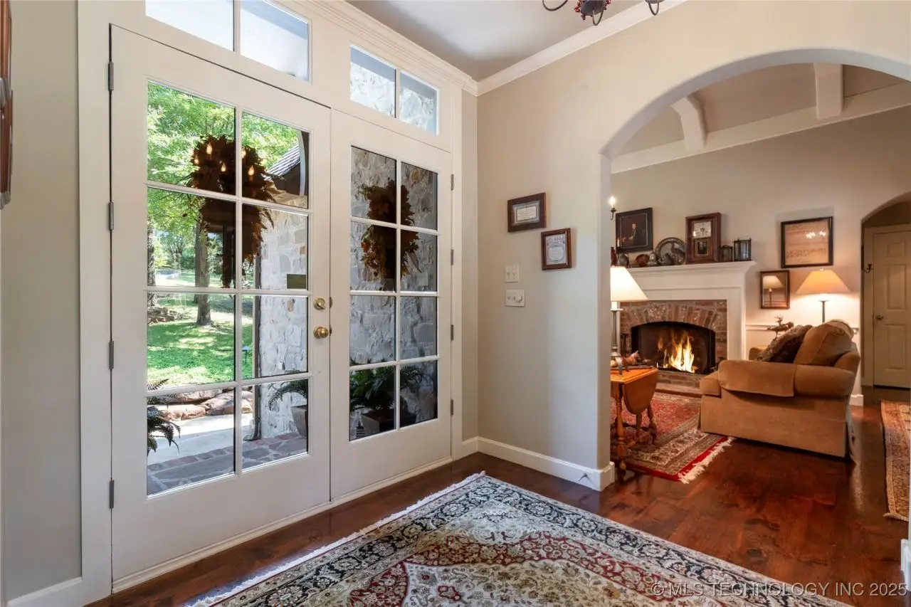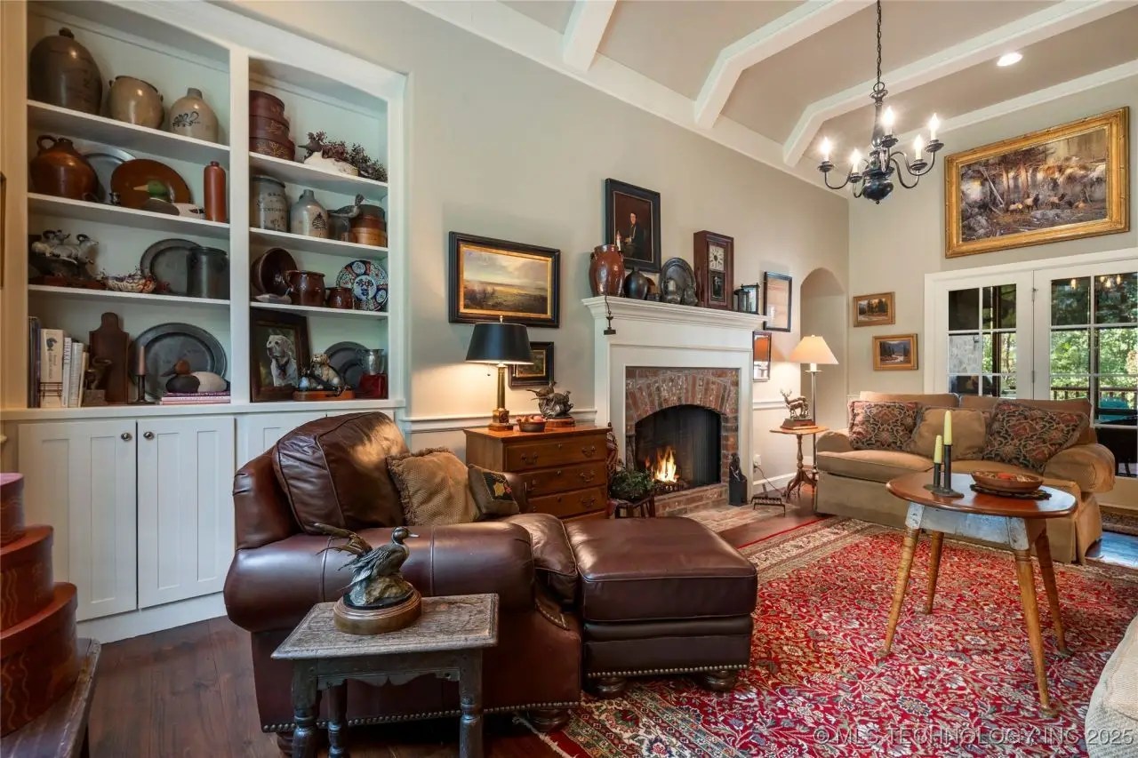 Welcome to a home that's more than a house-it's a lifestyle. Set on just over two acres at the Oaks Country Club, this retreat offers peace and privacy while keeping you minutes from Tulsa Hills and Highway 75. Bronze sculptures-an elk, a mama and baby bear, and a boy fishing-dot the property, adding character to this one-of-a-kind setting. The home itself blends stone masonry and lodge-like warmth. The great room, anchored by a wood-burning fireplace and wall of windows, flows into a chef's kitchen with gas cooktop, large island, and eating area. A prep pantry, wet bar, and formal dining room create seamless entertaining space. Both the formal living room and primary suite feature gas log fireplaces, and oversized bedrooms, each with a private ensuite, give everyone space and privacy. Downstairs also includes an office and a utility room that doubles as a prep kitchen. Upstairs, a comfortable hangout with built-in desks provides space to work or relax. Reclaimed pine floors bring warmth throughout both levels. Step outside to find not just one garage but two-an attached two-car plus a detached three-car with finished guest quarters above that could have multiple uses. Perfect as a hangout, guest suite, or rental income (furniture included). Two additional sheds offer storage for gardening tools and outdoor toys. Enjoy mornings on the screened porch or evenings on the deck with a glass of wine as the sculptures glow under night lights. This isn't just a home. It's a private retreat where nature, art, and convenience come together. (Per APPRAISAL: home 3,884 square feet plus 639 square foot guest quarters above garage for 4,523 total livable square feet.)