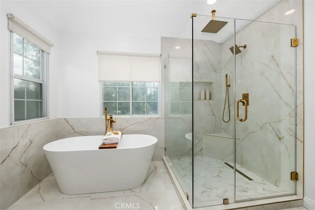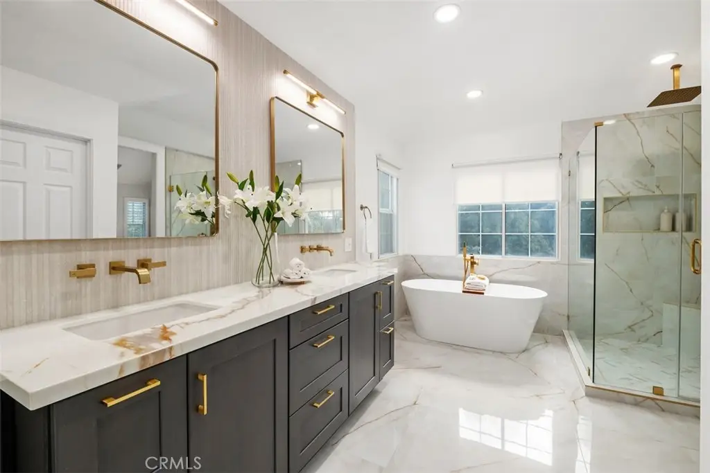 Welcome to this stunning two-story home in the desirable gated community of Tustin Ranch, offering over 2,900 square feet of beautifully upgraded living space. This residence features marble and wood flooring throughout, soaring ceilings, and recessed lighting that enhances its elegant design. The completely remodeled kitchen boasts new cabinets, modern appliances, a large island with bar seating, and a bright breakfast area that flows into the spacious family room with a cozy fireplace. The home offers four bedrooms plus a bonus room and three remodeled bathrooms--one bedroom and bath conveniently located downstairs. Each bathroom is upgraded with modern fixtures including handheld and rain showers. Additional highlights include a formal living room, formal dining room, recessed lighting throughout and ceiling fans in all room. A three-car garage with epoxy floors. The backyard is generously sized yet low-maintenance, perfect for relaxing or entertaining. Centrally located near major freeways, this home combines luxury, comfort, and convenience in a secure gated setting. Walking distance to prestigious Tustin Memorial Academy. Highly regarded Tustin Unified School District.