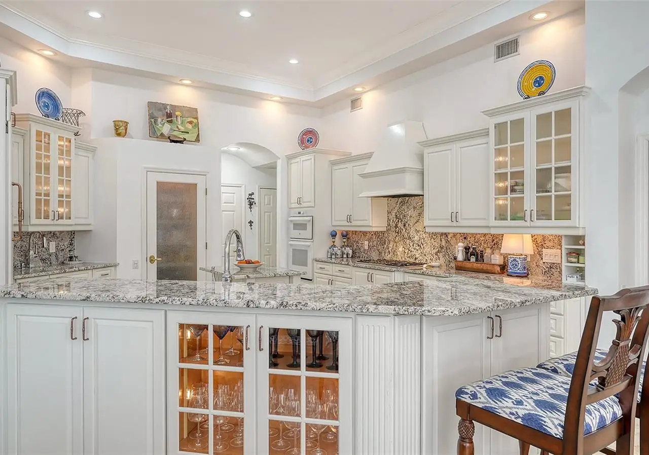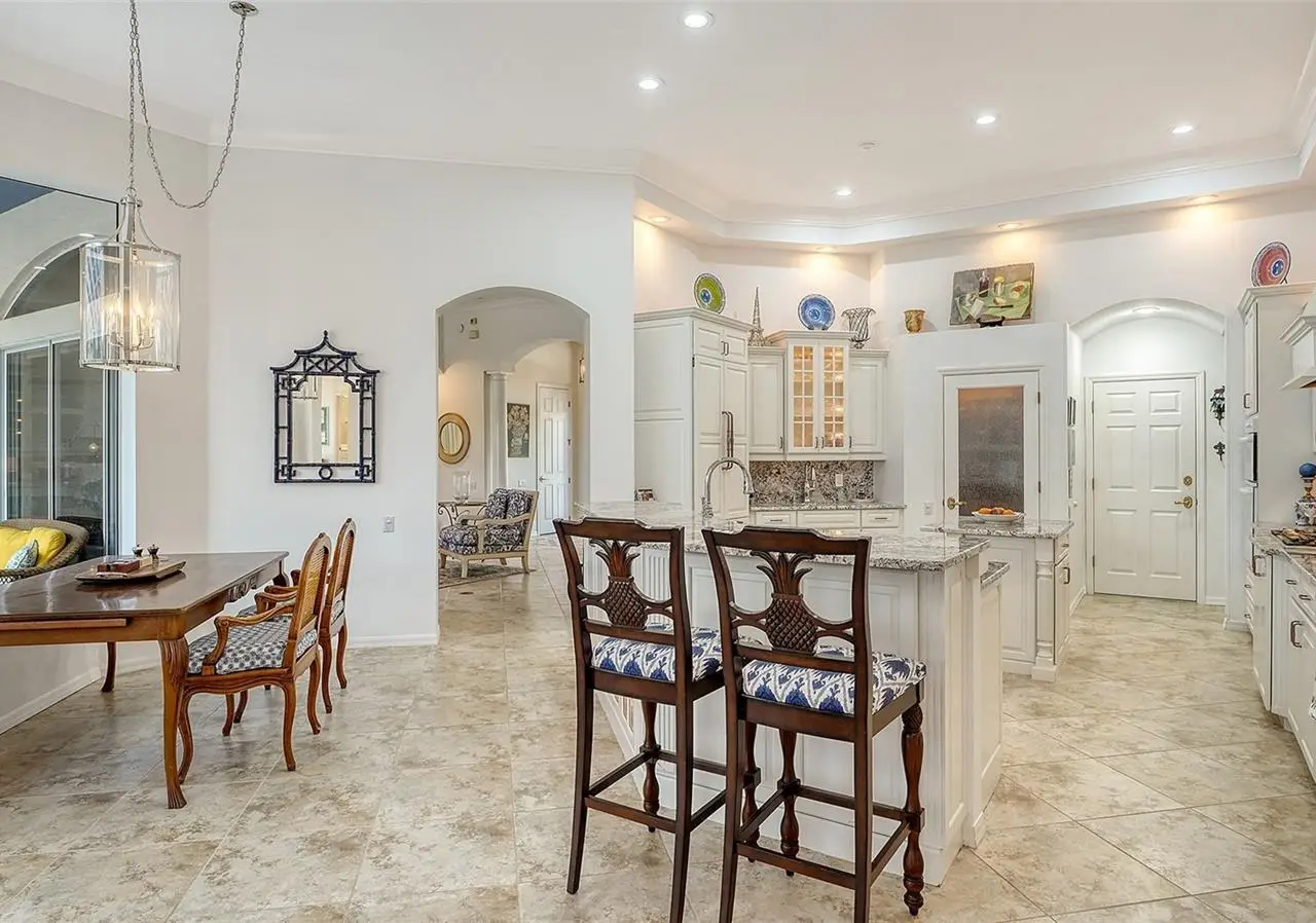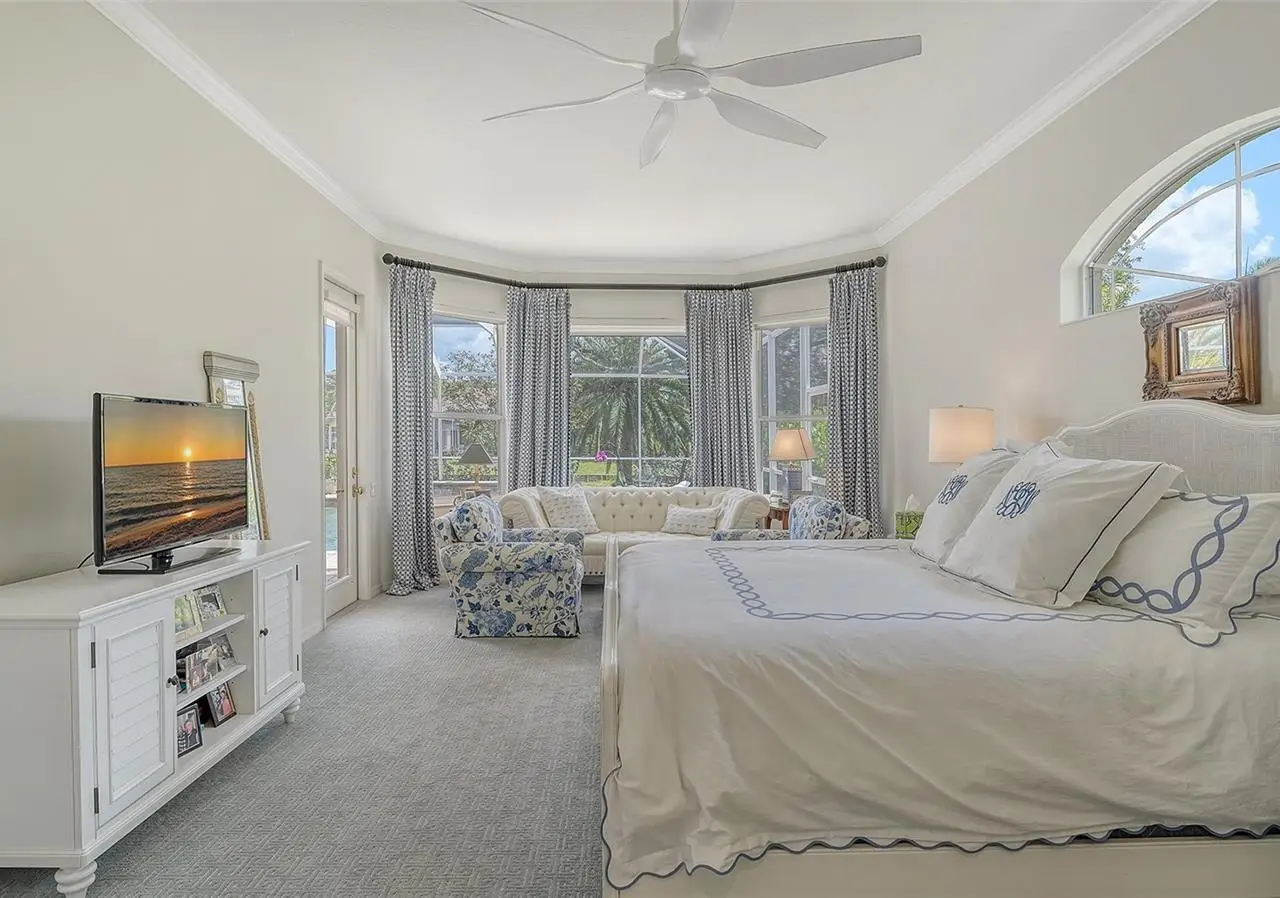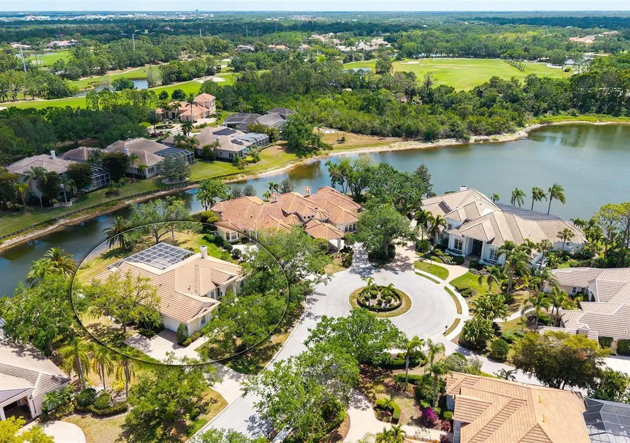Hyde Park, an enclave of only 12 homes inside the gates of University Park Country Club, sets itself apart for the larger homesites where home sizes vary from 3,000-5,600 sq feet. This home sits on a serene HALF-ACRE and on the water. Slow down and enjoy the drive and lush landscaping throughout the community and arrive in this scenic and charming neighborhood. This home is graced with a beautiful entry of leaded glass doors and custom details throughout. A classic floorplan with an open family room/kitchen that has been updated with timeless finishes. Side entry garage, paver driveway and paved walkway to the entry. (TILE ROOF REPLACED: 2015). Foyer opens to the living and dining room and this home is saturated in natural light with tall windows and sliding glass doors to the pool area. Flooring is 18-inch diagonal tile; soaring ceilings and crown moldings. A feature that sets this welcoming home apart is a floor-to-ceiling striking wall of bookcases enhanced by accent lighting. Fully equipped and well-appointed kitchen; a wet bar and a walk-in pantry. A charming breakfast nook overlooks the pool with an aquarium glass window. Split bedroom plan includes a spacious primary suite with two custom closets, a stunning renovated bathroom with dual granite vanities, walk-in shower, marble flooring, and a private water closet. Two additional bedrooms plus a versatile fourth bedroom with direct pool access can serve as an office, study or additional living space. The backyard and pool area features an expansive paver lanai, two covered seating areas and room for an outdoor kitchen (natural gas hook-up). The pool overlooks the water and the natural beauty surrounding this home is simply relaxing. Residents of University Park Country Club have access to 27 holes of championship golf, tennis and pickleball courts, state-of-the-art fitness center, walking trails, and a wide variety of social activities, all within a secure, gated community. Located just minutes from downtown Sarasota, UTC Mall, world-class shopping, dining, beaches, and SRQ International Airport, this home offers the ultimate lifestyle in one of Sarasota's most desirable communities.