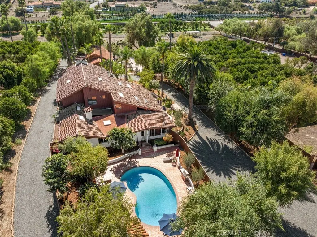 With a rare blend of old-world charm and modern amenities, this hacienda style estate brims with history, grace, attention to the details for fine living, entertainment and enjoyment of the land. The main house showcases classic hacienda elements plus a generous guest house provides a comfortable stay for visitors. Nestled on over 6 lush acres, everything was designed for unforgettable gatherings. The expansive entertainment pavilion features party rooms, a kitchen, bathroom and bar. Host lively events on the dance floor, dine under ambient lighting, or enjoy live performances on the built-in stage. Stroll through your own flourishing grove of delicious Valencia oranges and passion fruit irrigated by your private well. Tend to your horses or farm animals at the nearby corrals. Grab a game at your private sport court and a swim afterwards in the refreshing sparkling pool. Eco-conscious solar panels are owned. Find dedicated parking and hookups for your RV next to a custom deck. The private gated entrance and beautiful tree lined driveway is timeless and impressive. Whether looking for a private oasis or a family compound, hobby farm or expand your crop, tend to a horse or buy another, this stunning property has it all.
