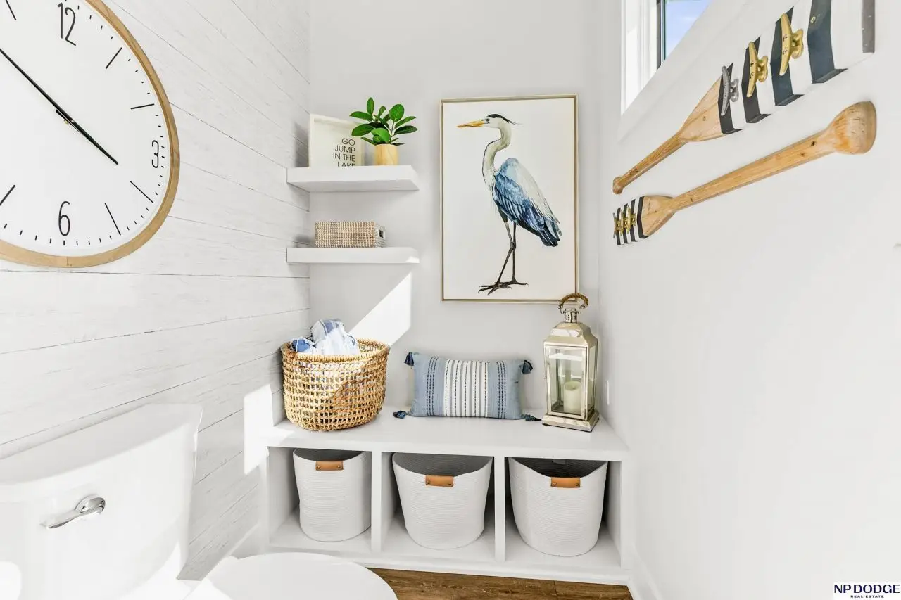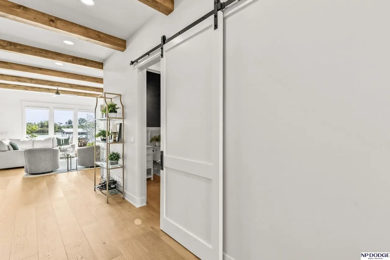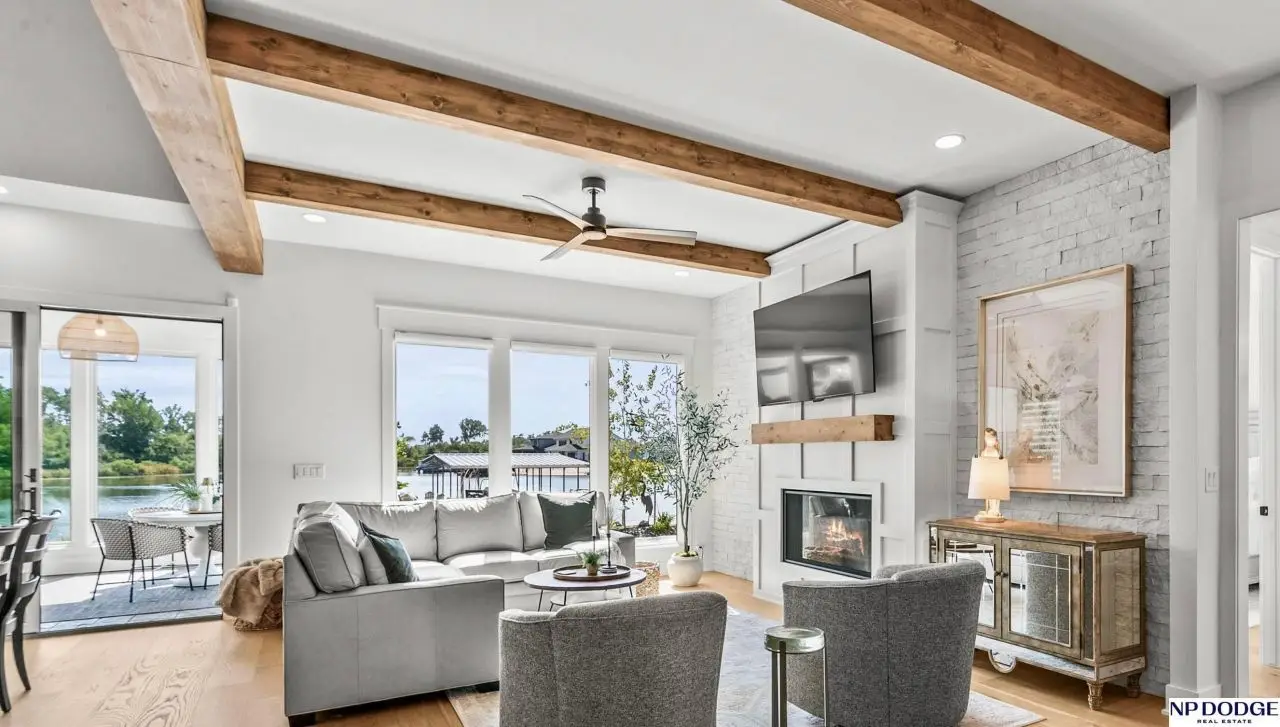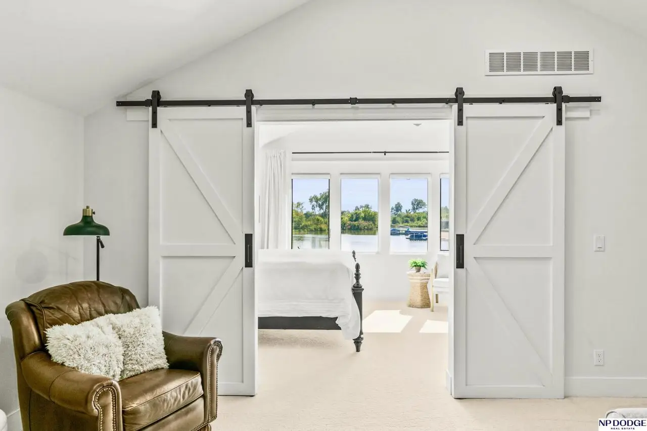 Experience the epitome of lakeside living in this former Street of Dreams custom home with sweeping views and timeless craftsmanship. A chef-inspired kitchen boasts an oversized island, hidden walk-in pantry with butcher block counter, custom hood, and coffee/wine bar with refrigerator. White oak floors, pine beams, vaulted ceilings, and a stone wall fireplace define the main living area, opening to a climate-controlled sunroom with fabulous views. The primary suite is a true retreat with lake access and a custom closet with laundry. A second main floor ensuite provides comfort and privacy for guests. Additional features include a second laundry, hidden storm shelter, outside lake bathroom, and heated garage. Outdoor living shines with a stamped patio, pergola with pull-down screens, stone fire pit landing, professional landscaping, and seawall. A Rhino Dock concrete deck and HydroHoist boat lift add seasonal enjoyment, while a gas generator provides peace of mind. AMA