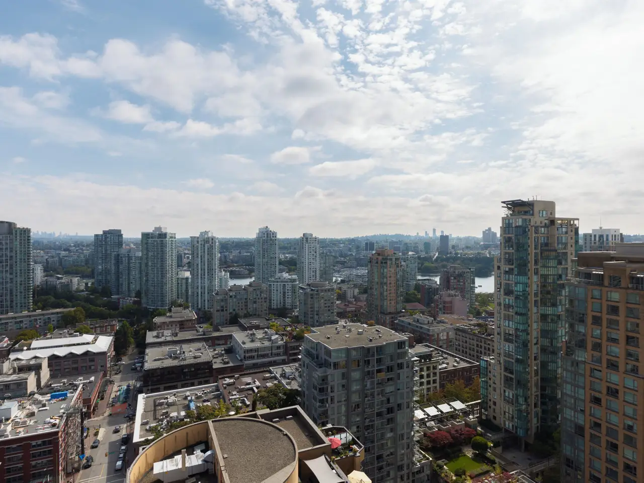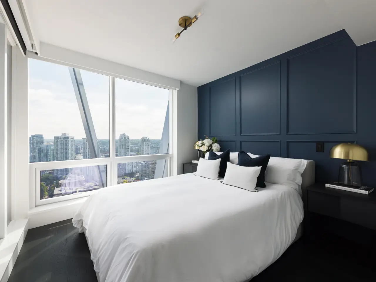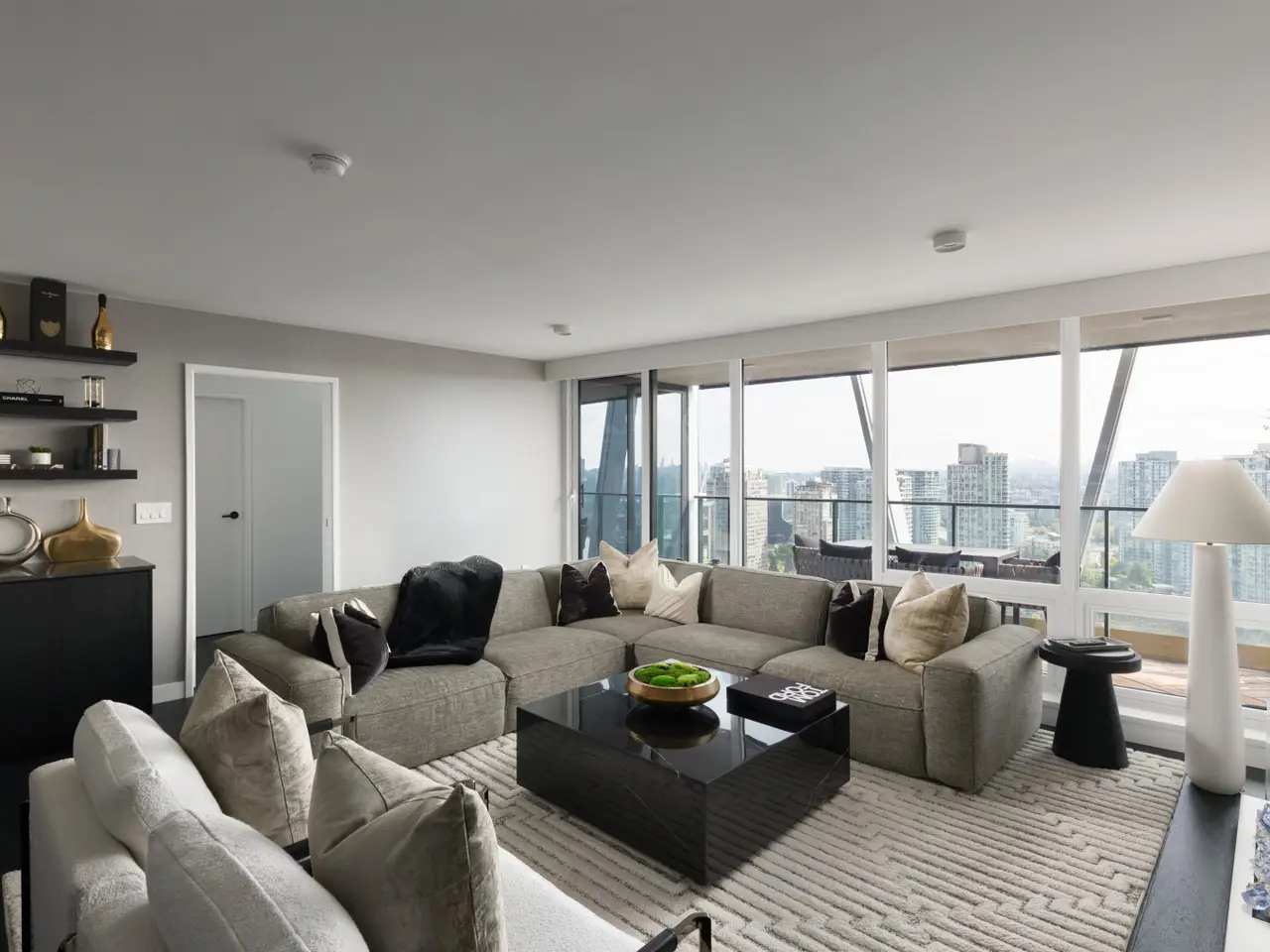 Elevated & updated corner home at 8X on the Park with panoramic views of False Creek, city, and mountains. This refined 3 bed, 2 bath residence features a 10ft natural stone island, integrated Miele appliances, custom millwork, powered blinds, and floor-to-ceiling windows. The open plan flows to an oversized covered patio with herringbone wood decking. Elegant bedrooms, a reimagined walk-in closet, engineered hardwood, natural tile, & A/C throughout complete the home. Includes 2 side-by-side parking, storage, and bike locker. Enjoy world-class amenities: concierge, fitness centre, and rooftop oasis. A rare, turnkey offering in one of Vancouver's premier buildings.