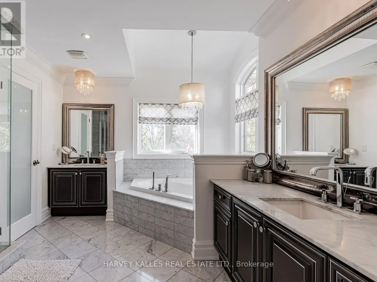 Magnificent one-of-a-kind family home nestled on one of the most sought-after streets in the prestigious Valleys of Thornhill community. Backing onto a tranquil ravine, this designer-decorated residence showcases a stunning saltwater inground pool with a water feature, built-in BBQ, and multiple lounge, seating, and dining areas across an expansive 80-ft-wide backyard oasis. The sun-filled interior boasts 9' main floor ceilings, hardwood floors, pot lights, crown moulding, and elegant upgraded fixtures throughout. Perfect for entertaining, the home offers spacious living and dining areas, a cozy family room, and a gourmet chef's kitchen featuring a butler's pantry, oversized island, Corian counters, tiled backsplash, and top-of-the-line built-in stainless-steel appliances. The large breakfast area walks out to a deck overlooking the private treed backyard. Enjoy convenient garage access through the laundry/mudroom. The luxurious primary retreat features a 5-piece ensuite, walk-in closet, and an adjoining home office or sitting room. Three additional bedrooms each include walk-in closets with custom built-ins. The impressive walk-out basement offers an office, recreation and exercise areas, ample storage, and two washrooms-ideal for use after a swim. Situated close to top-rated schools, 2 community centres, parks, restaurants, shopping, and public transit, this exceptional property blends elegance, comfort, and convenience in one perfect package.