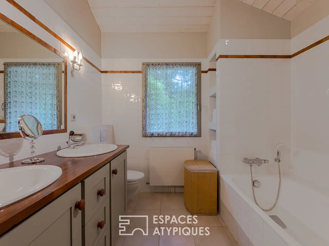 Like an air of Louisiana in Normandy: such is the promise of this incredible house nestled in one of the rare private estates in the Eure valley. Indeed, before accessing the property, you will have to 'show your credentials' at the gates of the Chateau park, a magnificent 70-hectare estate crossed by a river and within which around fifty residences with varied architecture are scattered. Without a doubt, this property is undoubtedly one of the most original and of the highest standard. Born in 2002 from the hand of an inspired architect, the 'V'-shaped architectural house immediately displays a unique character and arouses curiosity thanks to its almond green cladding that is both romantic and contemporary. Continuing, the interior atmosphere is soft and relaxing. A large entrance leads directly to the main room, the large cathedral living room and the adjoining American kitchen. Nearly 65 m2 dedicated to the reception, by the fireplace or by opening the bay windows opening directly onto the beautiful wooden terrace and the swimming pool with counter-current swimming. Each season has its pleasures with only one constant: 'well-being'! The master suite adjoining the living room is no less astonishing: 45 m2 made up of 2 beautiful rooms: one serving as a bedroom and the other which can be transformed into a dressing room or office as desired. An elegant bathroom and a library corridor complete the ensemble. In the other wing of the house, 3 pretty bedrooms, a bathroom, a shower room and separate toilets will welcome family and friends in complete peace and quiet. Upstairs, in the 'turret', 2 additional rooms (bedroom and office) with adjoining shower room and toilet make up almost an independent mini-studio. A pantry and laundry room connect the entrance to the house with the garage, now converted into a workshop and technical room. Heating of the whole is provided by a geothermal heat pump. Outside, the garden designed by a renowned landscaper, who collaborated in the design of the Jardin des Tuileries), is a true enchantment in all seasons; robotic lawn mowers and automatic watering will allow you to enjoy it without constraints and without being overlooked. Double carport with charging station, garage and garden shed complete the premises. For those who find this cocoon too narrow, simply go through the gate to go for a walk in the paths of the estate, near the lake or along the Eure; unless you prefer to perfect your backhand on one of the 3 tennis courts open to the co-ownership. This incredible gem is located 1 hour from Paris and 6km from Pacy-sur-Eure! Louisiana is definitely at your doorstep! CLASSE ENERGIE : C / CLASSE CLIMAT : A Montant moyen estime des depenses annuelles d'energie pour un usage standard, etabli a partir des prix de l'energie de l'annee 2023 : entre 1730€ et 2380€ Les informations sur les risques auxquels ce bien est expose sont disponibles sur le site Georisques : www.georisque.gouv.fr REF. 9232EAE Additional information * 8 rooms * 6 bedrooms * 4 bathrooms * 2 shower rooms * Floor : 1 * 2 floors in the building * Outdoor space : 2635 SQM * Parking : 3 parking spaces