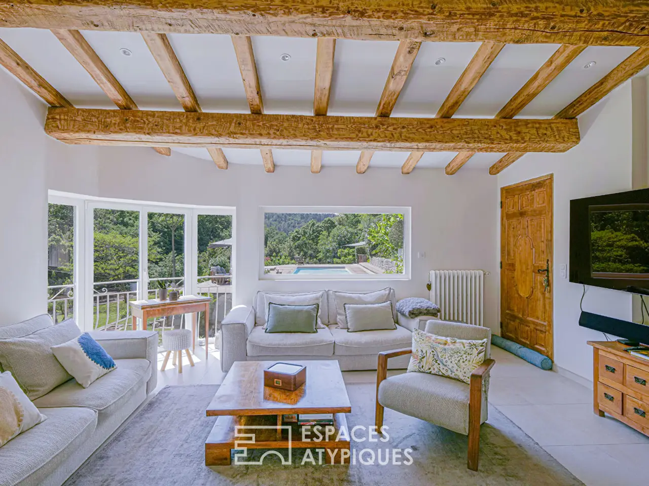 Nestled in a green setting, at the foot of the legendary Baou de Saint-Jeannet, between the sea and the mountains, this property benefits from an exceptional environment, appreciated for its preserved nature and its proximity to shops, schools and communication routes.Formerly a trout farm, the 1960s building with a living area of 263 sqm, sits on a vast wooded plot of more than one hectare, including 6000 sqm enclosed. Its careful layout and modern architecture give the place a warm and authentic atmosphere, perfectly in harmony with the surrounding landscape.The living space is organized around a generous main room bathed in light, with a vast open-plan kitchen opening onto the terrace and the garden. A true cocoon of inspiration where art lovers can let themselves be carried away by the enchanting setting of the surrounding nature.The sleeping area is designed to guarantee privacy and comfort: four en-suite bedrooms, two of which are on the ground floor overlooking the garden and two upstairs, one of which opens onto the terrace, for refined comfort on each level. A separate one-bedroom apartment completes this level.Outside, the property features a lush garden planted with eucalyptus, pine trees, and many other Mediterranean species. A vast stone terrace welcomes moments of outdoor relaxation, while an elegantly integrated swimming pool is accompanied by a superb wooden deck decorated with banana trees, yuka trees, and a covered dining area.The luxury of living by the water: the grounds feature enchanting fish ponds and rare exclusivity with its private access to the river. The garden extends onto a vast plot of land consisting of a ruin that was once a paper mill. This property seduces with its unique character and its green setting.An atypical place where an art of living flourishes between nature, creativity and tranquility. Imagine a unique haven: a spacious 83.5 m2 caretaker's house, a 20 m2 artist's studio, bathed in light to awaken your creativity, two garages to shelter your passions, and finally a 300-meter private canal, a secret waterway leading to the viaduct, like an invitation to serenity.Located 25 minutes by car from Nice Cote d'Azur airport, 5 minutes from the historic heart of Vence and that of Saint-Jeannet.ENERGY CLASS: C / CLIMATE CLASS: A Estimated average amount of annual energy expenditure for standard use: between EUR1,940 and EUR2,690.Information on the risks to which this property is exposed is available on the Georisques website: https://www.georisques.gouv.frREF. 13323Additional information* 6 rooms* 5 bedrooms* 2 bathrooms* 3 shower rooms* Floor : 1* 1 floor in the building* Outdoor space : 6000 SQM* Property tax : 3 915 €Energy Performance CertificatePrimary energy consumptionc : 133 kWh/m2.yearHigh performance housing*A*B*133kWh/m2.year4*kg CO2/m2.yearC*D*E*F*G Extremely poor housing performance* Of which greenhouse gas emissionsa : 4 kg CO2/m2.yearLow CO2 emissions*4kg CO2/m2.yearA*B*C*D*E*F*GVery high CO2 emissionsEstimated average annual energy costs for standard use, indexed to specific years 2021, 2022, 2023 : between 1940 € and 2690 € Subscription IncludedAgency feesThe fees include VAT and are payable by the vendorMediatorMediation Franchise-Consommateurswww.mediation-franchise.com29 Boulevard de Courcelles 75008 ParisInformation on the risks to which this property is exposed is available on the Geohazards website : w