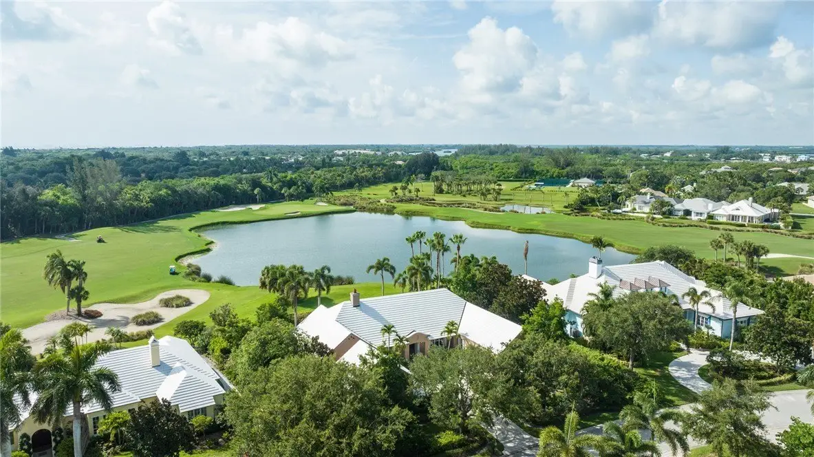 Designed by renowned architect Peter Moor, charming one of a kind 3br/3.5ba golf estate. Custom details include dramatic vaulted ceilings, fireplace, stone flooring, expansive primary suite with luxurious bath and dual walk-in closets. Open great room plan with built-ins, grand eat-in island kitchen. Covered lanai overlooks the large lap pool and lush yard, all situated on one of Orchid Island's best estate size lots with beautiful lake and golf course views. Garaging for 3 cars plus golf cart. Room sizes approximate.