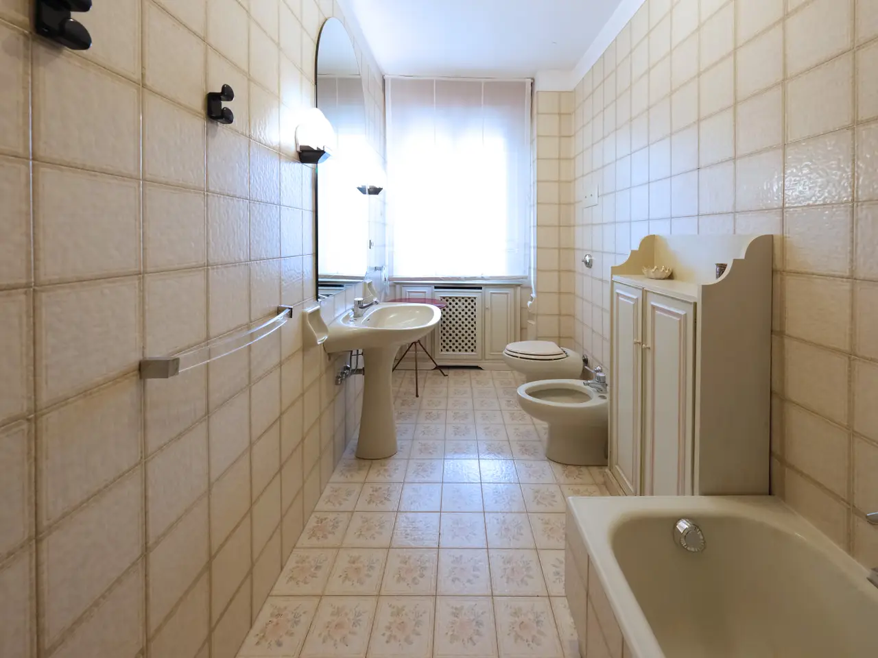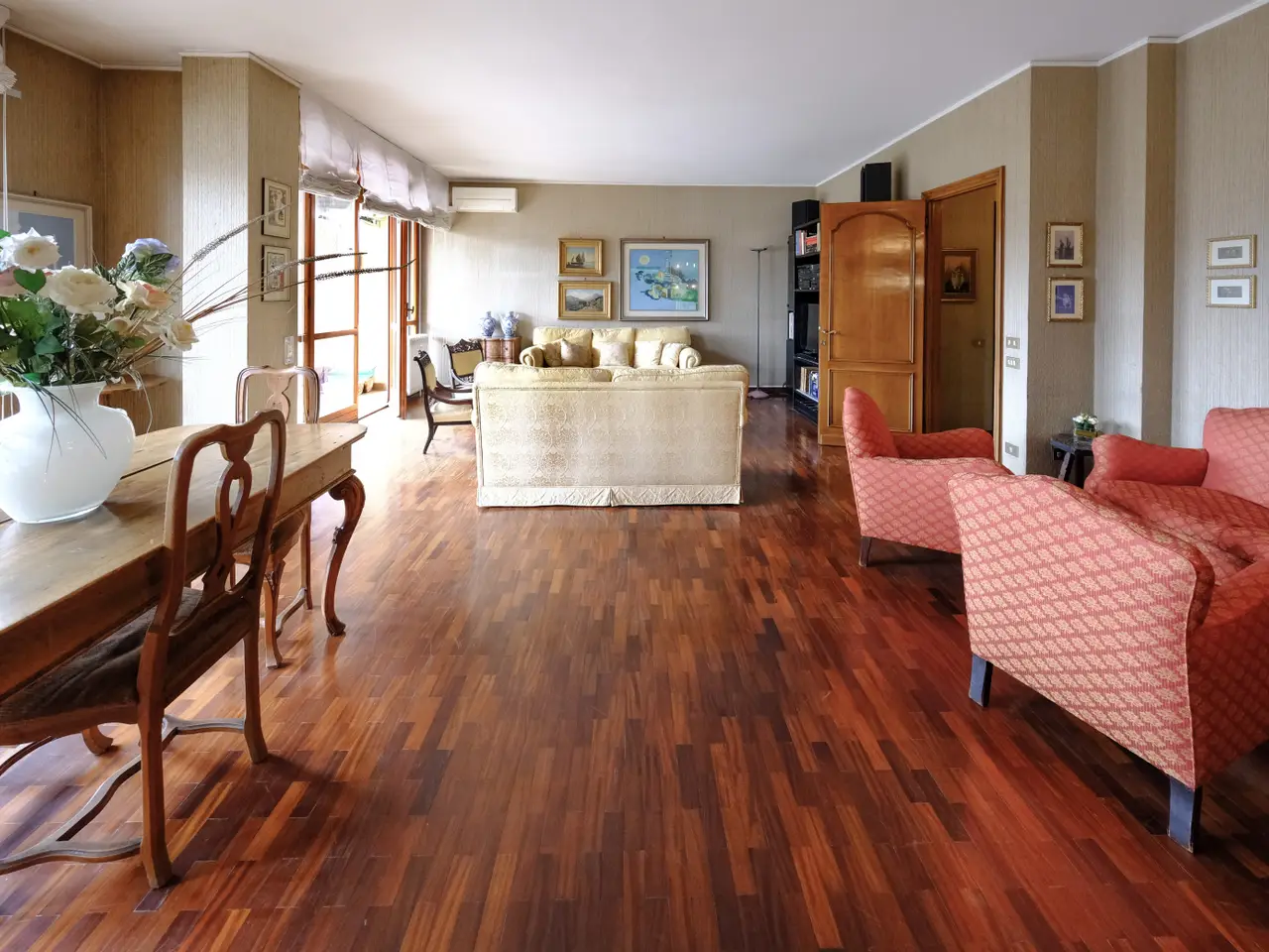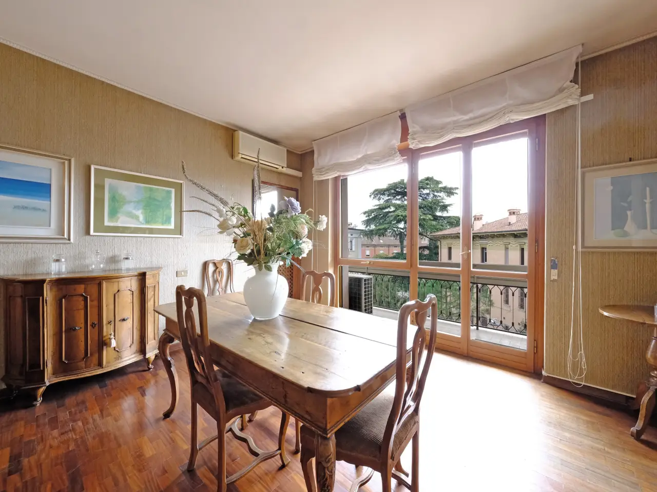 In an elegant and refined condominium context in the exclusive Borgo Trento district, a bright and fantastic apartment of generous dimensions is offered for sale with its terraces and balconies. The property is located in a strategic area being close to the city center and is convenient to all services. The apartment is located in a very suggestive condominium being surrounded by greenery with also a nice private internal parking and is composed of: an entrance hall, a large and bright living room with large terrace, large dining area connected to a large eat-in kitchen with attached laundry / bathroom, a long corridor that houses the wardrobes and a closet, 3 large bedrooms and two bathrooms with windows. The presence of large windows along the perimeter of the house makes it very bright at all hours of the day. A large cellar and a double garage complete the property. The finishes, even if original from the time, are very elegant, alternating parquet floors with marble floors, some shutters are electric, presence of air conditioning and central heating.