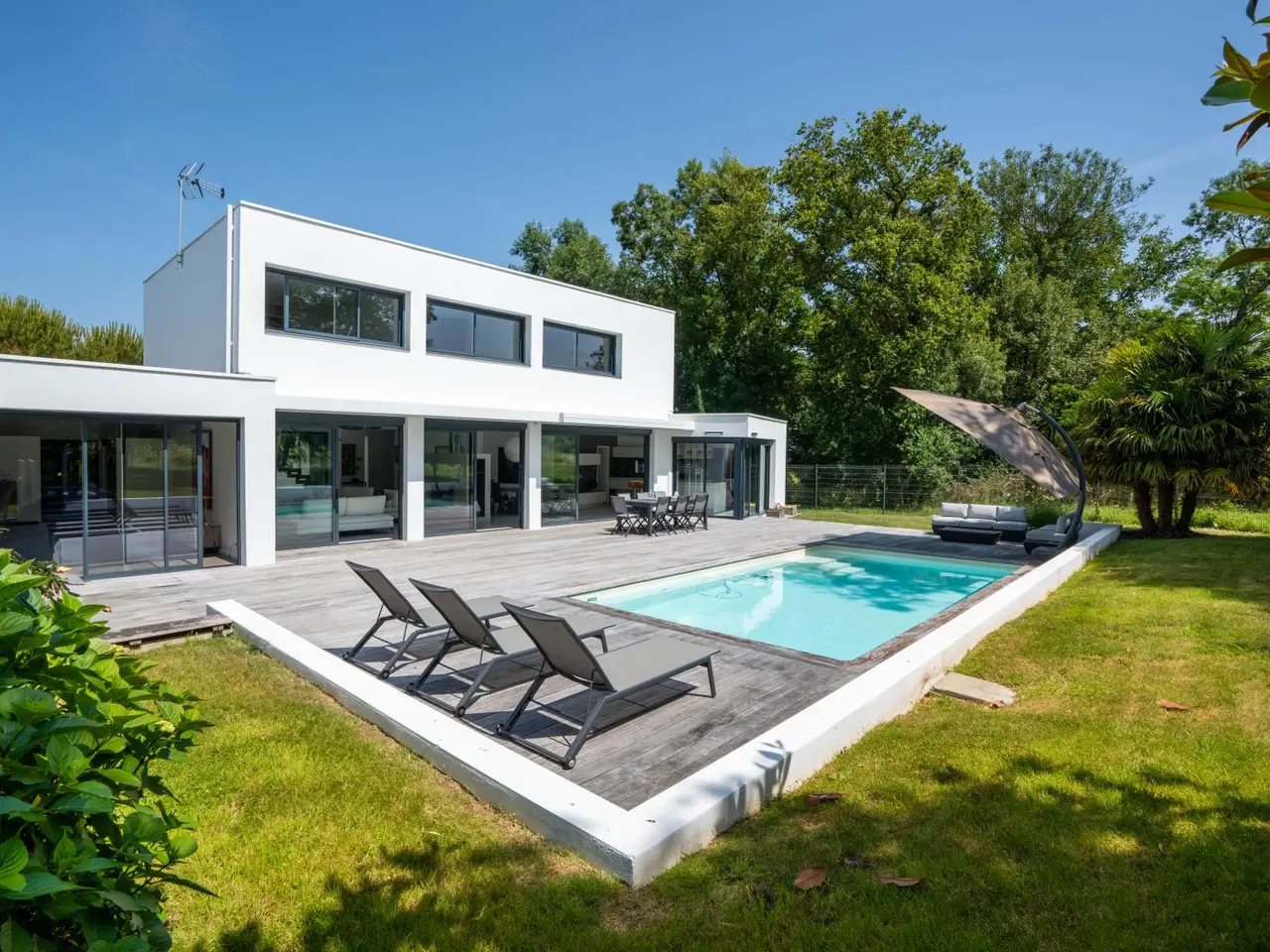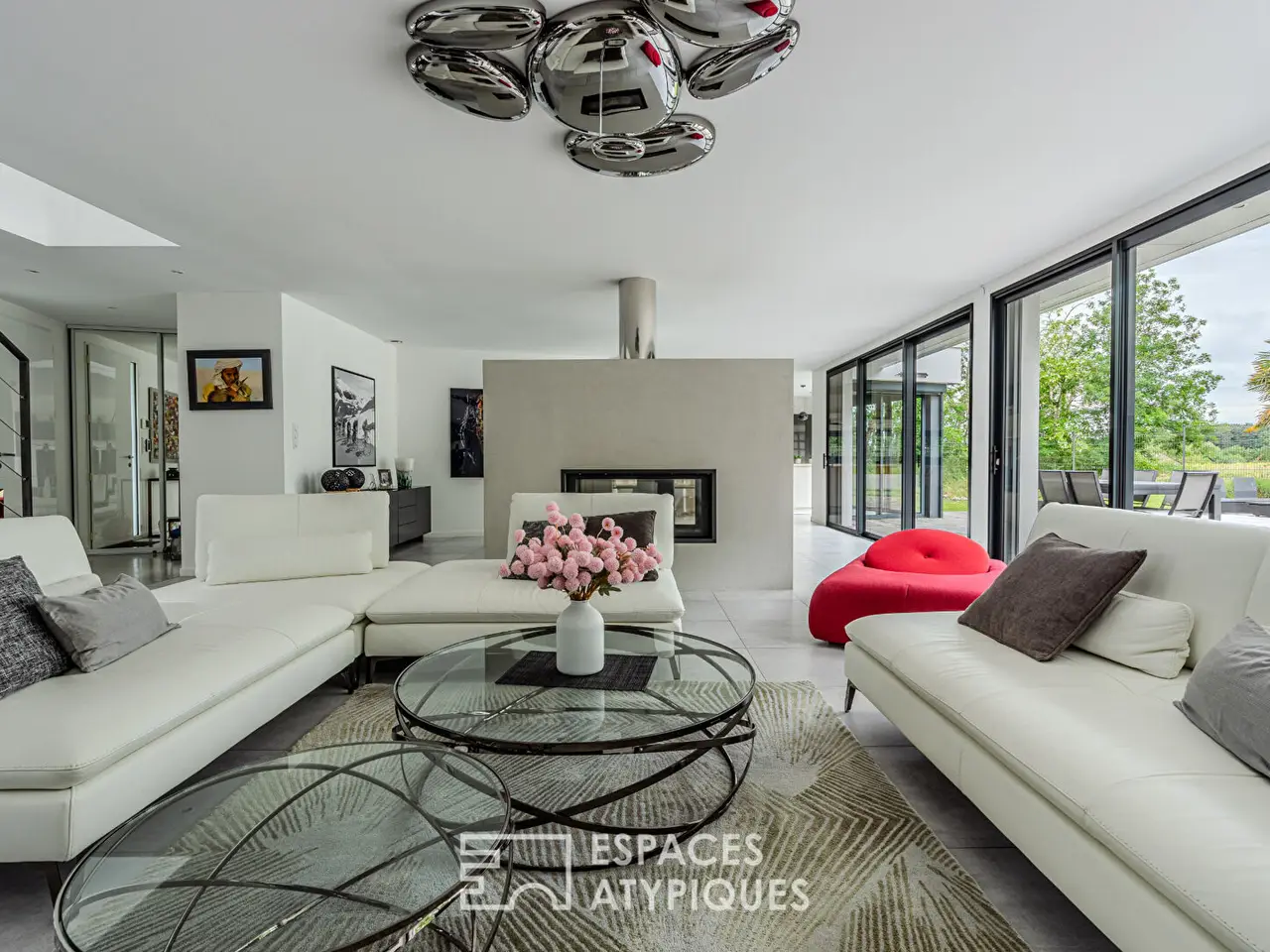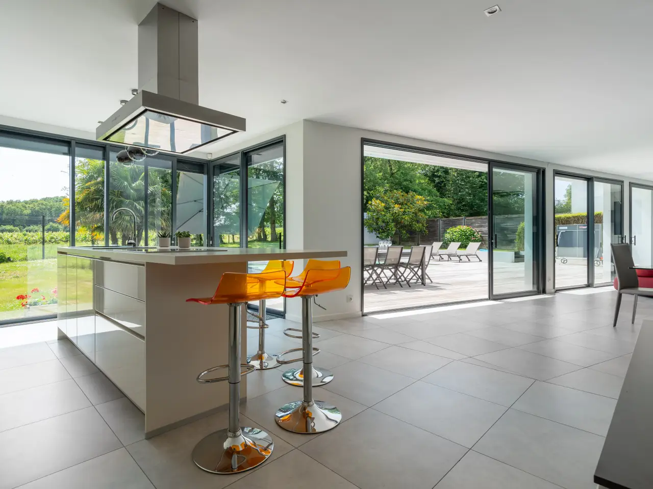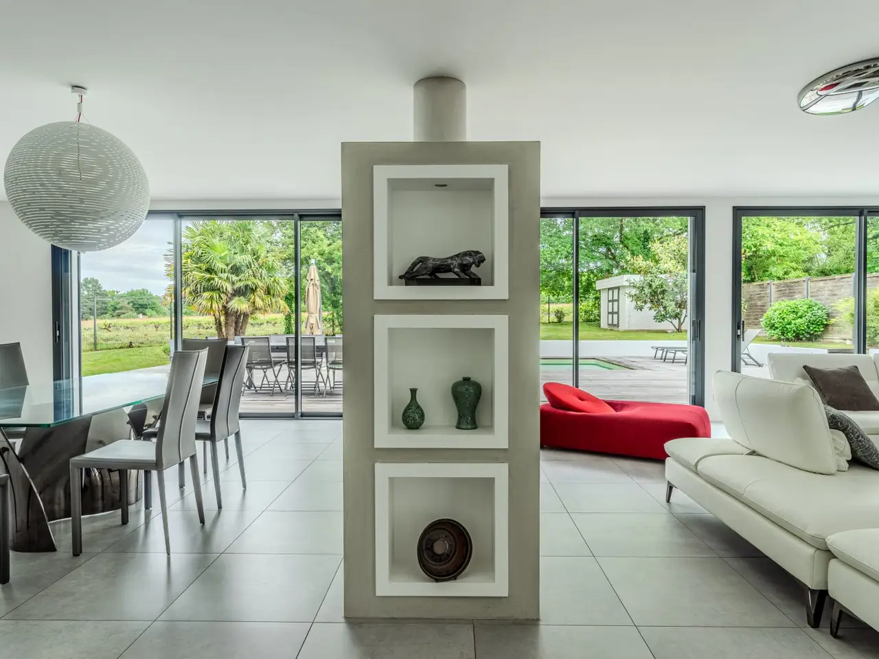On the edge of the vineyard, in a green setting just minutes from the village of Vertou and only 20 minutes from Nantes, this 245 sqm contemporary villa embodies a certain idea of architectural elegance. Entirely designed to interact with nature, it opens generously to the outdoors through large bay windows and offers clean lines, fluid circulation, and selected materials. The living space of nearly 100 sqm deploys a remarkable volume where each zone, living room, dining room, kitchen, finds its place around a central double fireplace. The finishes are neat, the tones soothing, and natural light omnipresent. The open kitchen, with clean lines and high-end equipment, extends into a spacious and fitted scullery, and next to it, a storage space. The complex naturally extends onto a large Ipe terrace that envelops the pool, in a resolutely indoor-outdoor spirit. The landscaped garden, bordered by vines, completes this atmosphere of serenity. The 50 sqm master suite, set back, offers an intimate space with a contemporary bathroom and large fitted dressing room. A separate office, with a separate entrance, completes the single-story living space, ideal for professional use or a dedicated space. Upstairs, a graphic staircase leads to three bedrooms bathed in light with views, as well as a simple and functional bathroom. Double carport, shelter, modern technical services. In the immediate vicinity of schools, daycare and school transport, it offers an ideal living environment, combining calm, design and functional spaces. Information on the risks to which this property is exposed is available on the Georisques website https://www.georisques.gouv.fr Energy class B / Climate class A, Estimated average amount of annual energy expenditure for standard use, Average energy prices indexed on January 1, 2021: between EUR1,270 and EUR1,780 per year. REF. 2579 Additional information * 8 rooms * 5 bedrooms * 2 shower rooms * Outdoor space : 1260 SQM * Parking : 4 parking spaces * Property tax : 2 800 € Energy Performance Certificate Primary energy consumption b : 96 kWh/m2.year High performance housing