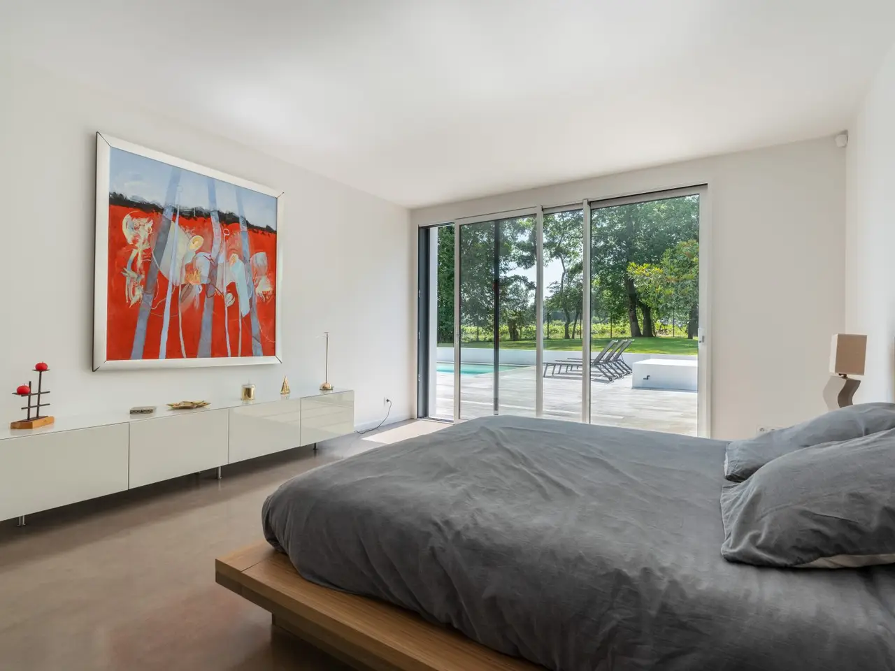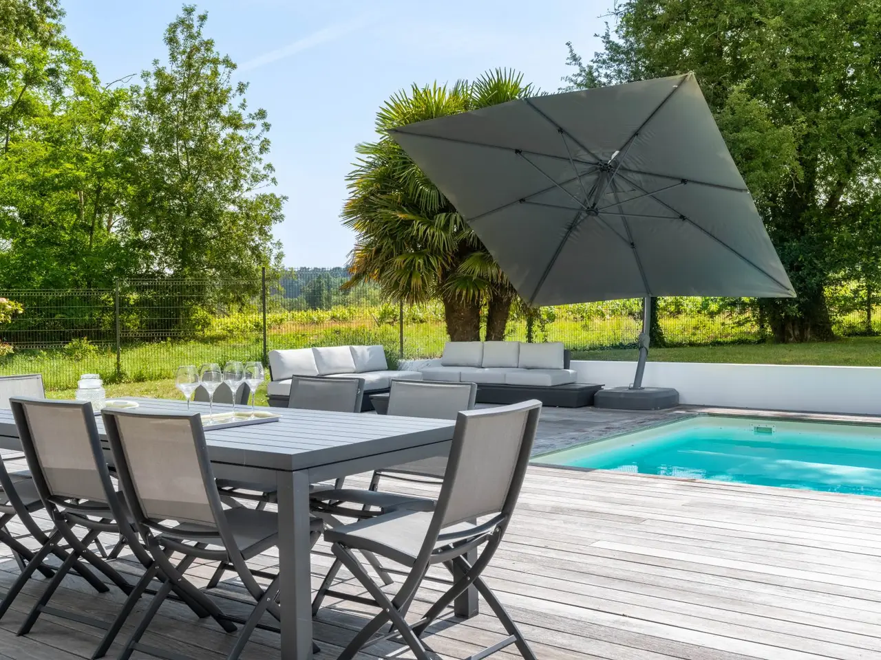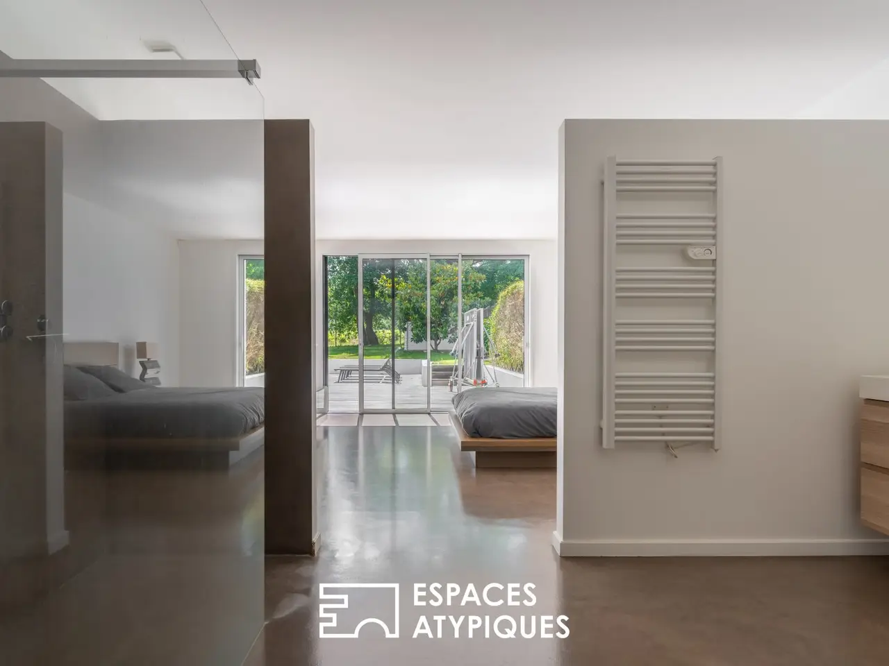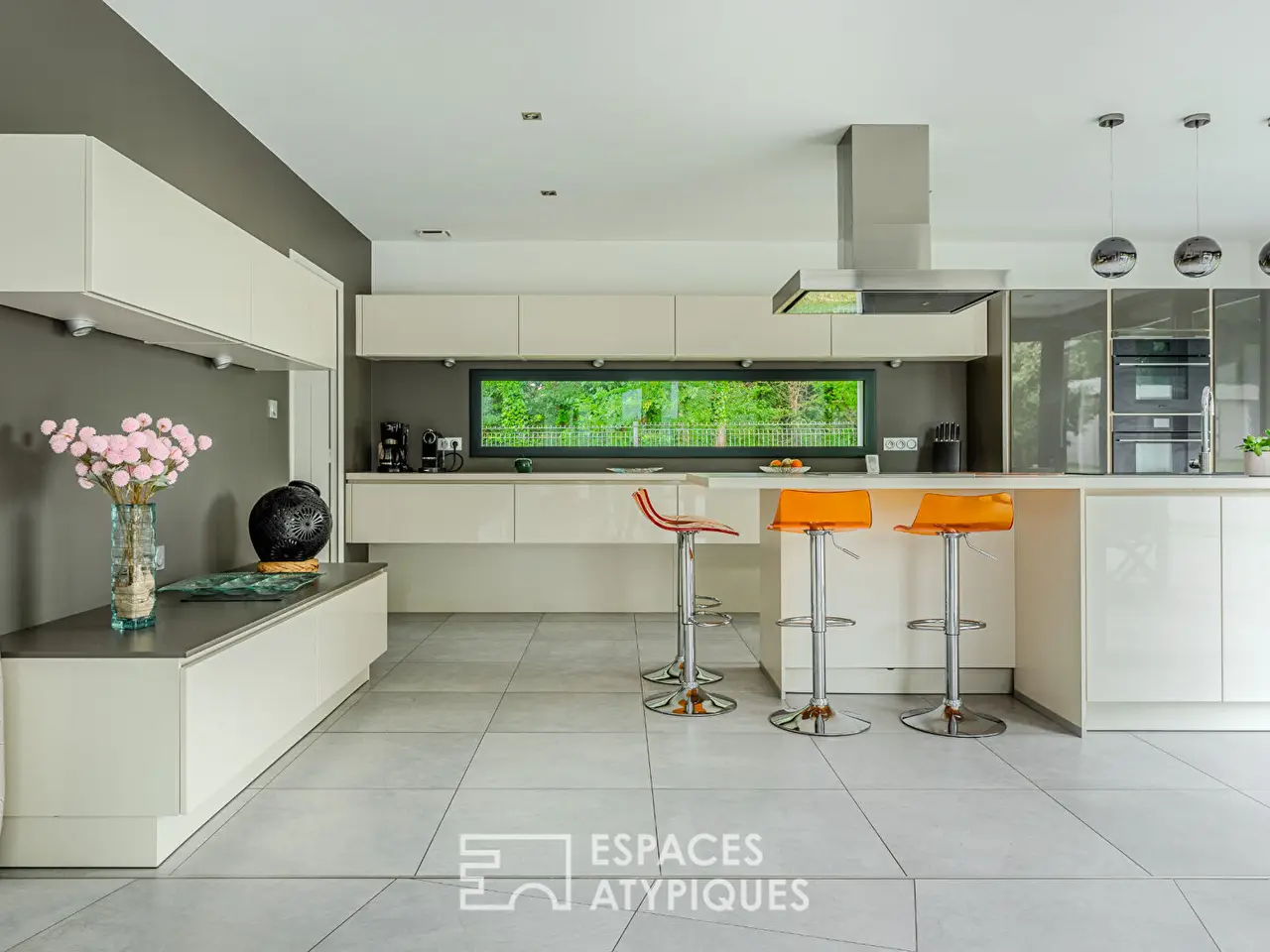 On the edge of the vineyard, in a green setting just minutes from the village of Vertou and only 20 minutes from Nantes, this 245 sqm contemporary villa embodies a certain idea of architectural elegance. Entirely designed to interact with nature, it opens generously to the outdoors through large bay windows and offers clean lines, fluid circulation, and selected materials. The living space of nearly 100 sqm deploys a remarkable volume where each zone, living room, dining room, kitchen, finds its place around a central double fireplace. The finishes are neat, the tones soothing, and natural light omnipresent. The open kitchen, with clean lines and high-end equipment, extends into a spacious and fitted scullery, and next to it, a storage space. The complex naturally extends onto a large Ipe terrace that envelops the pool, in a resolutely indoor-outdoor spirit. The landscaped garden, bordered by vines, completes this atmosphere of serenity. The 50 sqm master suite, set back, offers an intimate space with a contemporary bathroom and large fitted dressing room. A separate office, with a separate entrance, completes the single-story living space, ideal for professional use or a dedicated space. Upstairs, a graphic staircase leads to three bedrooms bathed in light with views, as well as a simple and functional bathroom. Double carport, shelter, modern technical services. In the immediate vicinity of schools, daycare and school transport, it offers an ideal living environment, combining calm, design and functional spaces. Information on the risks to which this property is exposed is available on the Georisques website https://www.georisques.gouv.fr Energy class B / Climate class A, Estimated average amount of annual energy expenditure for standard use, Average energy prices indexed on January 1, 2021: between EUR1,270 and EUR1,780 per year. REF. 2579 Additional information * 8 rooms * 5 bedrooms * 2 shower rooms * Outdoor space : 1260 SQM * Parking : 4 parking spaces * Property tax : 2 800 € Energy Performance Certificate Primary energy consumption b : 96 kWh/m2.year High performance housing