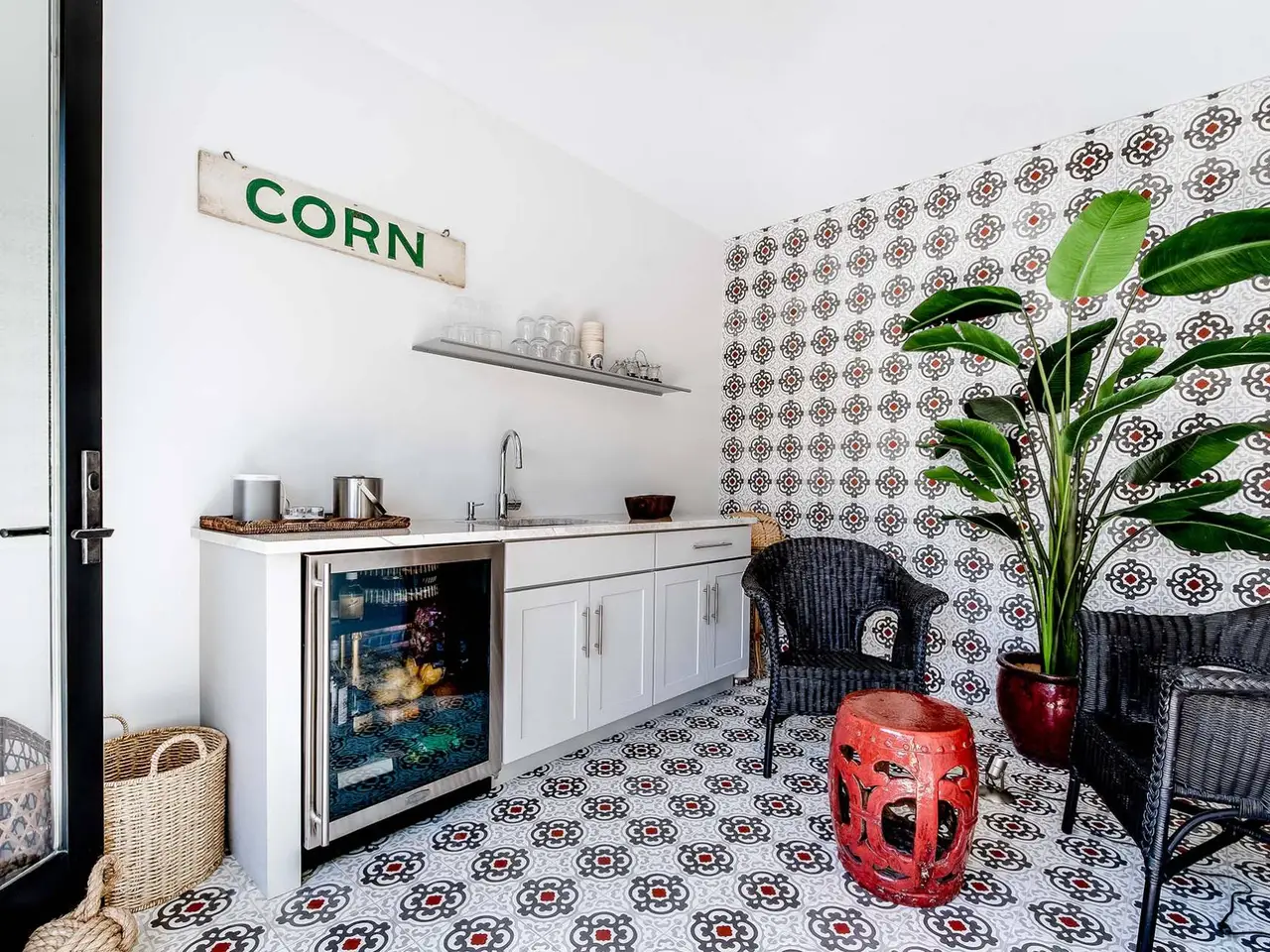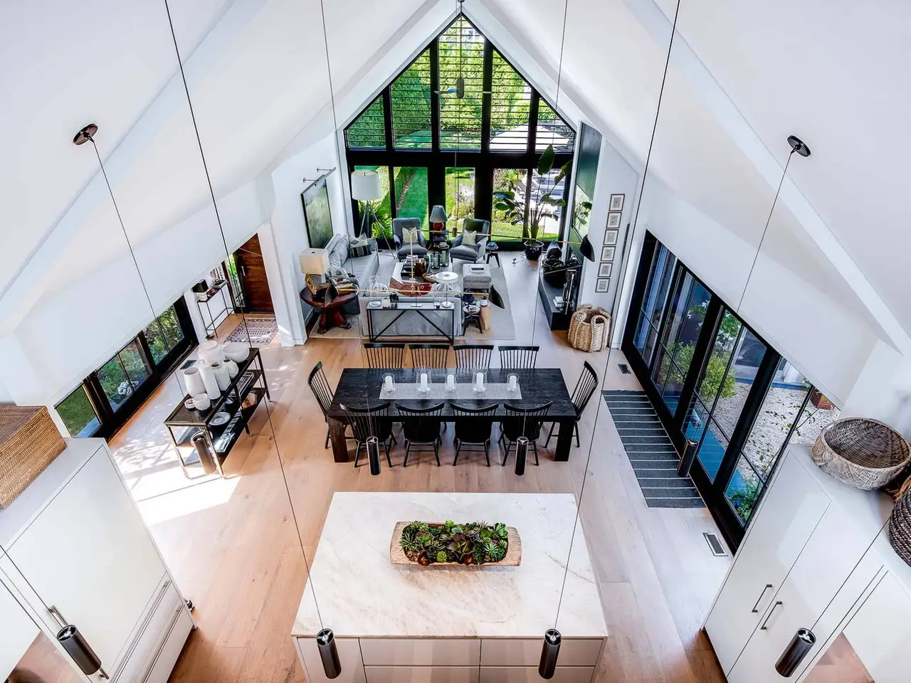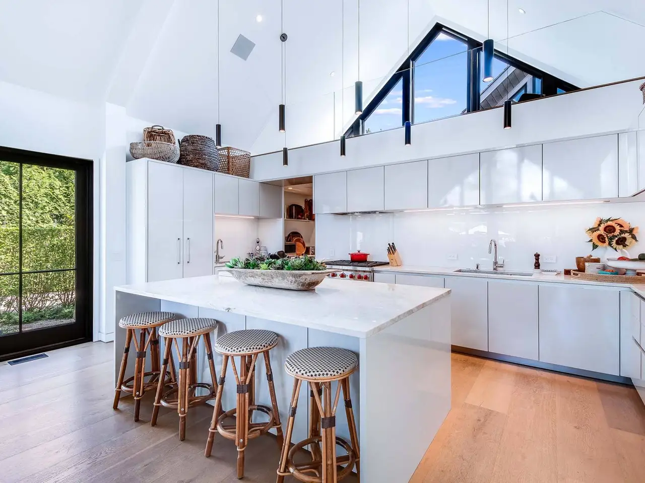 This ultra-chic new construction is pleasing from every angle. High-end finishes, sleek, top of the line everything, in this now 5 bedroom, 4.5 bathroom beach house. The oversized central living space is stunning, with high cathedral ceilings and walls of glass on three sides. Sparkling Sub Zero/Wolf kitchen with wine fridge, natural stone counters, and custom glass backsplash. Added amenities include a screened-in sunroom and a fully equipped gym. All bathrooms feature walk-in showers, Grohe fixtures and Toto toilets. Beautifully landscaped grounds host a large stone patio, a heated gunite pool, pool house, and two outdoor showers, one conveniently located next to the Primary Bedroom, the other closer to the pool. Nicely proportioned half-acre lot, with electronic gate and privacy hedges; convenient to all in the heart of East Hampton Village.