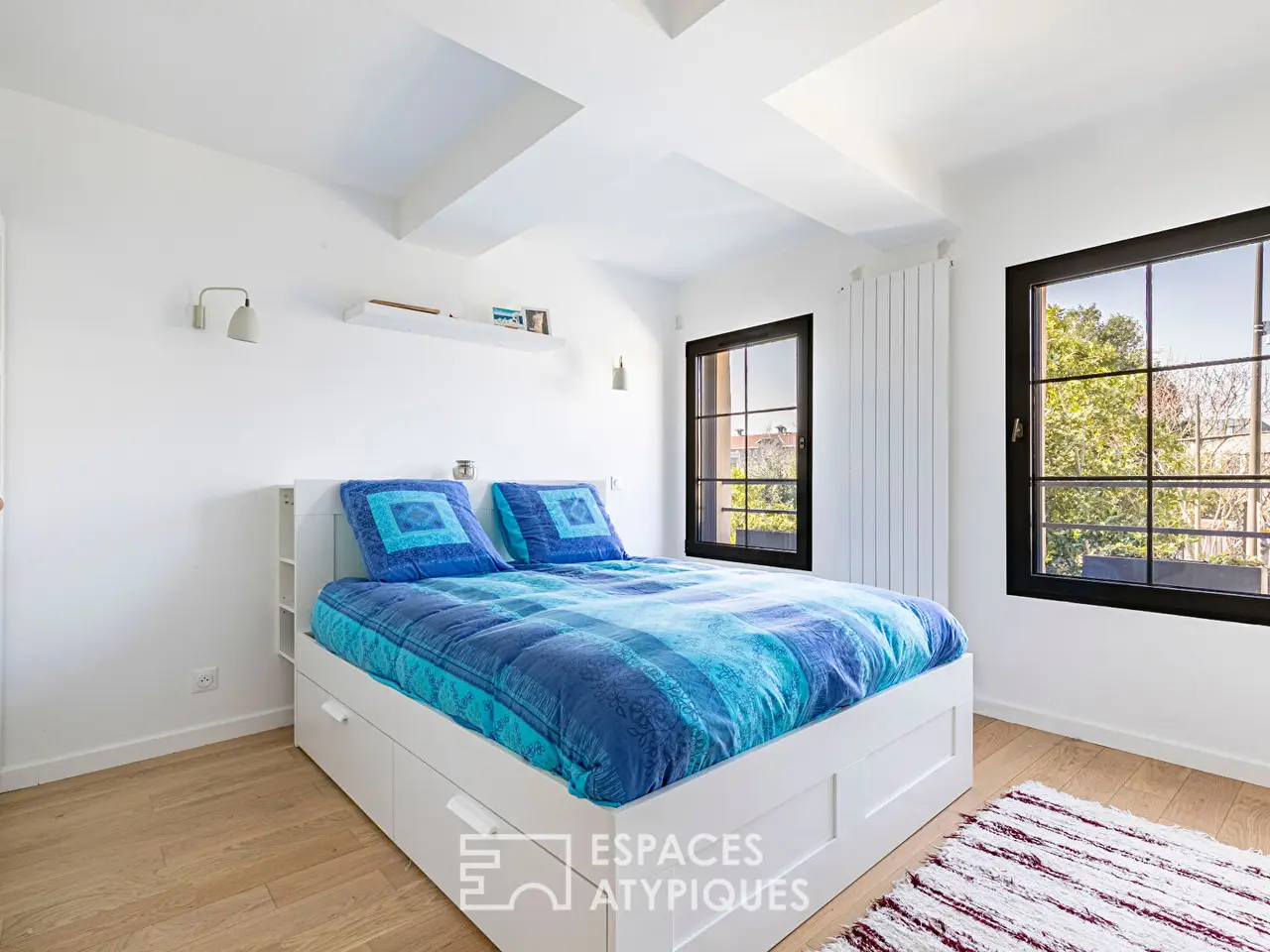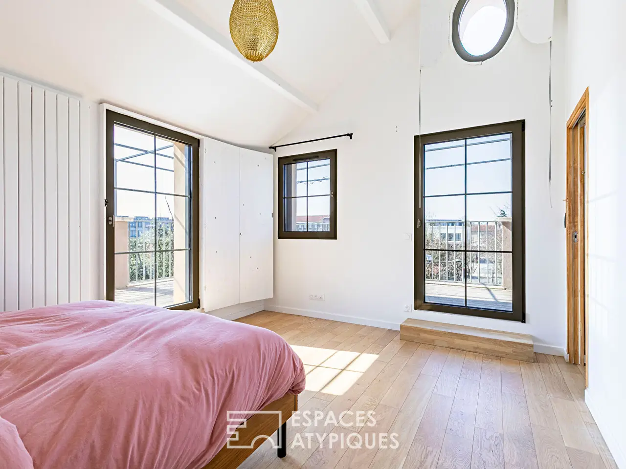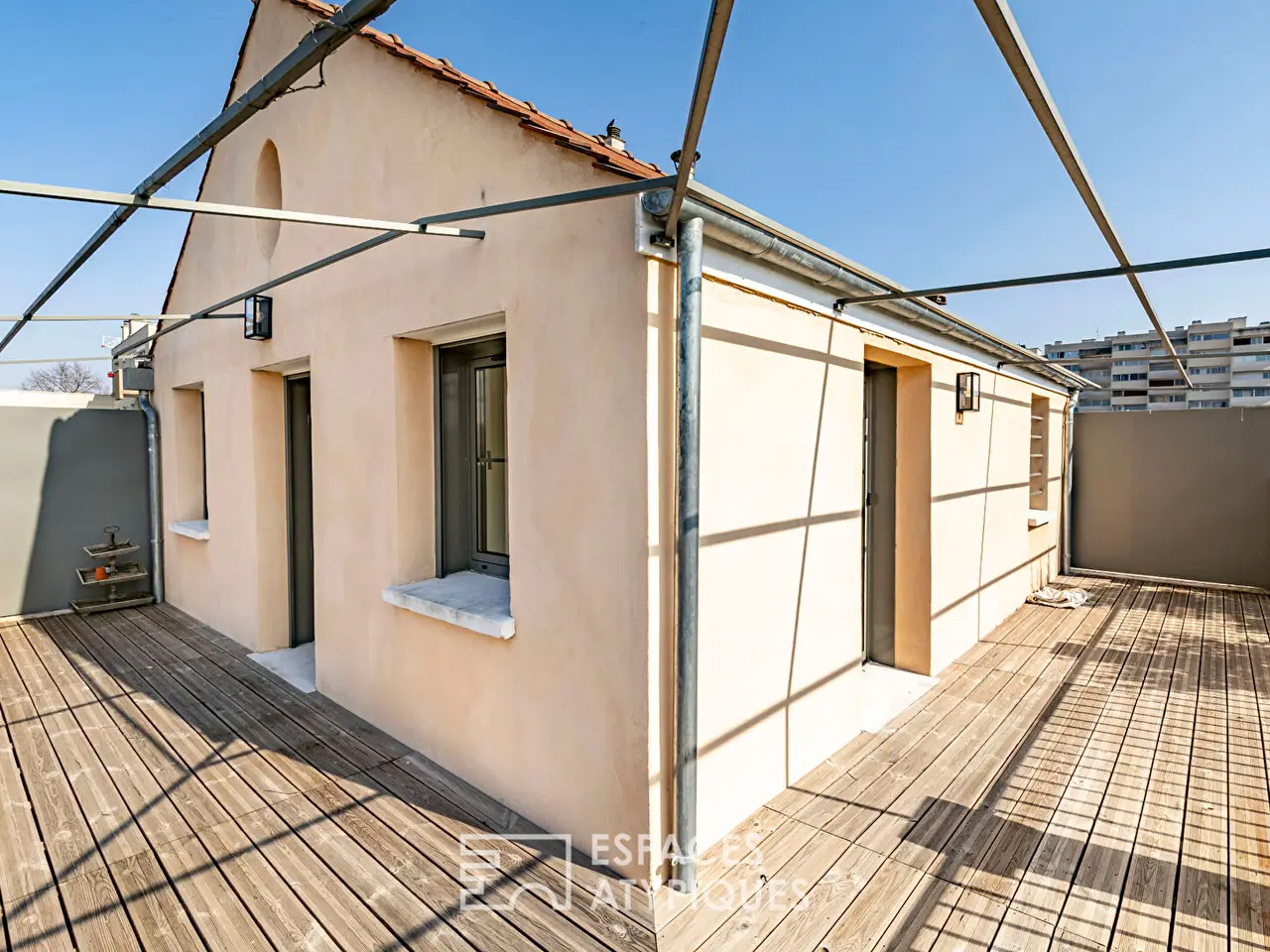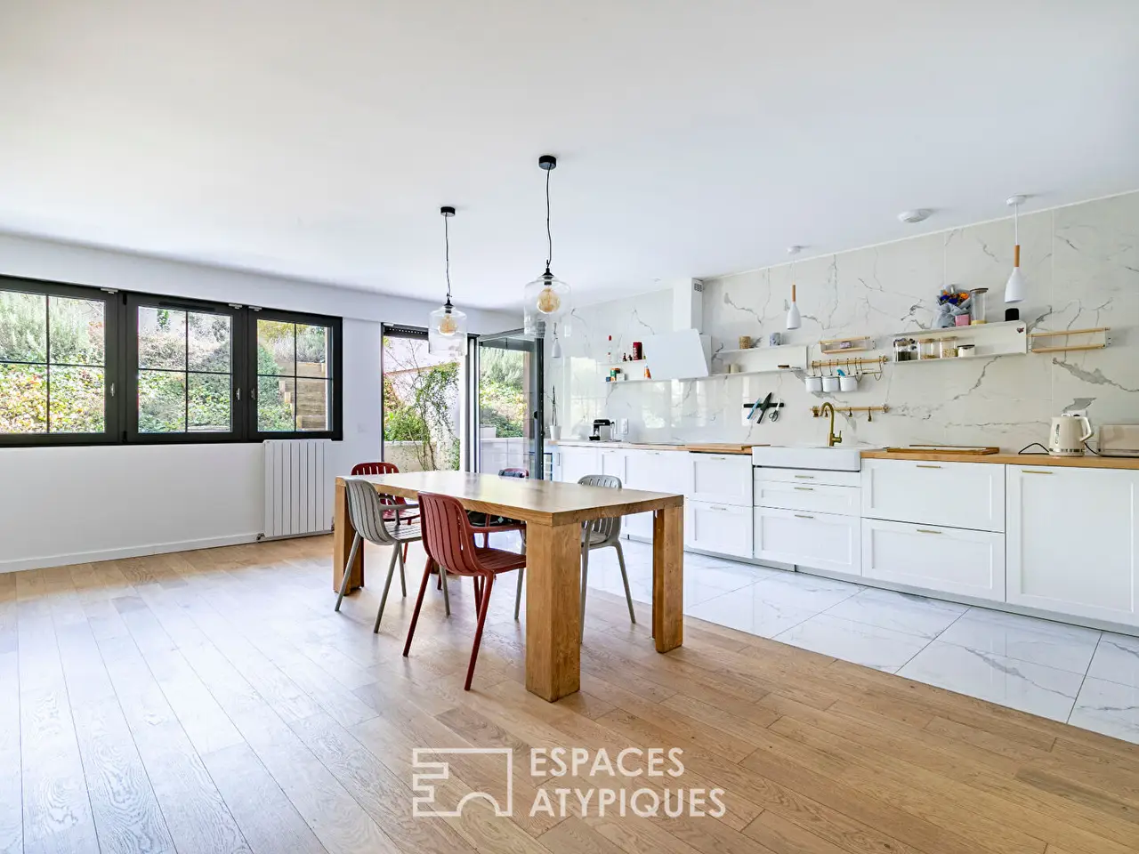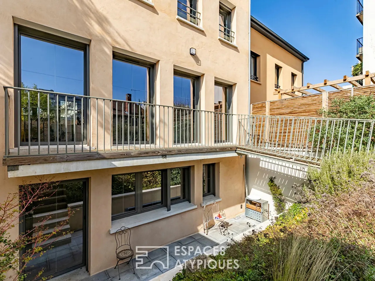 Close to the city center and just a 5-minute walk from the Paul Vaillant-Couturier metro station (Line 7), this house by a visionary bio-climatic architect developing around 207m2 of living space is built on a 180m2 plot. Once through the gate, the entrance allows direct access to the main living room facing East-West totaling approximately 50m2 and having a cloakroom. The lower level hosts a large dining kitchen of 40m2 fully fitted and equipped and opening onto a terrace from which it will be pleasant to share rich convivial moments with family or friends. A lavatory and a technical room that can be used as a saddler complete this level. The first floor accessible by the main staircase of this house consists of 4 bright bedrooms, a bathroom and a separate toilet. On the 2nd and last floor, the vast master suite of 16m2 with a dressing room, a bathroom and a toilet room offers an unobstructed view of the surrounding green spaces and has a fitted terrace facing south-west. This bright place out of time is conducive to reading and rest. The dry garden of this bio-climatic house with extraordinary energy performance has been designed to provide a pleasant and rational outdoor space requiring little maintenance. It is also accessible from the main living room and from the kitchen via a staircase and a walkway made of wood and metal with the most beautiful effect, giving this house a unique architectural signature. The outdoor space facing west and located at the front of this house allows you to park a vehicle in a secure way and also offers the possibility of enjoying the sun from the ground floor. Small town bordering Paris, Villejuif has, in places, the look of a village. Positioned between the Seine and Bievre valleys, on the Longboyau plateau, the town is the highest point in the Val de Marne department. Its local shops, its transport (Metro and RER) as well as its education centers (primary, secondary and higher education) make it a popular city where life is good. Metro: 5 minutes on foot Schools: 2 minutes on foot Shops: 7 minutes on foot REF. 10247 Additional information * 7 rooms * 5 bedrooms * 1 bathroom * 1 bathroom * 2 floors in the building * Outdoor space : 180 SQM * Parking : 1 parking space Energy Performance Certificate Primary energy consumption a : 41 kWh/m2.an High performance housing