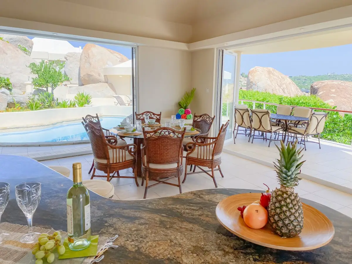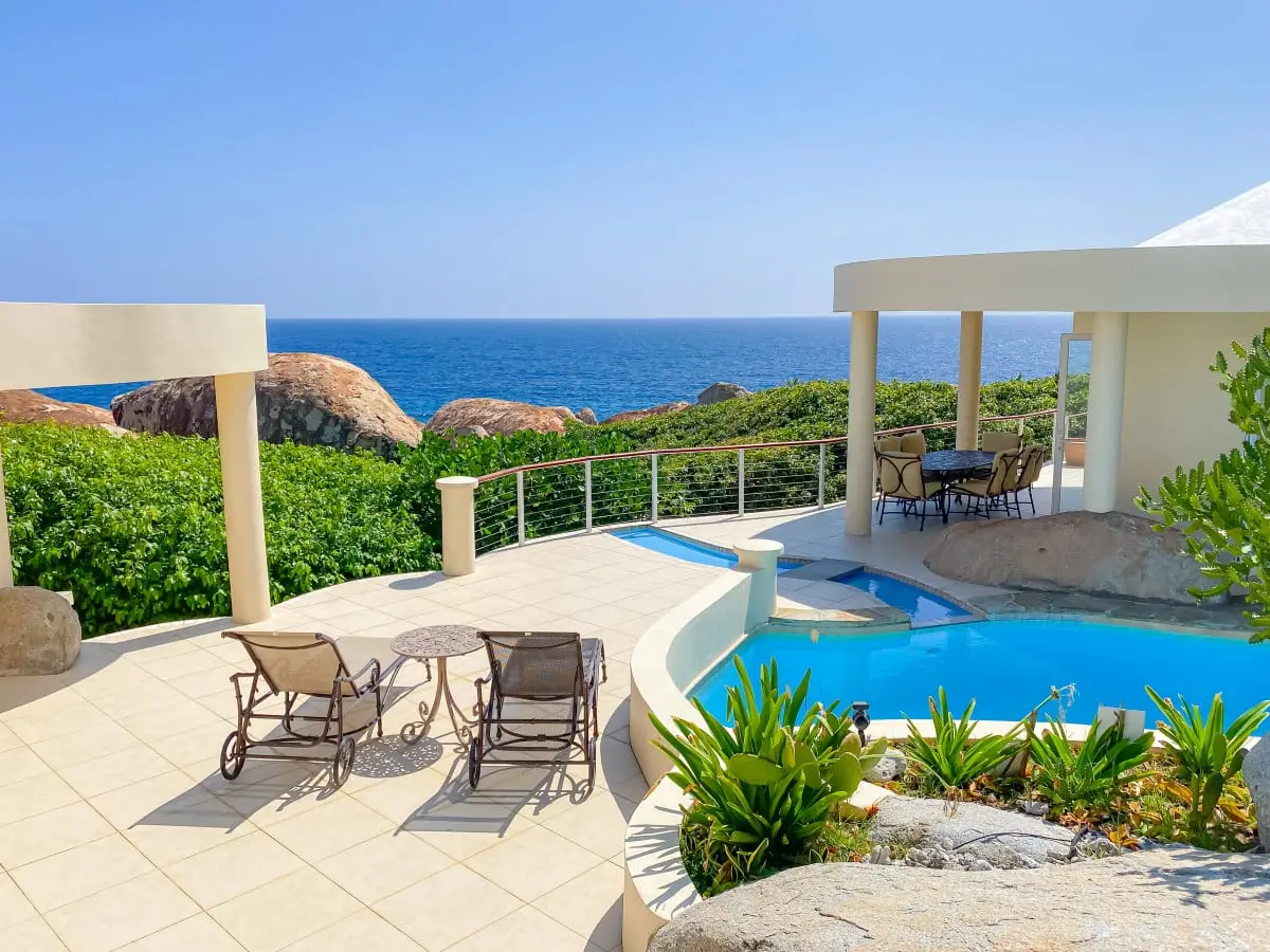 <strong>REDUCED FROM 4.5 MILLION </strong>Water's Edge was constructed in the heart of one of nature's great wonders. Located among the giant granite boulder fields of Virgin Gorda, this is a contemporary Caribbean fantasy home. It lies close to the World famous “Baths” National Park, but in a secluded, quiet and private estate. Any new owner of this unique home will enjoy sharing both the spectacular natural scenery whilst relaxing in deluxe accommodations, in a one-of-a-kind setting for one of the most extraordinary experiences in the BVI.<br /> <br /> Water's Edge was designed so that construction of the house would live in harmony with the natural environment and not distract from the location's spectacular beauty. Tucked away in a cavernous area, the exterior garden walls enclose the villa and you enter through Brazilian hardwood doors to discover the treasurers beyond.<br /> <br /> Once inside, an instant sense of awe is felt as the home is designed around a collection of huge volcanic boulders. The sensation of tranquility is instant as the panoramas of the Caribbean Ocean lure the eyes to embrace the turquoise waters. Water's Edge is uniquely connected with outdoor living as all three of the property's buildings have been constructed to fit amongst the granite rocks. Cream coloured exteriors with white peaked-roofs and orange clay tiles provide soft tones to contrast against the vibrant scenery. Large folding glass doors and picture windows frame the unhindered views while enabling a refreshing breeze to travel throughout the indoor living spaces. The patio and deck afford plenty of space featuring an outside bar area equipped with power points and a spot for an extra fridge. In addition to various hidden spaces for stargazing and sun lounging, when it's time to cool off, the 24ft pool with its unique little river and footbridge are a blessing for a refreshing dip.<br /> <br /> The home is a blank canvas waiting for the personal touches of its new owners to be implemented into the design, furnishings, and decor. The first building contains the kitchen and dining area, with state-of-the-art cooking facilities, sparkling tortoise shell granite countertops and custom wooden cabinetry. This great room offers an ocean view and is flooded by natural light from the floor length folding glass doors, which open to the outer decks. In addition to the luxury, fully equipped kitchen, a central island in the cooking area comprises bar stools and an additional small sink and station for preparing cocktails. A wine fridge compliments the open space where you can serve and entertain your guests relaxing on a unique built-in stone sofa. An expansive pantry with additional kitchen prep area links the great room to the indoor and outdoor shower, bath and laundry areas which are all accessible for pool use.<br /> <br /> From the second building, the expansive windows deliver a dramatic view of the ocean. This room was intended as the main indoor living area, and the design possibilities are endless for any new owner to craft the room with the comforts and amenities they desire. Currently this room doubles as another bedroom with access to the pool bath.<br /> <br /> The third building holds two and a half bedrooms. Both main bedrooms have direct patio access where a plunge pool is situated, while offering seclusion between the boulders and views looking out to sea. Both bedrooms contain king-sized beds, en-suite bathrooms featuring a powder areas for makeup, double sinks, and gorgeous outdoor showers constructed between the boulders. One of the bedrooms is also fitted with a small kitchenette behind double wooden doors and a pass through window, giving the owners a private place for breakfast and other meals if not wanting to use the main kitchen. The eating space is nestled under a covered patio between the bedrooms. The views are spectacular from all areas. This home brings in substantial revenue as a short-term rental.<br /> <br /> This home is perfect for anyone who enjoys entertaining.<br /> <h3>Water's Edge Virtual Tour on Virgin Gorda, British Virgin Islands</h3><br /> <iframe src="https://my.matterport.com/show/?m=yzR6dVx8Puu" width="853" height="480" frameborder="0" allowfullscreen="allowfullscreen"></iframe><br /> <h3>Water's Edge Sun Room Virtual Tour on Virgin Gorda, British Virgin Islands</h3><br /> <iframe src="https://my.matterport.com/show/?m=Hofv3m4QzBW" width="853" height="480" frameborder="0" allowfullscreen="allowfullscreen"></iframe><br /> <h3>Water's Edge Guest Villa Virtual Tour on Virgin Gorda, British Virgin Islands</h3><br /> <iframe src="https://my.matterport.com/show/?m=oEyW842sgRV" width="853" height="480" frameborder="0" allowfullscreen="allowfullscreen"></iframe><br /> <br />