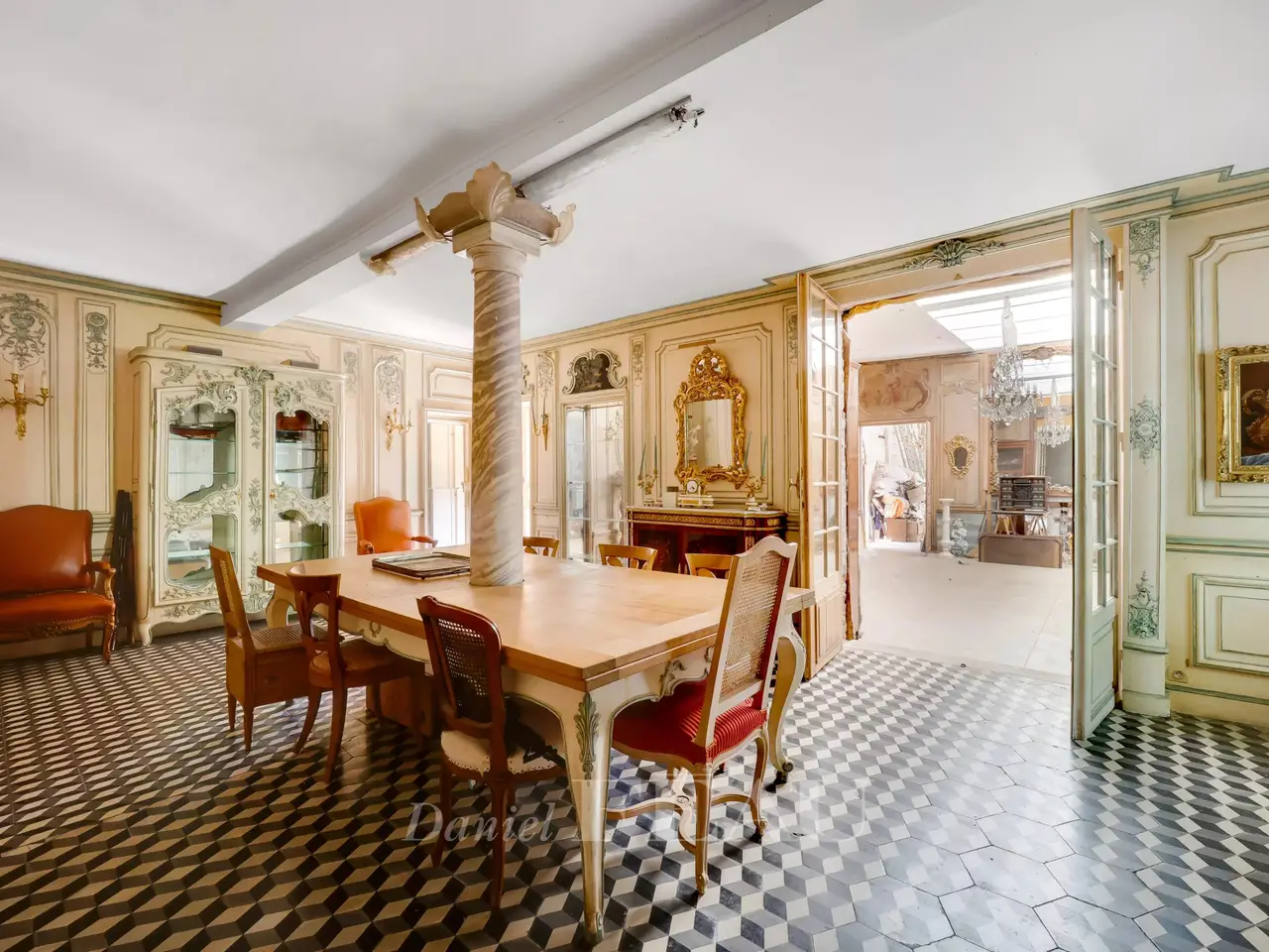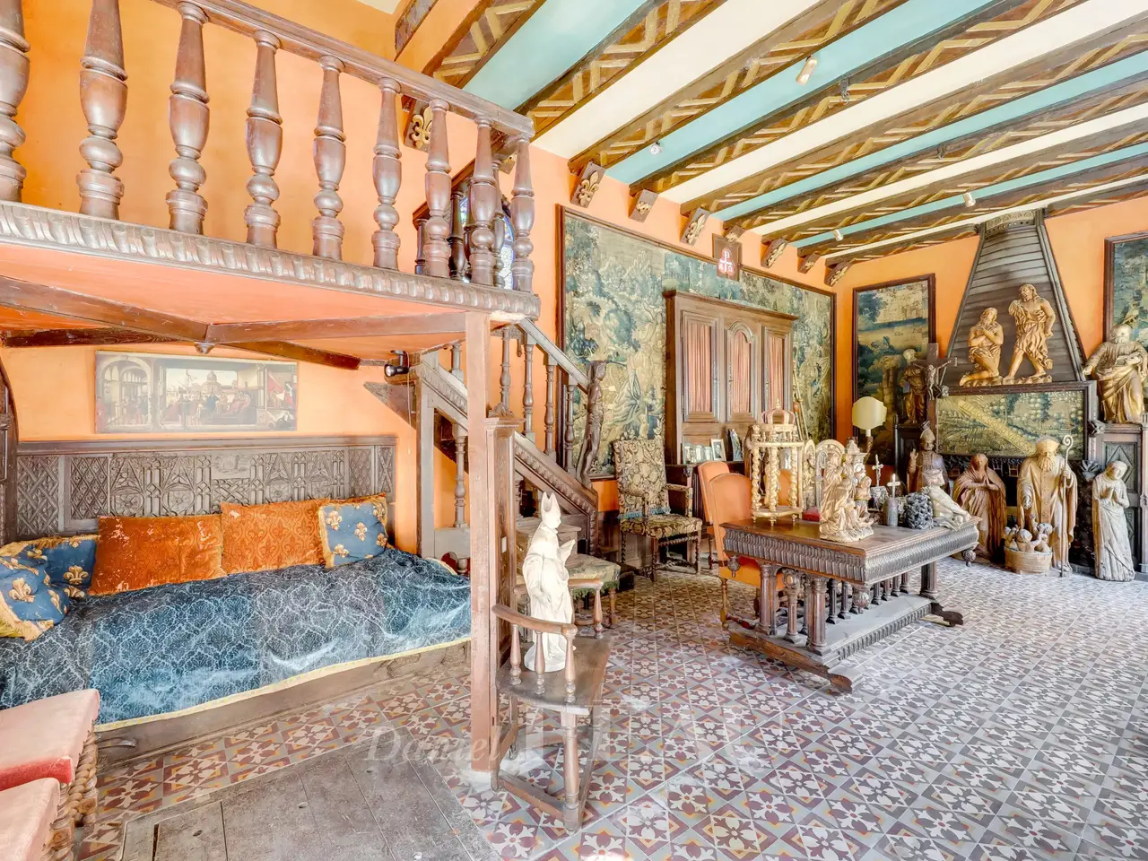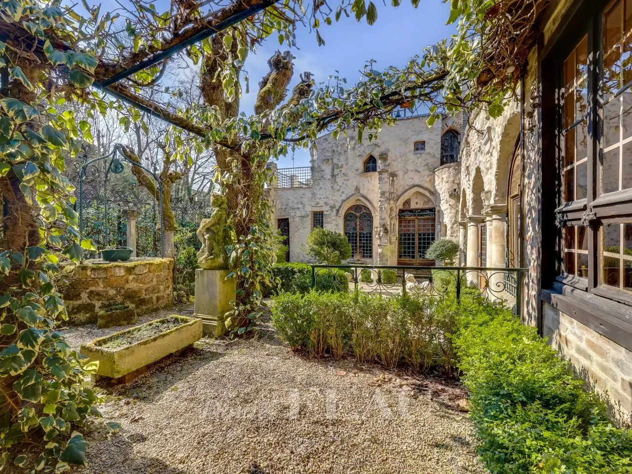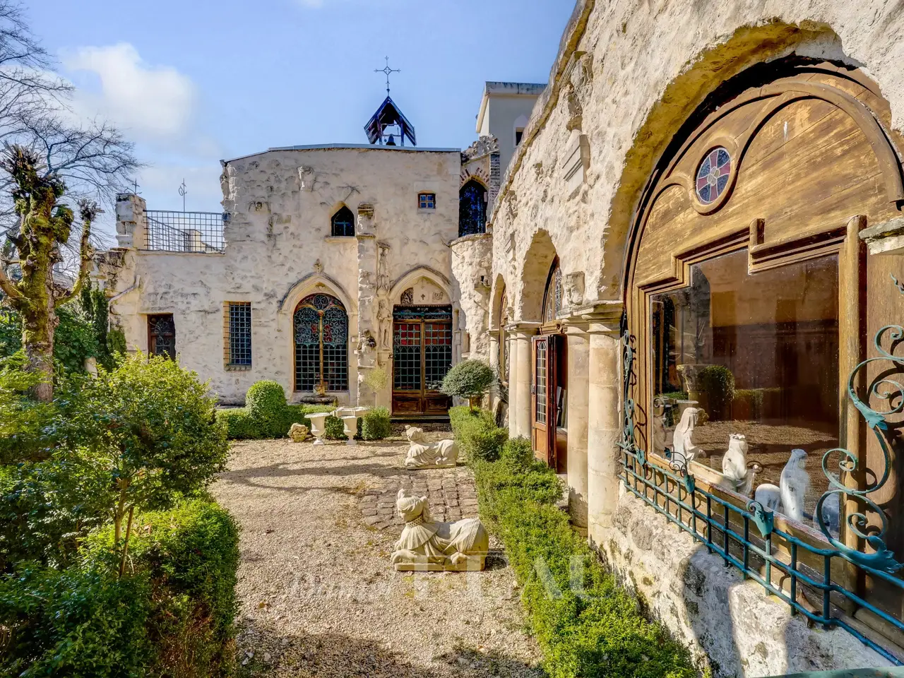This unique property in the centre of Viroflay was built in 1883 for a renowned family from Versailles in a totally unique architectural style. Set in a 500 sqm plot, it offers over 400 sqm of living space including a living/reception room, a dining room, a kitchen, four bedrooms, and a bathroom/wc. Further convertible living space is currently used for storage. Among remarkable features are a cloister, a gothic-style chapel with stained glass, and a courtyard with a well surrounded by superb wrought-iron railings. Renovation is required. In a convenient location near the stations, in walking distance of convenience stores and the shops, 4 minutes from Fausses Reposes State Forest, and benefiting from easy A13, A86 and N118 road access.