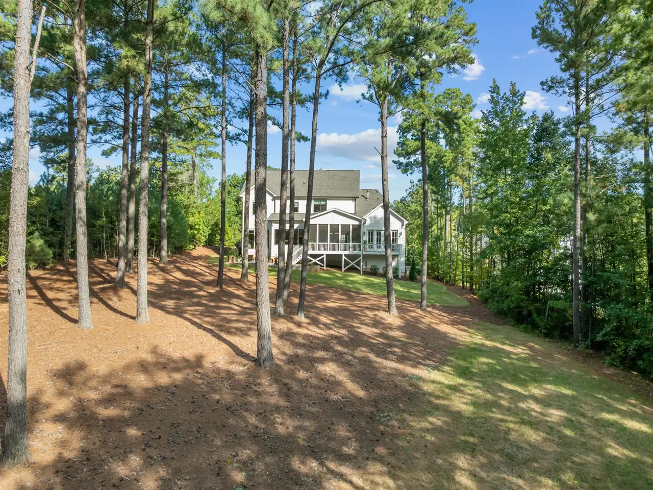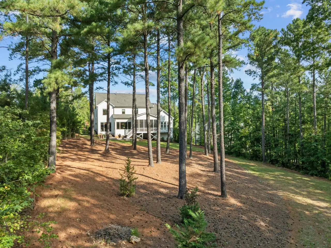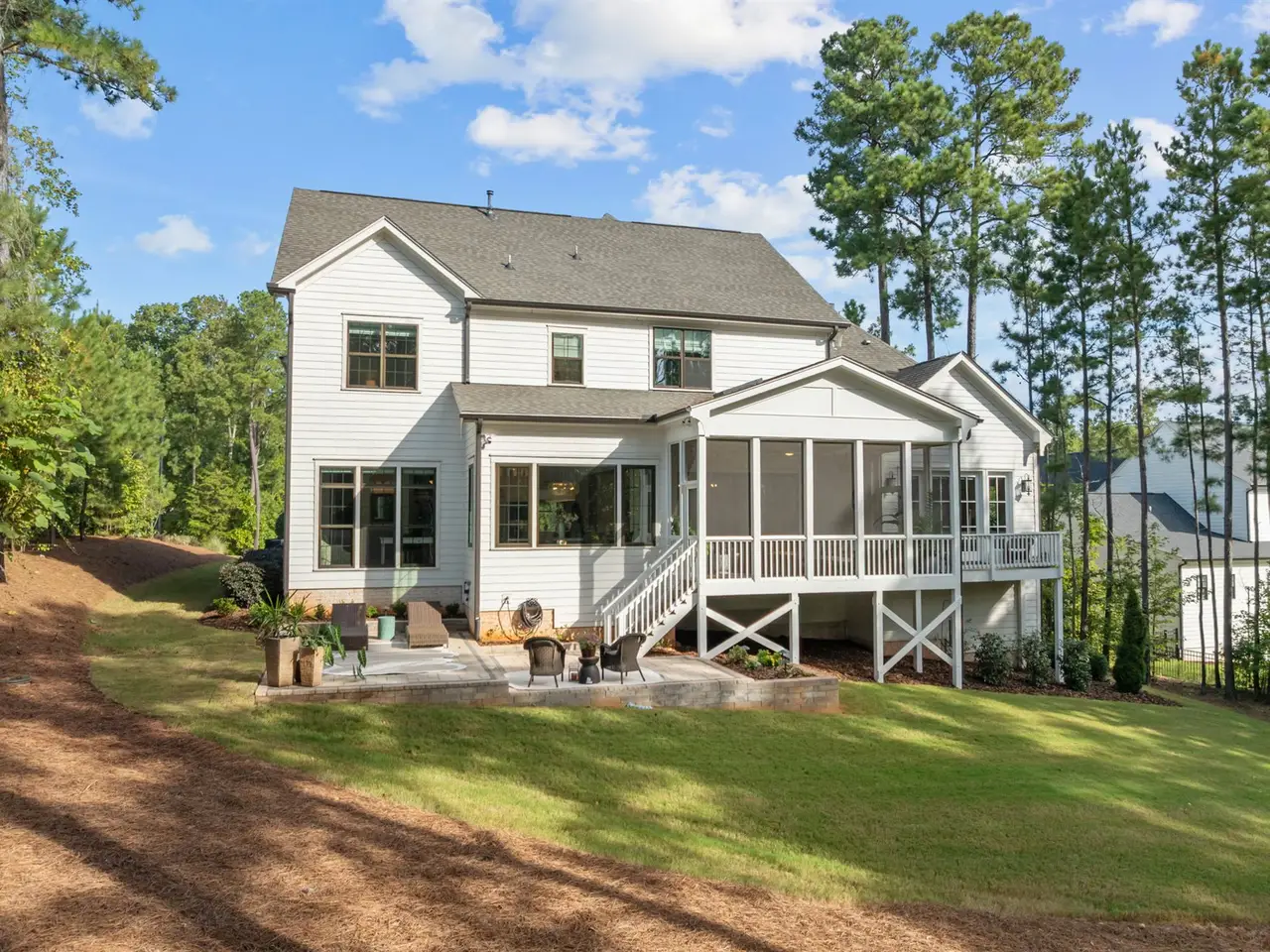 Southern charm meets modern luxury in this stunning home on a spacious 1.29-acre lot! From the moment you enter, you'll appreciate the hardwood floors throughout (Tile in baths) and custom finishes. The open-concept family room flows seamlessly into a gourmet kitchen featuring a large center island, quartz countertops, an impressive walk-in pantry, and a gas range-perfect for everyday living and entertaining. 1st floor office (can easily be used as guest suite) has walk-in closet and private full Bath. Enjoy the tranquil screened porch overlooking the expansive backyard with brand new patio. The main-level primary bedroom is a true retreat with vaulted ceilings accented by wood beams, private balcony, a spa-like bathroom with a walk-in shower, soaking tub, dual vanities, and a spacious walk-in closet with a convenient stackable washer/dryer hookup. Upstairs offers 3 additional bedrooms, 2 full baths (ensuite and jack and jill), a generous bonus room, gym, second laundry area, and two walk-in attic spaces for ample storage. The oversized 3 car garage completes the package. Located approximately one mile to Falls Lake and minutes to restaurants, shops-this home offers both convenience and serenity!