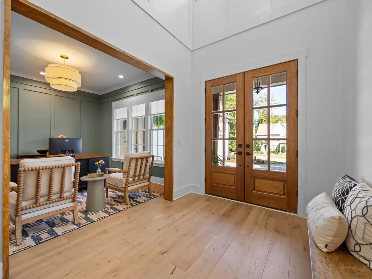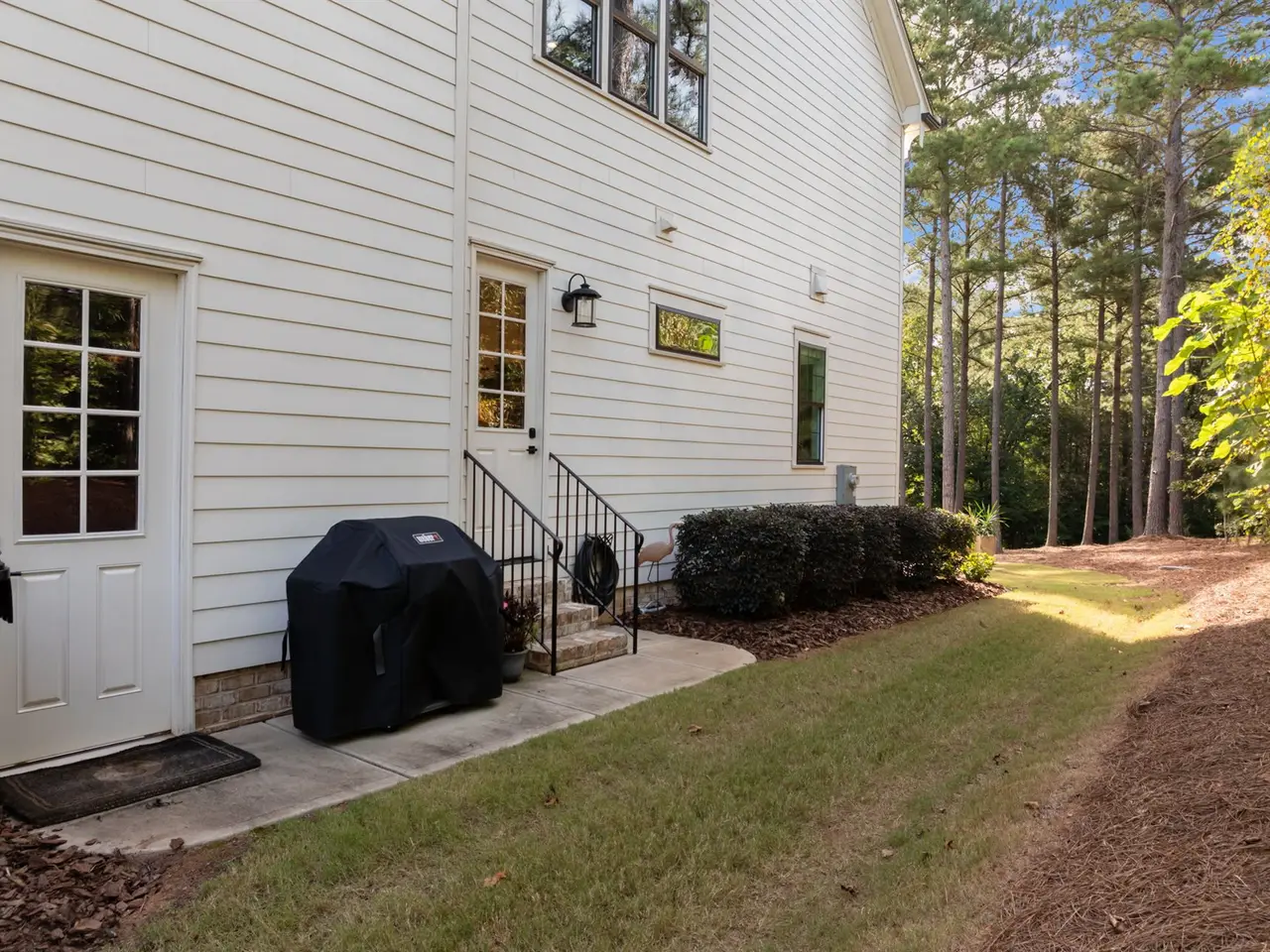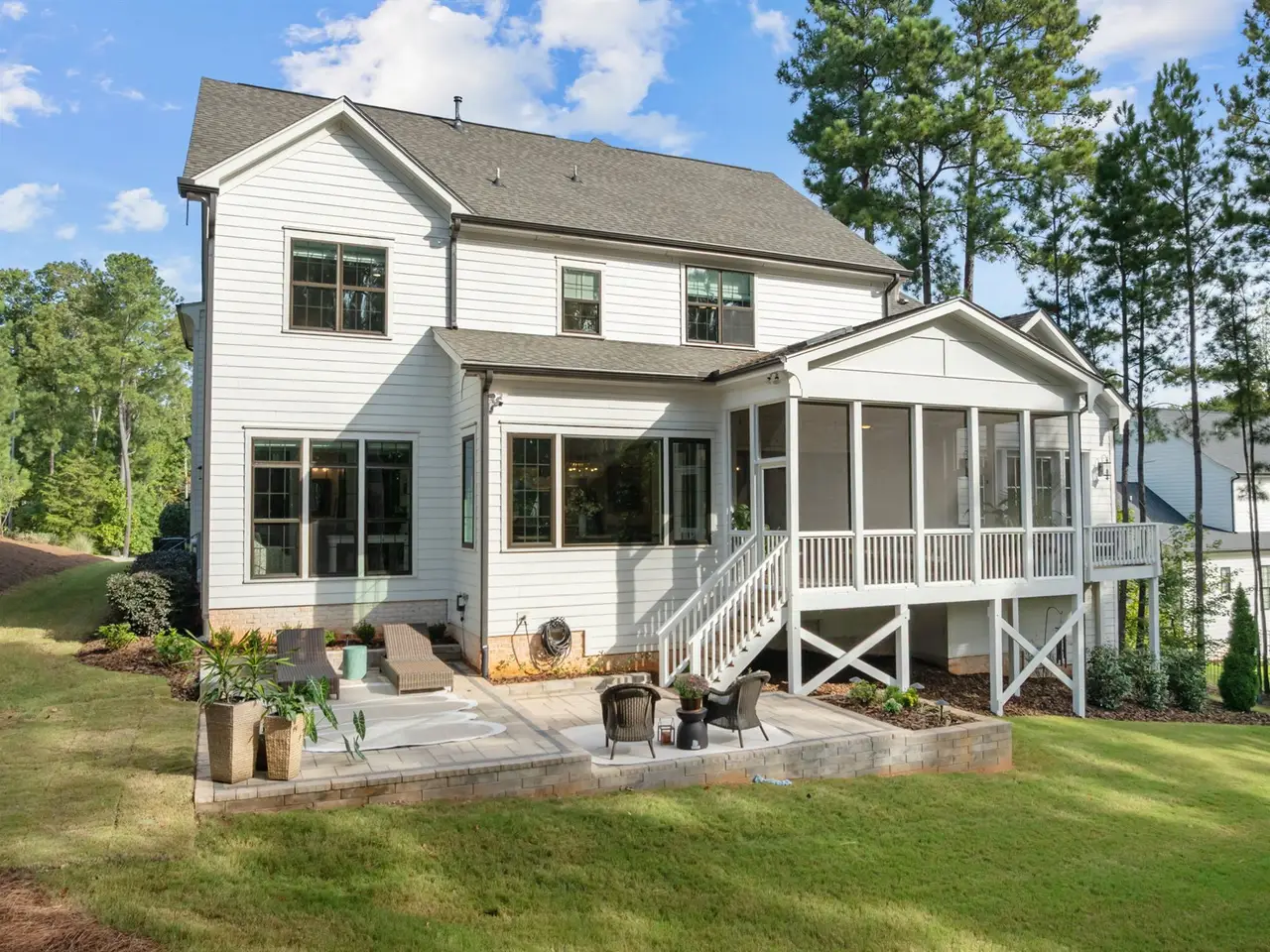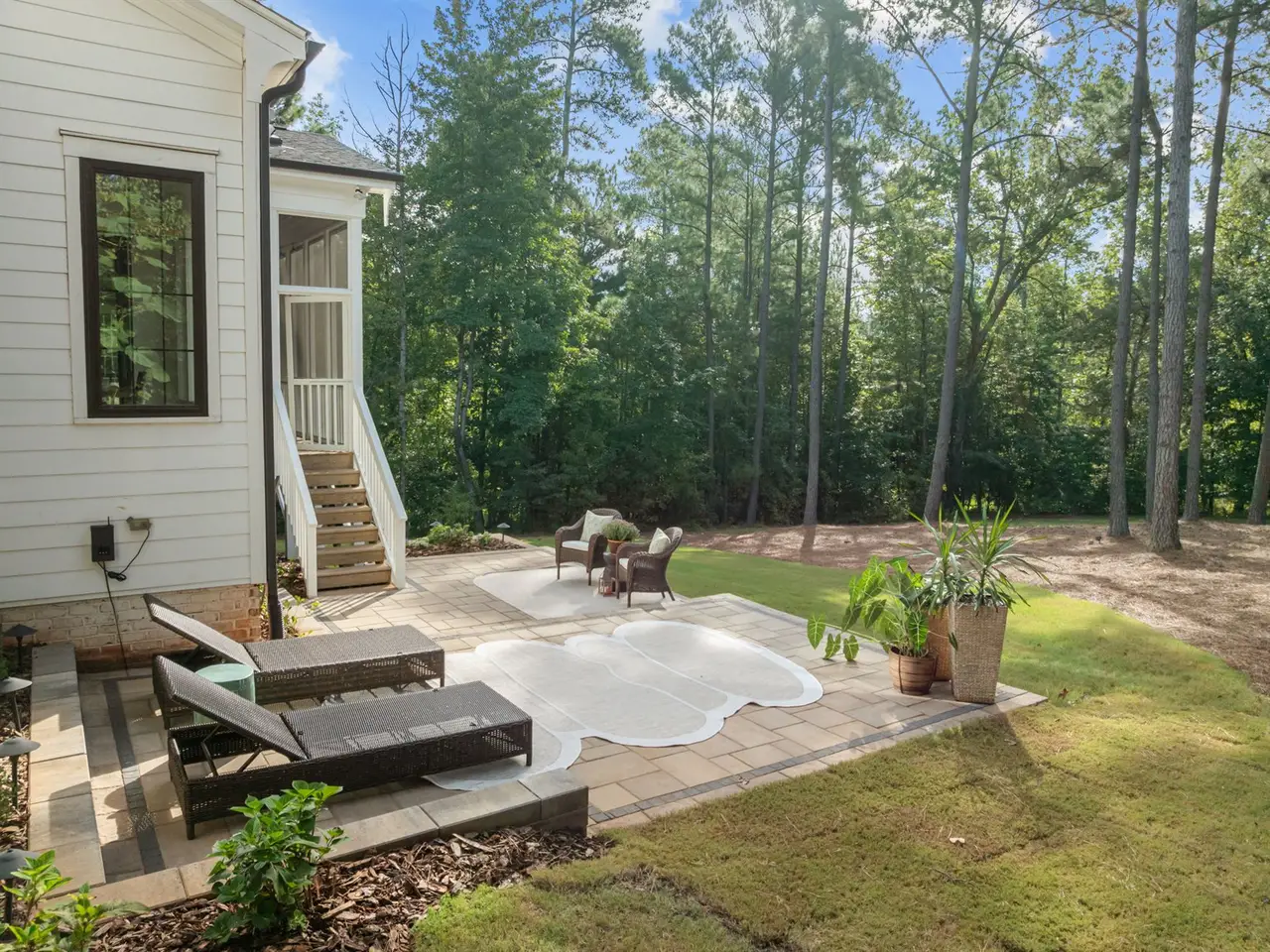 Southern charm meets modern luxury in this stunning home on a spacious 1.29-acre lot! From the moment you enter, you'll appreciate the hardwood floors throughout (Tile in baths) and custom finishes. The open-concept family room flows seamlessly into a gourmet kitchen featuring a large center island, quartz countertops, an impressive walk-in pantry, and a gas range-perfect for everyday living and entertaining. 1st floor office (can easily be used as guest suite) has walk-in closet and private full Bath. Enjoy the tranquil screened porch overlooking the expansive backyard with brand new patio. The main-level primary bedroom is a true retreat with vaulted ceilings accented by wood beams, private balcony, a spa-like bathroom with a walk-in shower, soaking tub, dual vanities, and a spacious walk-in closet with a convenient stackable washer/dryer hookup. Upstairs offers 3 additional bedrooms, 2 full baths (ensuite and jack and jill), a generous bonus room, gym, second laundry area, and two walk-in attic spaces for ample storage. The oversized 3 car garage completes the package. Located approximately one mile to Falls Lake and minutes to restaurants, shops-this home offers both convenience and serenity!