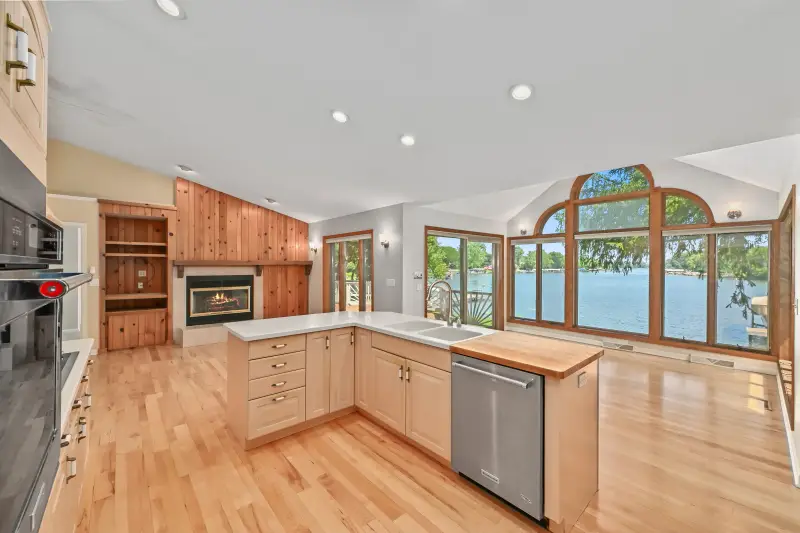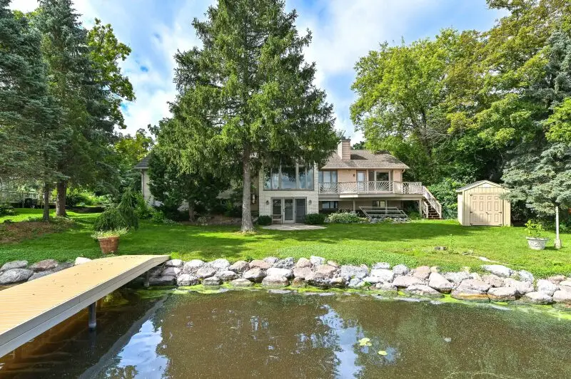 Lake Living at its finest! This almost 3000 square foot walkout ranch is nestled on an end road with 120+ feet of stunning Fox River Frontage! Toes in the sand, with a newer stone shoreline and a fabulous 2023 Pier which includes a Boat Lift and a Boat! As you enter the home, the walls of windows showcase the glistening water with an expansive north/east river view. Soaring ceilings and an open design offers a fantastic space for entertaining in the kitchen featuring Corian counters and a light airy feel. A cozy fireplace creates an area for relaxing after spending a day outside. A sunlit sunroom overlooks the water and a main floor Primary en-suite offers a large bathroom with tiled shower and jetted tub. A private door to the newer maintenance free deck is a great place to start the day with a cup of coffee or watch the sunset later in the day. A full walk-out lower level includes a large bathroom, bedroom, a space for another bedroom and a theatre room. The furnace, central air, roof are approximately 10 years old.