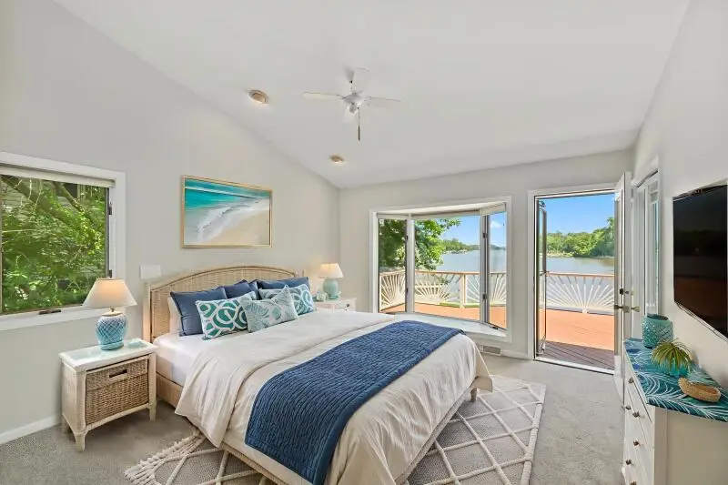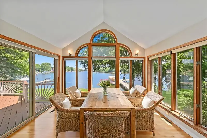Sunlit sunroom overlooking water