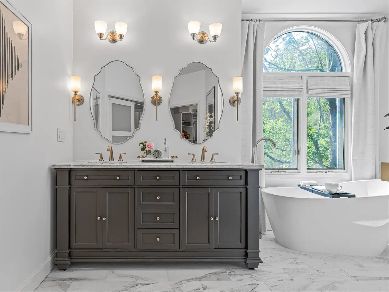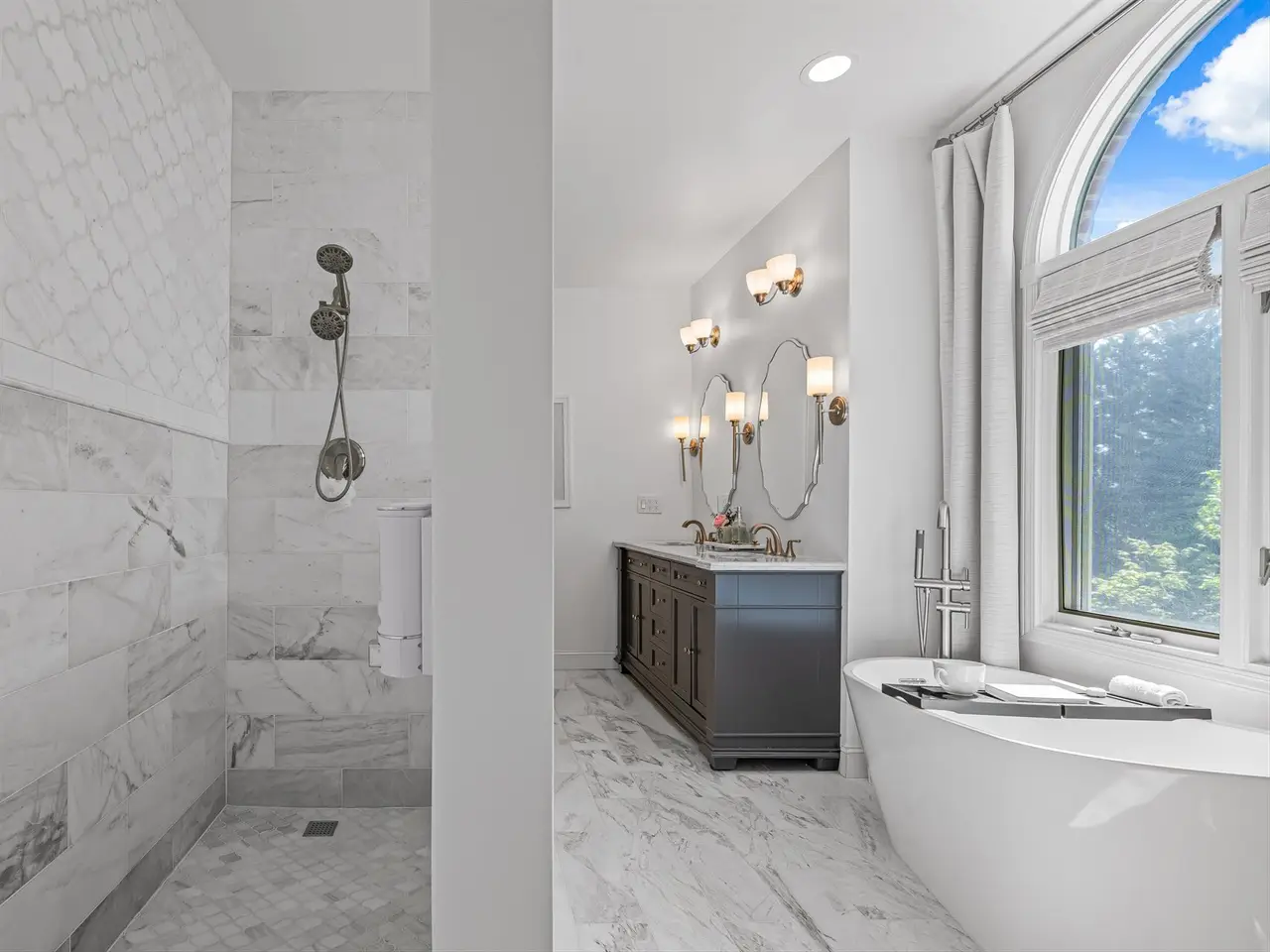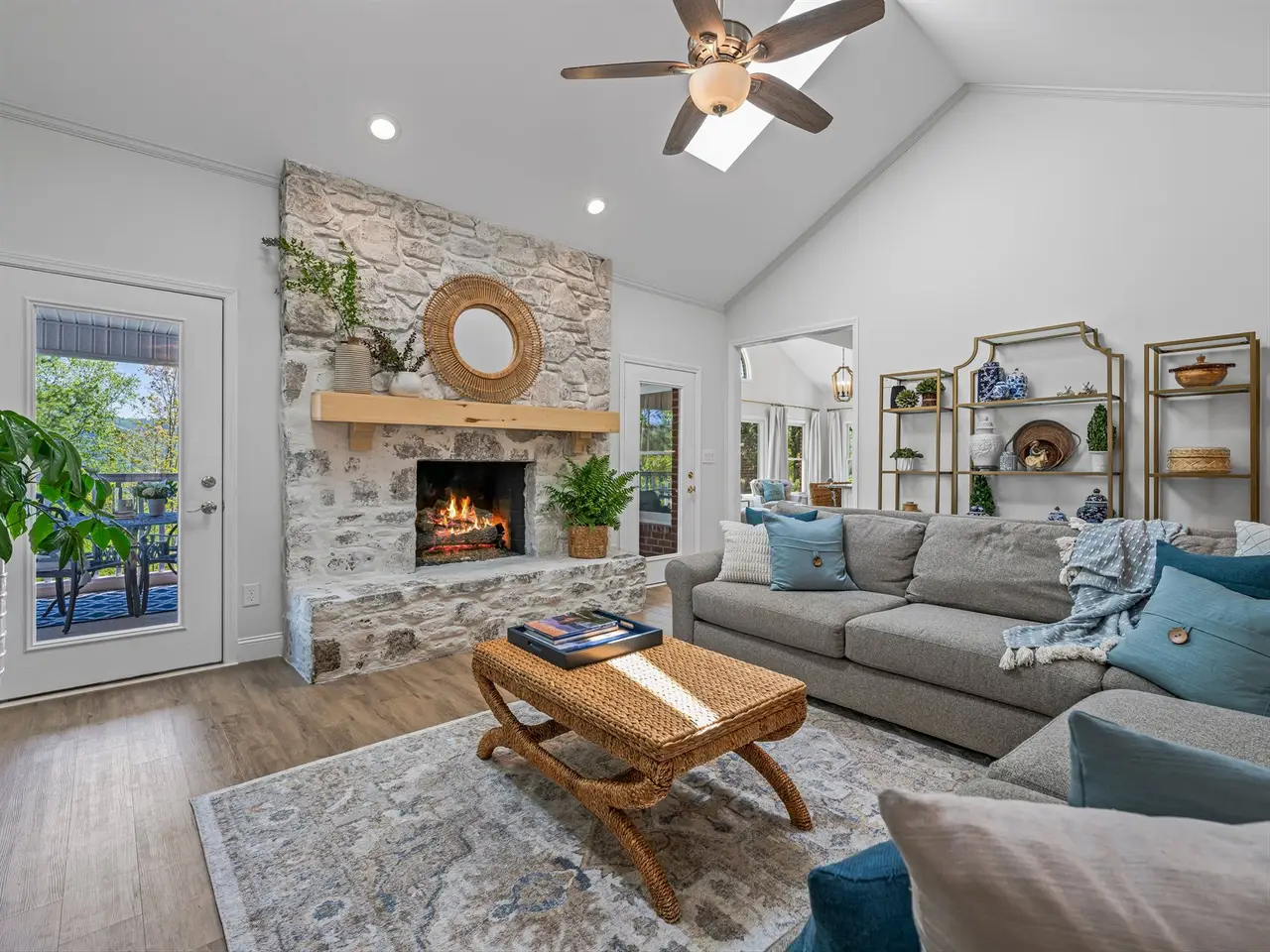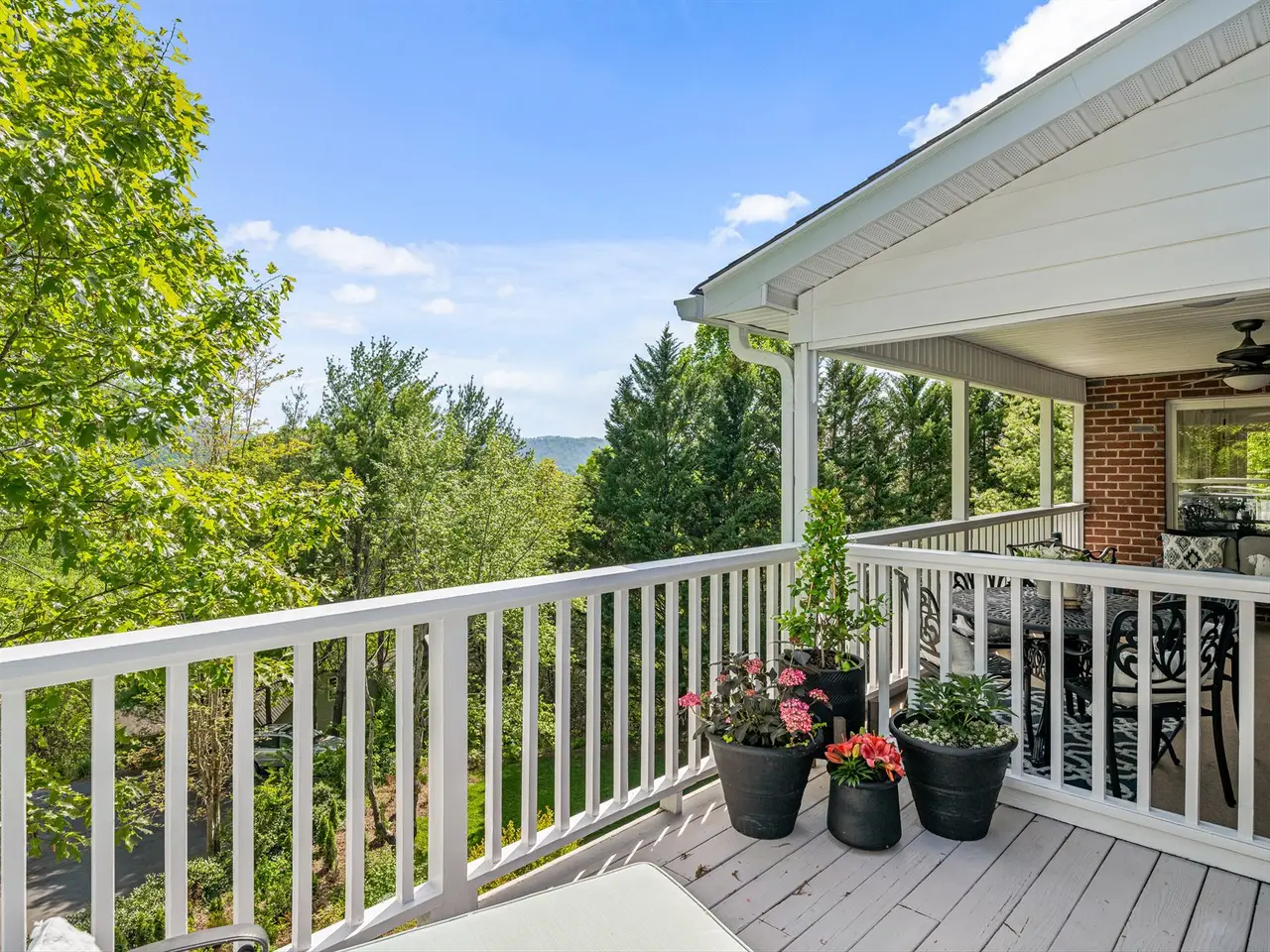 Elegant brick home in the coveted Reems Creek Golf Community, offering wonderful mountain views and showcasing an open, updated floor plan across two beautifully finished levels. Freshly painted and impeccably maintained, the main level features a vaulted great room with stone fireplace and German schmear finish, chef's kitchen with granite counters, black stainless appliances, and breakfast nook. The luxurious primary suite includes vaulted ceilings, spa bath with walk-in tiled shower, soaking tub, and custom closet. Two additional bedrooms, 1.5 baths, laundry, and oversized garage with workshop complete the main level, along with a covered porch and open deck. The lower level boasts a spacious second living quarters with great room, fireplace, second kitchen, second primary suite with ensuite bath and custom closet, fitness/game room, two storage rooms, and covered patio. Minutes to downtown Weaverville and Asheville. Optional golf and social memberships available at the clubhouse.