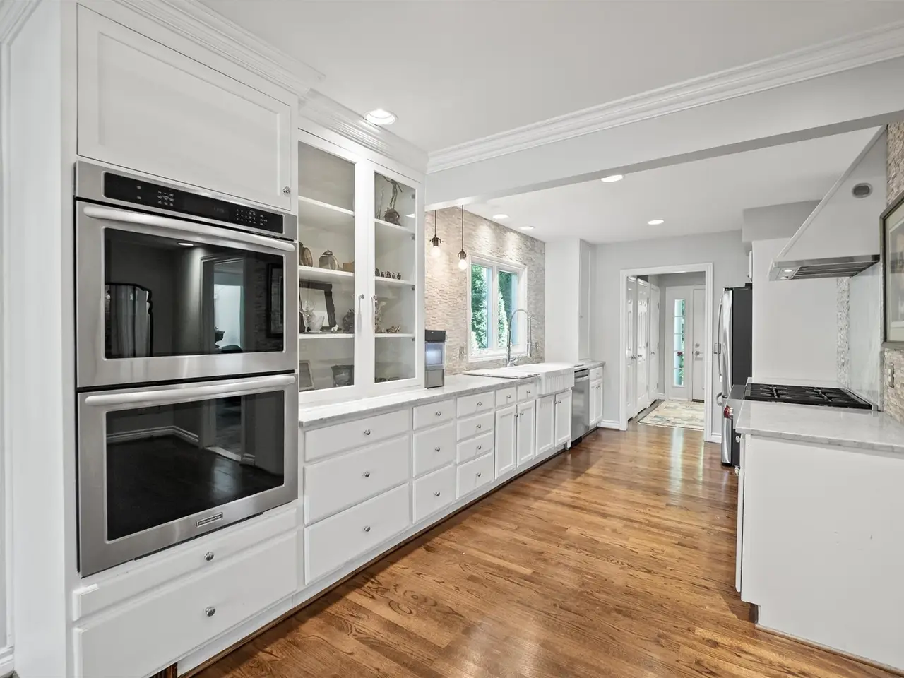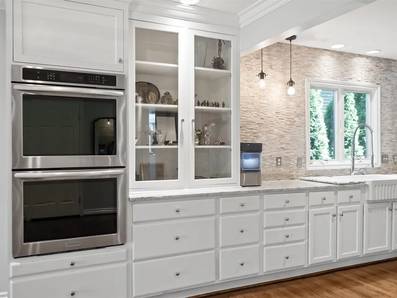 White marble kitchen with stacked stone backsplash