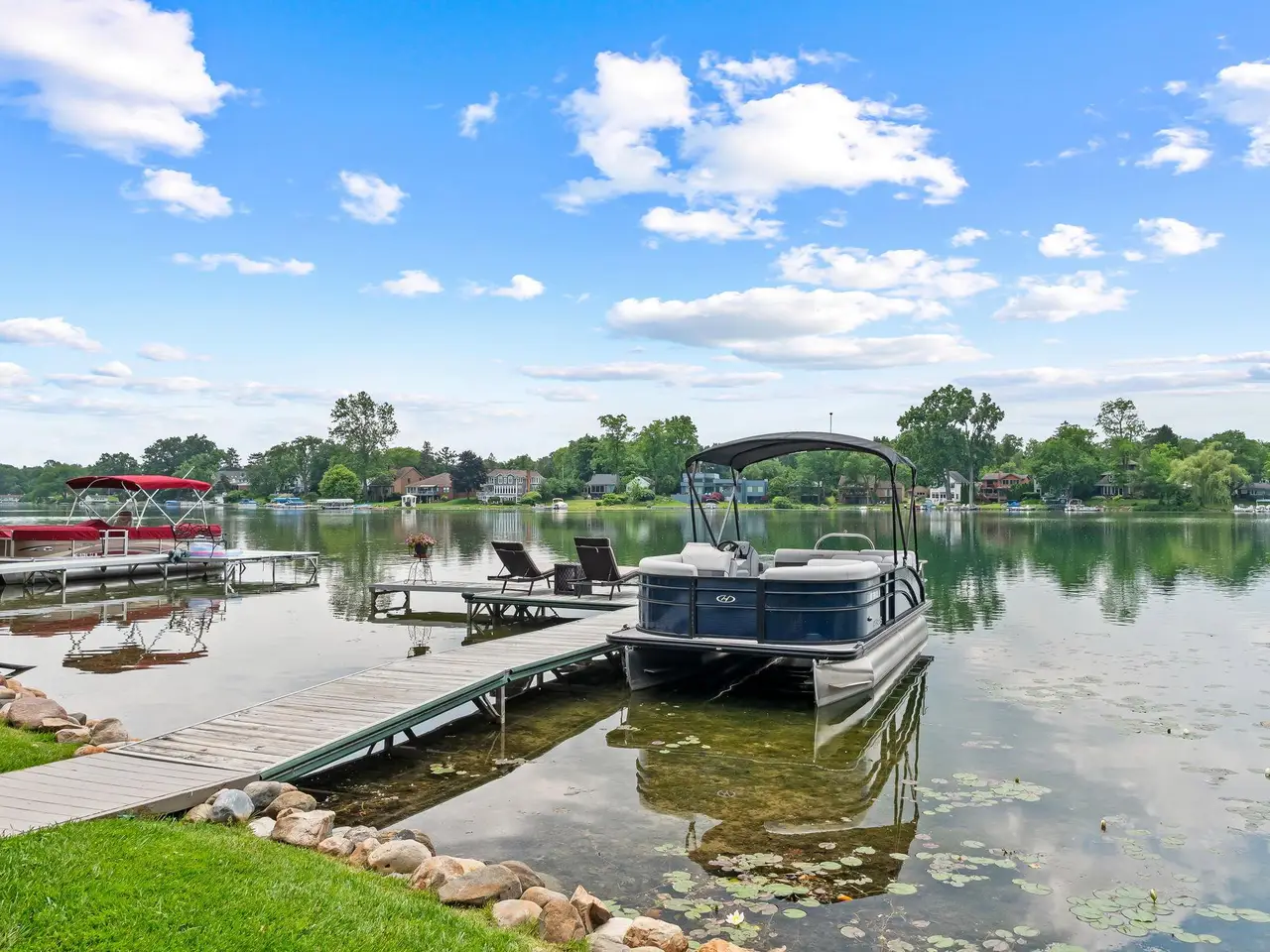 Large lakeside deck with built-in benches