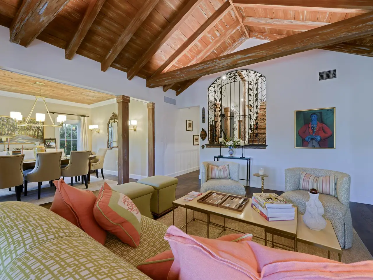 Set on one of the most prestigious streets South of Southern (SoSo), 245 Murray Road is a Spanish Mediterranean estate that has been completely reimagined by the renowned architectural firm Spina O'Rourke. Behind its custom pecky cypress front door, the residence unveils a grand living room with soaring 13-foot vaulted ceilings, dramatic pecky cypress beams, a marble fireplace, tongue-and-groove detailing, and wrought-iron accents that carry through the home. The formal dining room is equally captivating with its pecky cypress ceiling, chandelier, and oak hardwood flooring. Designed for entertaining, the main level offers a theater room, billiards lounge with a custom bar, and a warm family room that flows seamlessly into the chef's kitchen,