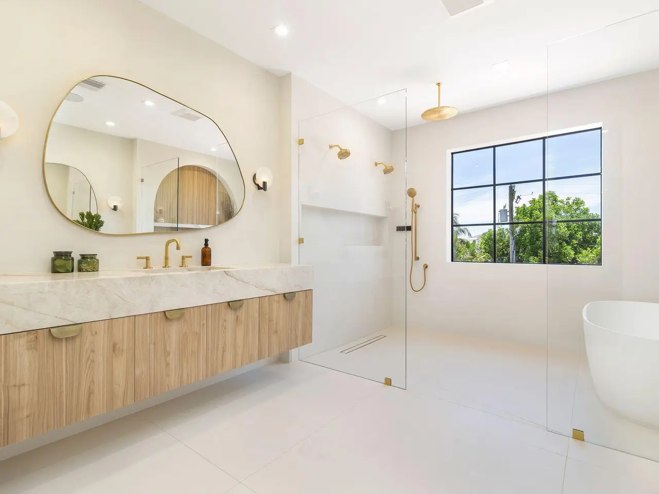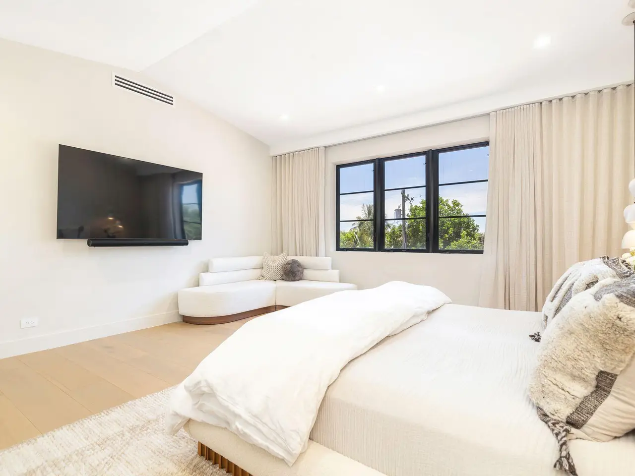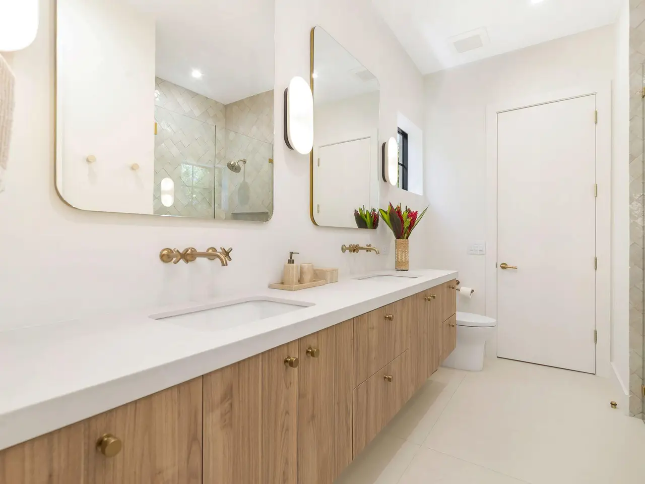 Uber-chic and effortlessly cool, this modern Mediterranean residence combines refined design with a warm, livable feel. Built in 2024 and offered fully furnished, the home features 4 bedrooms, 3 full baths, and 2 powder rooms -- completely turnkey and ready to enjoy. With 12' ceilings on the main level and a dramatic wall of 10' sliding glass doors, the interiors are open, airy, and designed for both everyday living and entertaining. The view from the custom front door carries straight through to the south-facing pool, where a Badu swim jet, covered loggia, summer kitchen, and gym/guest cabana create a true private retreat. Every element of the chef's kitchen has been thoughtfully considered, from the travertine countertops and backsplash to the custom pulls - this kitchen is dreamy!