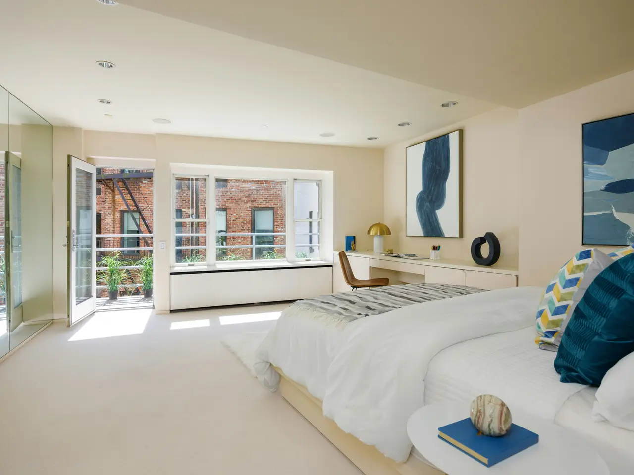 With 29 feet of frontage, including a curb cut, this fabulous 9,000 square foot home features double height ceilings, six outdoor spaces, a private covered parking spot, and an elevator that services the basement to roof deck. Step in off of charming Downing Street to an "open air" garage, that could be used as a garage, a front garden or party space too, with storage. Beyond the garage is the ground floor duplex that could be a perfect guest apartment, art studio, or company headquarters OR it can be combined with the rest of the house into one magnificent single family home. (If part of a single family home the ground floor would make an amazing kitchen/great room open to the back garden.) Features of this lower duplex include three bedrooms and three bathrooms and ceiling heights of over 16 feet in the main space with light streaming in from skylights. This dramatic great room has plenty of space for both a living and dining area, as well as direct access to the tranquil garden. Also on this floor is the large chef's kitchen, as well as a bonus room that has an en-suite bathroom and washer/dryer. The mezzanine level features three oversized bedrooms and two bathrooms. Currently, the main part of the townhouse begins on the second floor, which provides almost unlimited entertainment space with an 80 foot long great room with two terraces and a powder room. The adjacent, open kitchen boasts a 4 burner Garland stove with griddle, 48" Miele refrigerator/freezer, two sinks, two dishwashers, and a Gaggenau hot plate. Up a stunning, curved architectural staircase is the 3rd floor, which currently has two bedrooms, two bathrooms and a large office/den area with three built-in desks and tons of storage that is open to the great room below. Both bedrooms have en-suite bathrooms, built-in desks and the larger bedroom has access to a private terrace. The fourth floor is dedicated to the primary suite and boasts a wrap-around terrace with tall mature plantings and a wooden fence for privacy . The primary bedroom features custom built-ins and opens up to a nearly 30 foot long outdoor space with a pergola and plenty of seating space. The custom primary bath has a double vanity, deep soaking tub, separate shower, and water closet with a bidet. There is also a cedar walk-in closet and a sitting room/lounge with a fireplace, wet bar and additional storage that also has access to the terrace. The gorgeous roof deck, accessible from the elevator , boasts fantastic open skyline views, including the Empire State Building and Hudson Yards. The deck includes multiple seating areas, a pergola, and mature landscaping including birch trees. This unique home also includes a basement with additional storage and laundry. The house is currently configured as two condominium units, and is delivered vacant.