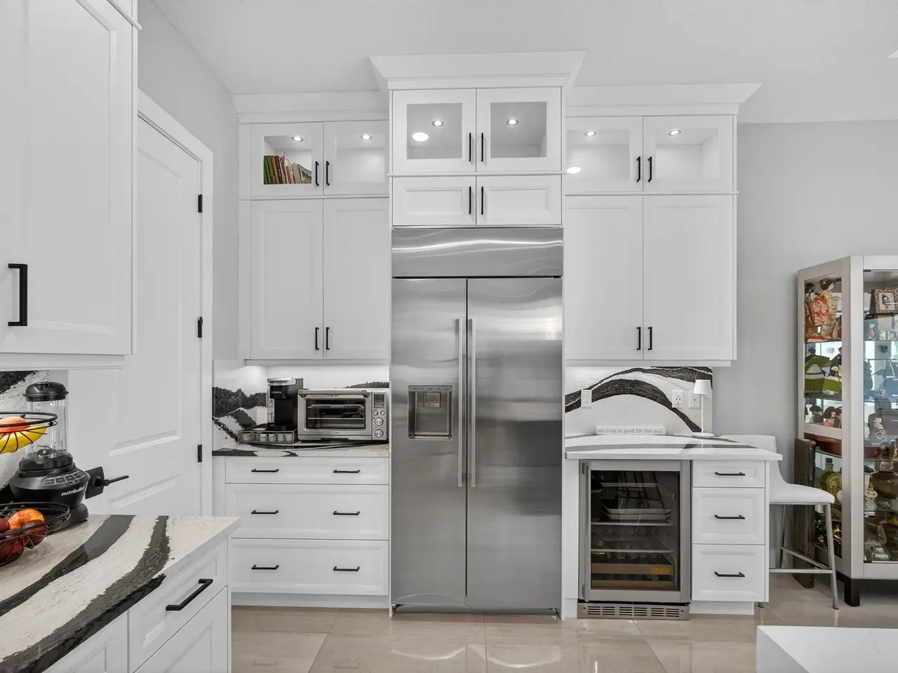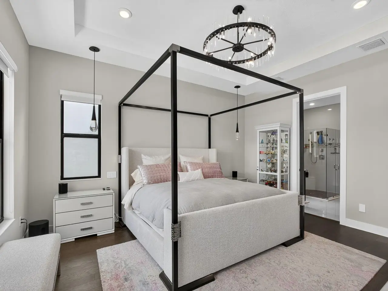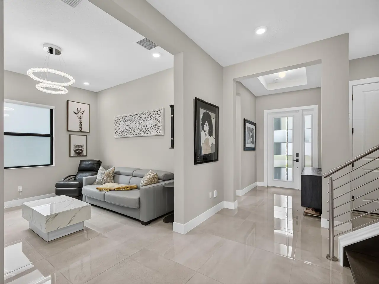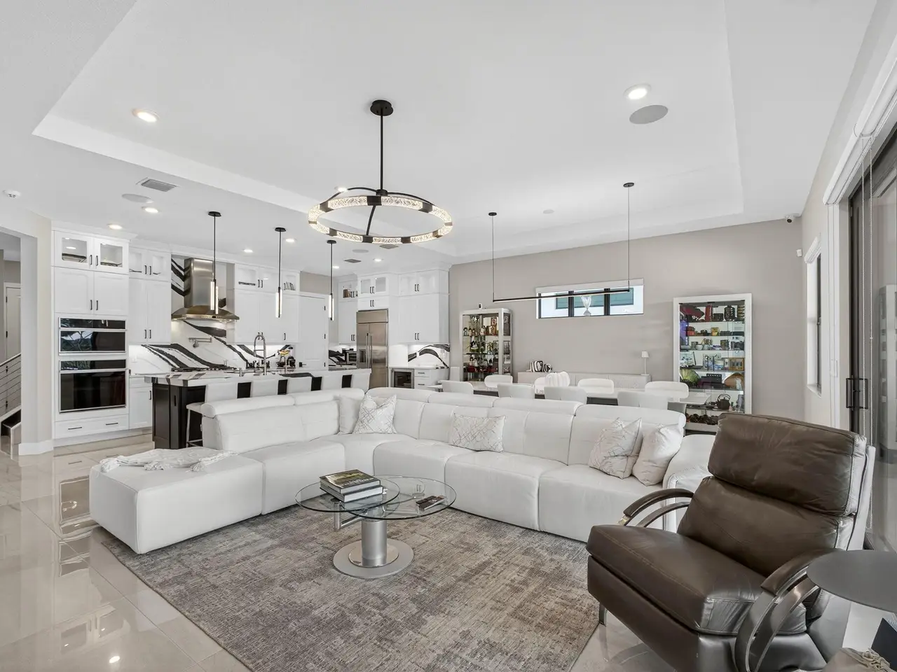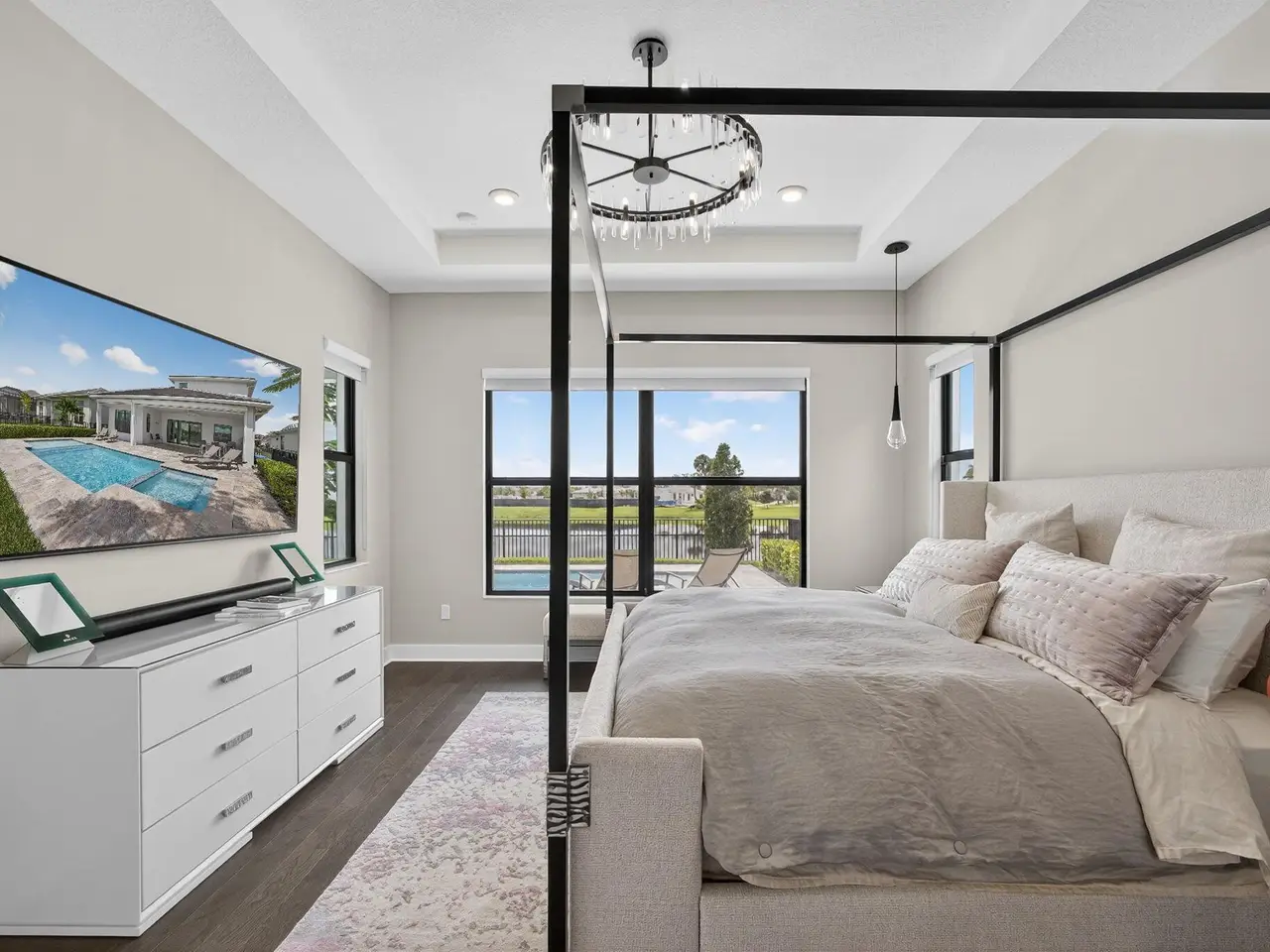 This is luxury Florida living at its finest, located on a waterfront lot, this designer styled home has been thoughtfully crafted with limitless upgrades and high-end finishes. The focal point of this home is the gourmet kitchen with waterfall quartz counters, level 7 soft close cabinets, GE Monogram SS appliances, six burner gas stove top, massive island and custom walk in butlers pantry. The luxurious primary suite features hardwood flooring, an oversized his/her walk in closet, smart mirrors and a spa like bathroom. The outdoor space is a true oasis featuring a heated pool surrounded by travertine decking, water views and a storm smart screening system. Also enjoy smart home technology, complete indoor/outdoor surround sound system and modern home theatre.