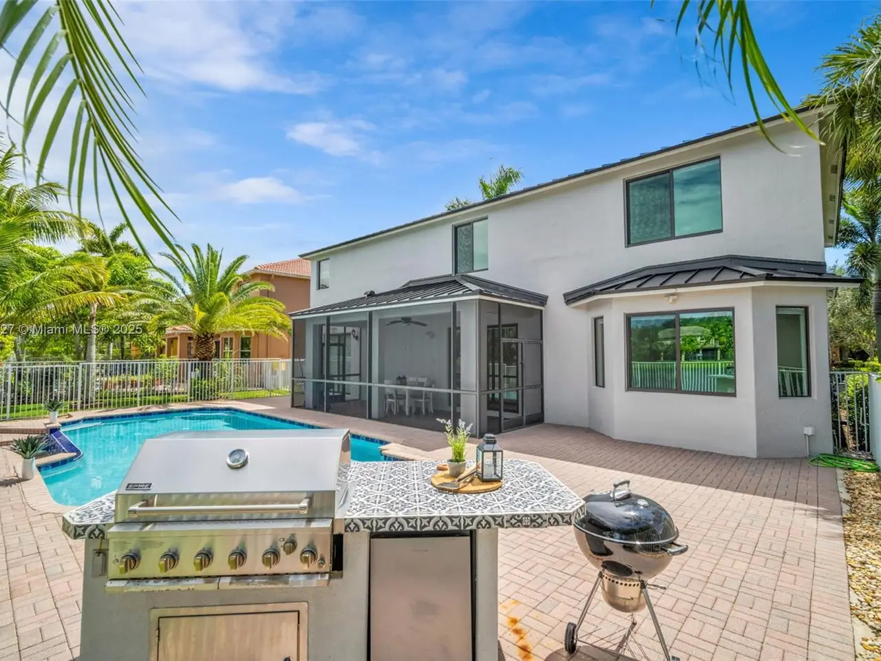 This showstopping, one-of-a-kind home is filled with upscale upgrades and eye-catching style! With 5 spacious bedrooms, a private office, and a flexible loft. all offering stunning lake views Brand-new 2024 metal roof and lush landscaping. Inside, soaring ceilings, a statement staircase, and sleek modern flooring create a grand welcome. The gourmet kitchen wows with a wine display, premium appliances, double ovens, and an oversized island. The primary suite offers a relaxing sitting area and spa-like bath with soaking tub. Enjoy the Florida lifestyle outdoors with a screened patio, summer kitchen, sparkling pool, & cabana bath. Located in the prestigious gated Isles at Weston, with a renovated clubhouse, resort-style amenities, and top-rated schools.
