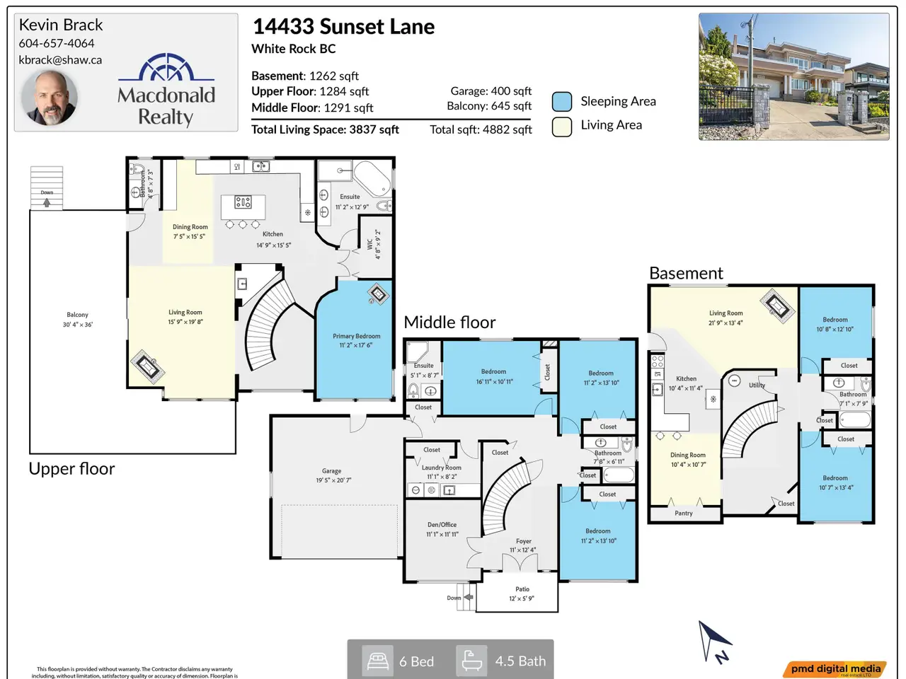 SPECTACULAR OCEAN VIEWS. The property is a secure, gated entertainer's delight. Upper floor features a newer open large bright kitchen with adjacent dining/living area with access to the private covered heated sundeck to soak in the ocean views this floor also featured a powder room and primary bedroom with five pc ensuite, fireplace and walk-in closet. Main floor has three bedrooms (one with an ensuite) and office. Downstairs has a two bedroom self-contained in-law suite with laundry, fireplace and separate entrance. House has newer engineered hardwood flooring, newer carpets, paint, crown moulding, Navien hot water system with in-floor hot water heat throughout. Maintenance free yard with inground water system. Bonus extra parking outside garage. This home truly is extremely well cared for and a pleasure to show your client.