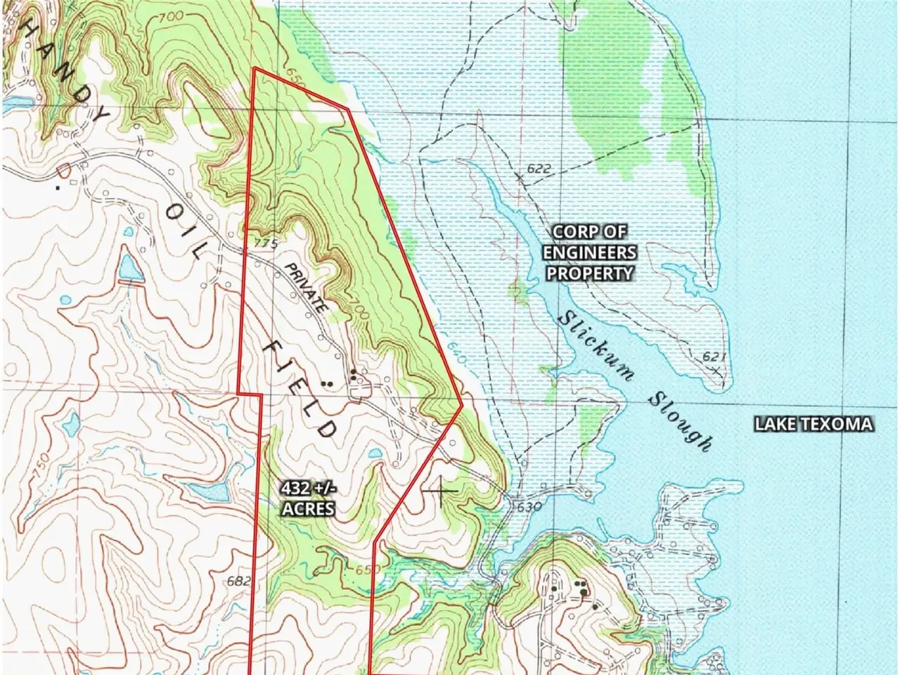Recreational dream property adjoining Lake Texoma! Hunting, fishing, four wheeling or just relaxing are all possible on this 432 acre property. This very unique property adjoins the Corps of Engineers land on Lake Texoma. There are approximately 3 miles of Corps frontage adjoining over 700 acres between you and the Lake. The terrain is varied with elevation changes of 145 feet with the highest at 775 feet. There are 3 ponds, several creeks, open grazing areas, and a large blanket of hardwood trees. Northern Grayson County is known for its Whitetail deer and Lake Texoma for its Striper fishing. Wildlife hunting and fishing can be nothing less than exceptional! It has one entry at Slickum Slough and is fenced for cattle. This property is a rare find as there are no other properties on the market that adjoin Lake Texoma with this amount of acreage. There are active oil and gas leases in place on the property. Minerals do not covey but could be negotiated.