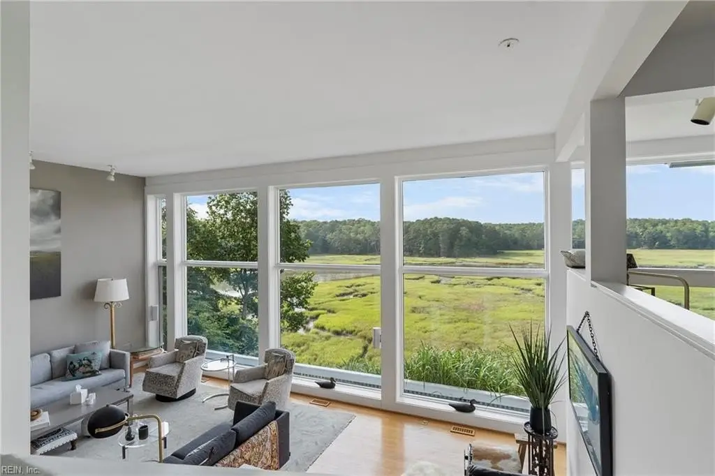 Architecturally stunning contemporary by Carlton Abbott in desirable Queens Lake. Perched atop a 60-ft slope on 3.83 acres, this 4,100+ sq ft home offers sweeping Queens Creek views from nearly every room. Abbott's signature design highlights dramatic rooflines, hardwood floors, natural wood finishes, expansive windows, and peaceful outdoor living. A striking foyer opens to a floor-to-ceiling glass living room. The top-floor primary suite boasts a private balcony, full bath, dressing area, and multiple closets. Three additional bedrooms, 3 full baths, and 2 half baths span 5 unique levels. Great for entertaining, the lower-level screened porch with fireplace and multiple outdoor spaces provide year-round enjoyment. Additional features include a whole-house generator, newer 3-zone HVAC, and updated gutters. Optional Queens Lake membership offers marina, pool, and tennis. Minutes to Colonial Parkway, I-64, Jamestown, Yorktown & W&M-where privacy and convenience meet.
