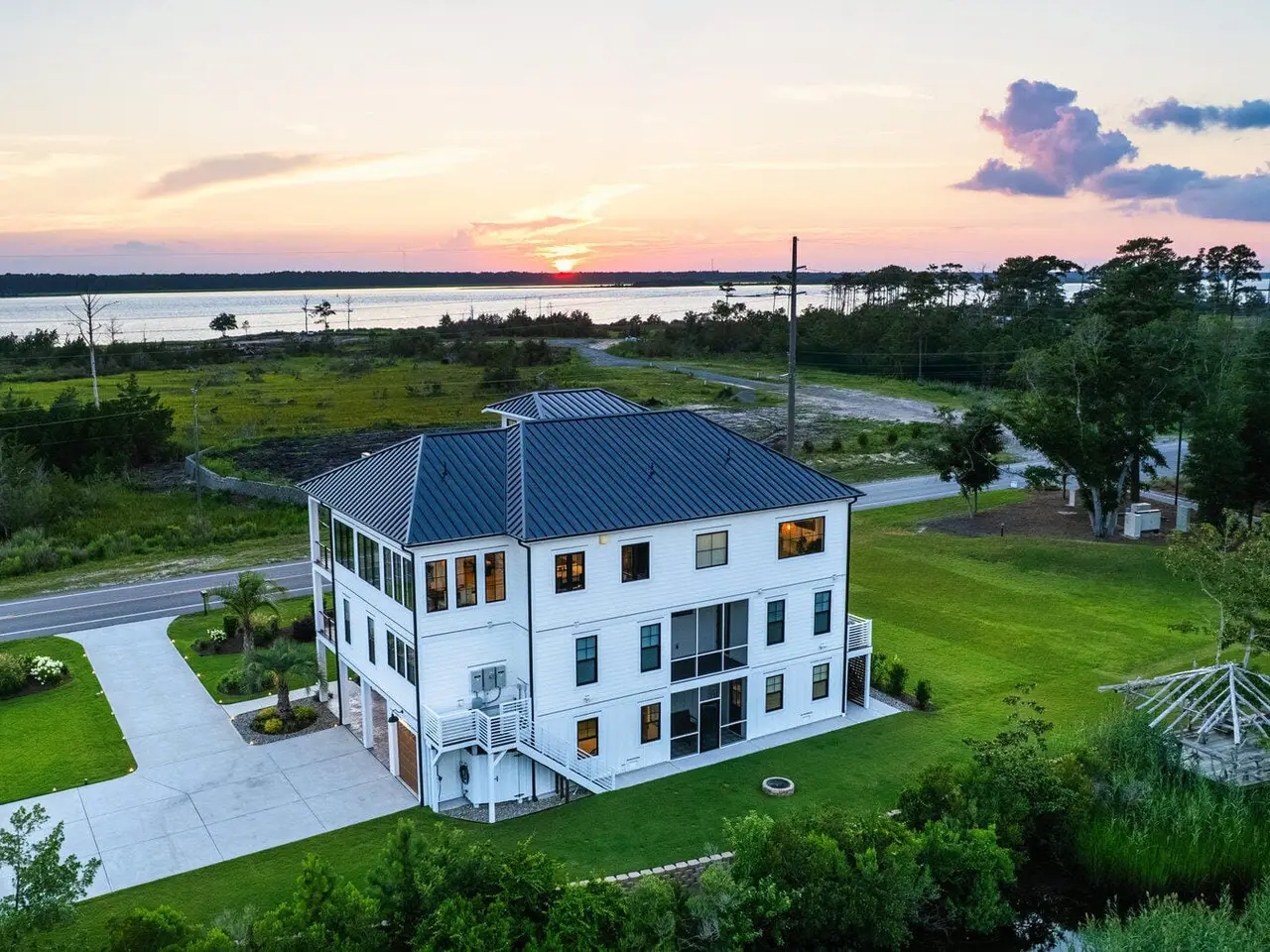 Imagine gliding home along River Road at golden hour, the Cape Fear River blazing with color as your 4-Story modern masterpiece appears. Clean lines, copper flashes, and railings catching every ray. Press a button and the hydraulic elevator lifts you from the epoxy finished 3 bay garage to the main level, where 10 ft ceilings and floating white oak stairs frame and unobstructed river panorama. Dinner simmers on a 48'' ZLINE dual-fuel range while conversation flows around the quartz waterfall island. A built in Signature Suite Fridge, twin beverage coolers, Samsung AirDresser and reverse-osmosis prep sink keep everything (and everyone) perfectly refreshed. Slide open DP-Rated glass walls and the porch transforms into an al-fresco lounge lit by fiery skies and a 62'' linear fireplace. Upstairs, the primary retreat rivals a boutique spa: 70'' limestone soaking tub, wall mounted bidet, remote shades, custom closet and a ocean-quiet Carrier HVAC- one of three zoned systems paired with a whole house dehumidifier, six smart thermostats, and a full water filtration. Two additional guest levels offer dry bars, a glass-walled office with gigabit wiring and a rec room cooled by a 20-SEER mini-split. Outside, marine grade cable rails, Duxxbak decking, stamped concrete, and a hot and cold shower stand up to salt and sun, while a 22 kw Generac generator, 500 gal propane tank, and 400 amp service keep life seamless. PGT impact windows, standing seam metal roof, fiber cement siding and copper flashing promise decades of low maintenance luxury. Bonus: There is an additional lot that can be purchased next to the property- perfect for a pool and/or a 1 bedroom accessory dwelling or in-law suite, making this already rare offering even more exceptional. There's nothing like it on the market. Schedule your private sunset tour today!