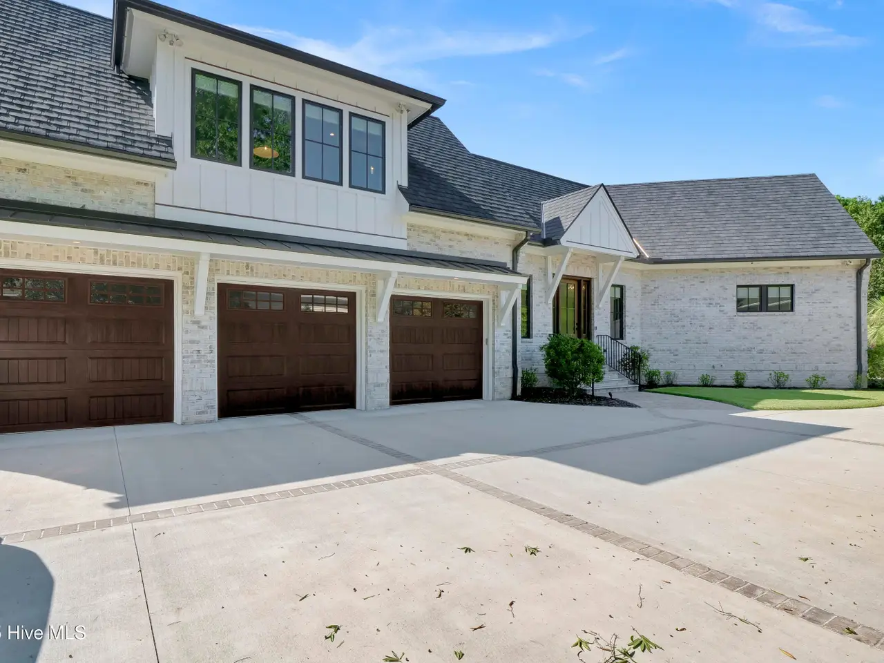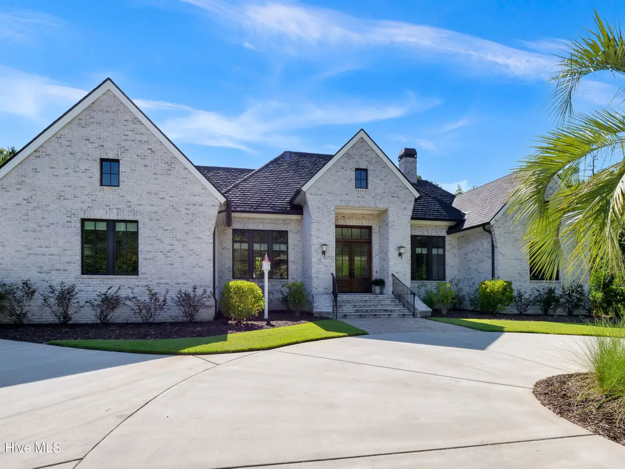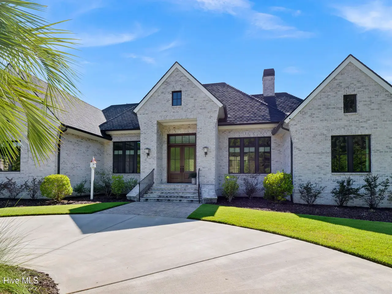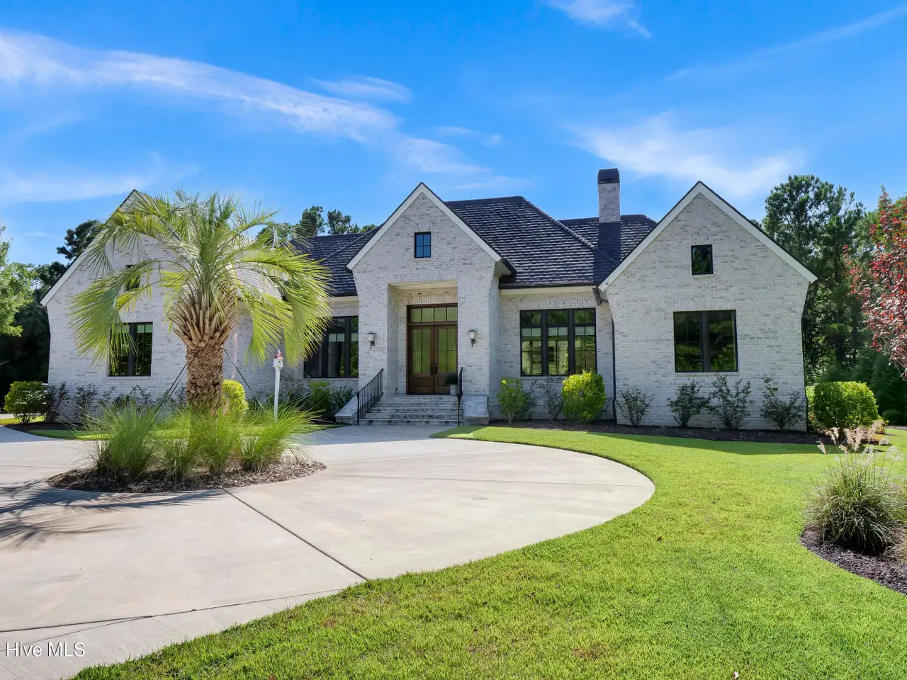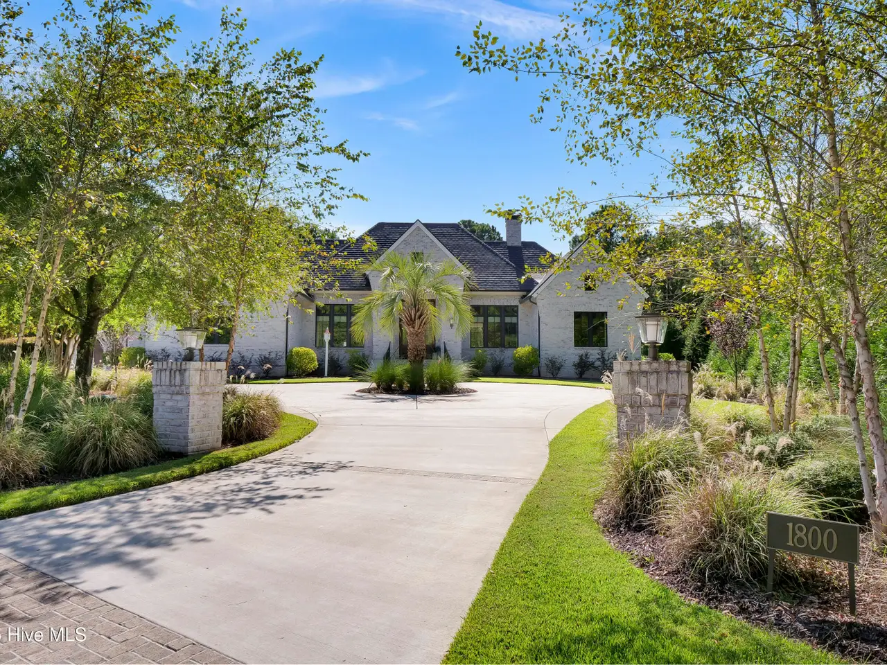 Combine a one of a kind location in the heart of Landfall with a quality built, nearly new, modern French country design with impeccable features and you will arrive at the secluded address of 1800 Newington Court.A quiet cul-de-sac with only 5 houses on the street and surrounded by over 300 acres of wooded conservation preserve, this thoughtfully designed, custom built residence by Mac Braxton of RMB Designs was completed in 2024 and features over 4500 square feet; including 3800 on the first floor alone. Few houses will stun you like this one! The low maintenance oversized Riviera all brick exterior and black clad Marvin windows give the home a stately presence with a circular driveway and lush tropical landscaping. As you enter the front door you will be amazed by the open great room with vaulted beamed ceiling; the chef's kitchen with huge quartz island and handsome stone accent wall in the kitchen and opposite fireplace wall. Custom cabinets from Hollingsworth and Thermador stainless appliances including a hybrid natural gas and induction cooktop, double ovens and multiple beverage drawers are the dream of every cook!The first floor features engineered hardwood flooring throughout including the 3 first floor bedrooms. The 2 guest bedrooms each have private ensuite baths on the far right side of the house and the 21x16 vaulted and beamed ceiling primary suite on the opposite side to provide everyone with privacy. Each bedroom has walk-in closets and custom designed shelving systems. There is additional 700 sq ft upstairs in a 29x21 bonus room with full bath over the 3 car garage. The garage also has a work shop and includes a half bath that opens to the backyard for easy pool access. On the first floor, the primary suite and one of the guest suites has access to the heart and soul of the home...over 700 sq ft of covered open air porch with vaulted ceilings and skylights; double sliding glass doors to allow seamless indoor-outdoor living and an outdoor