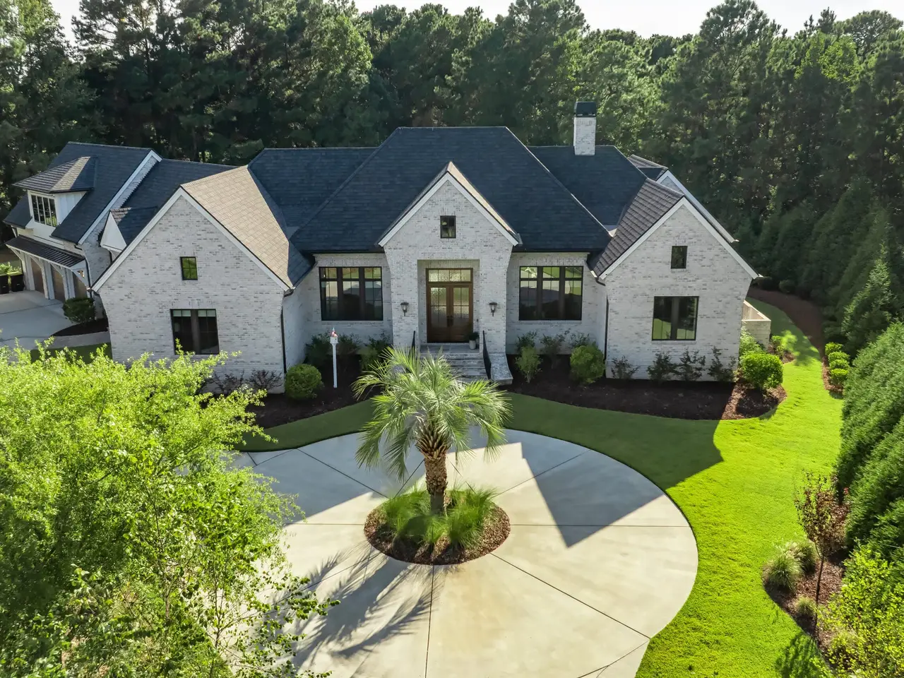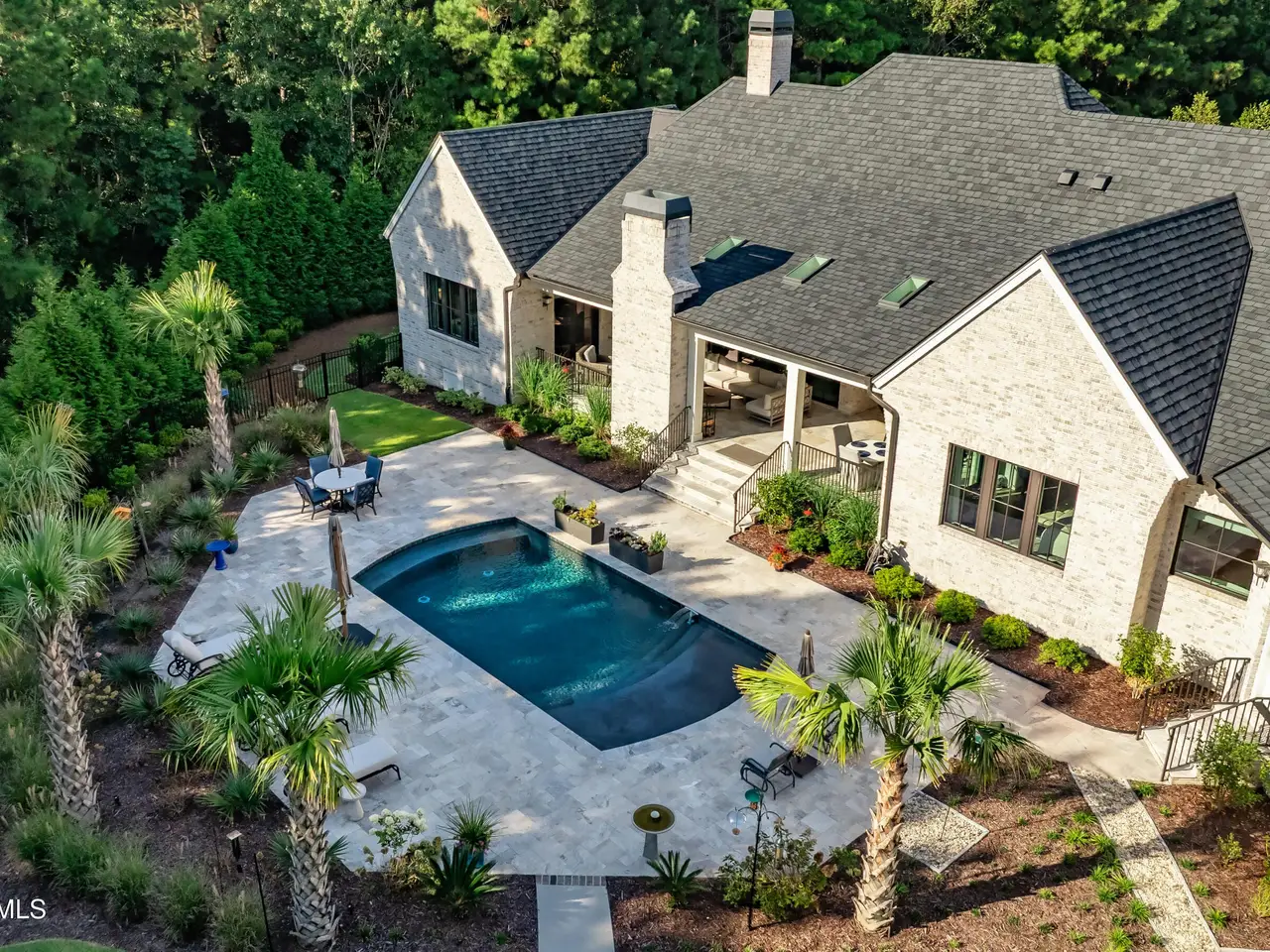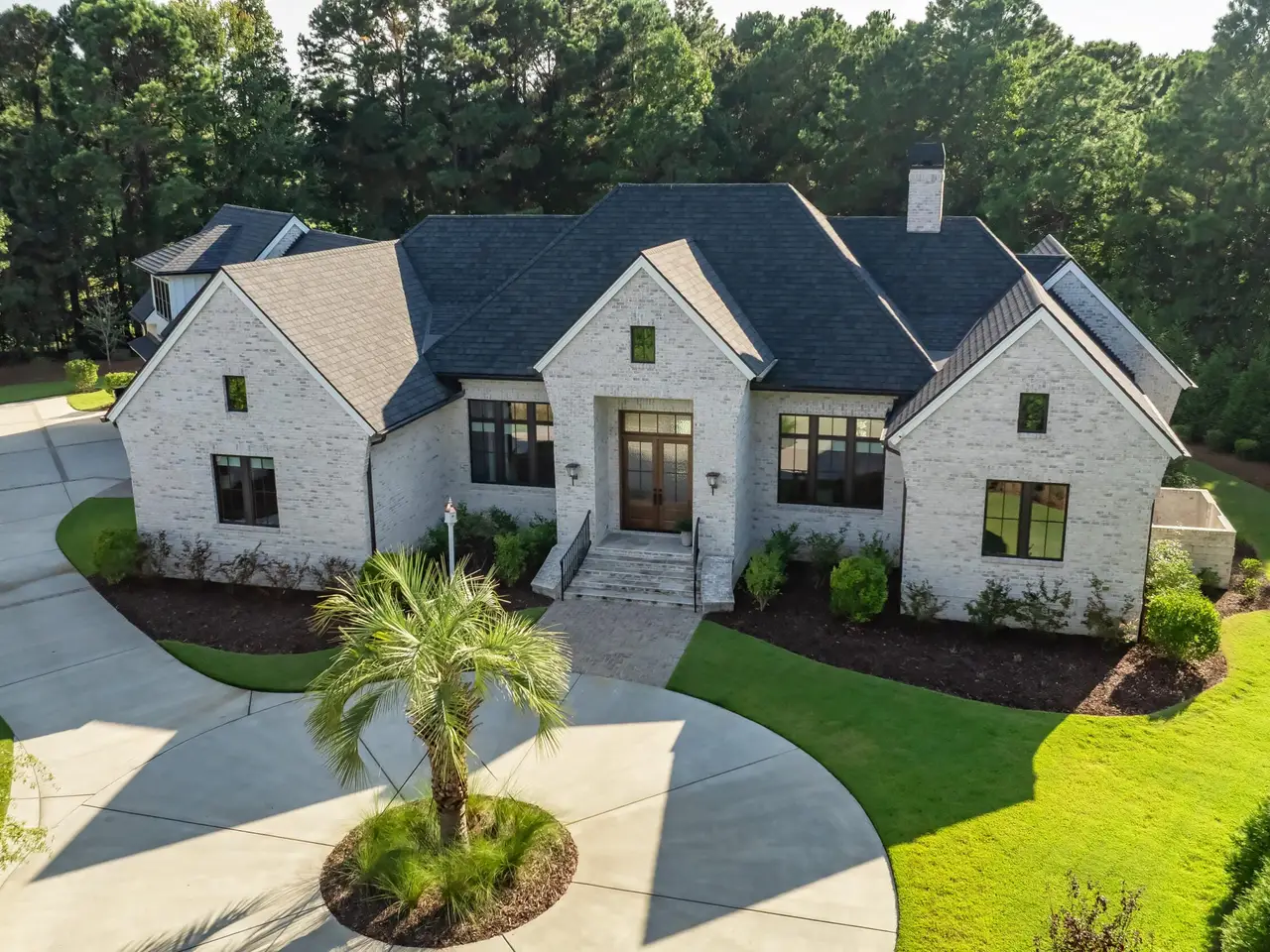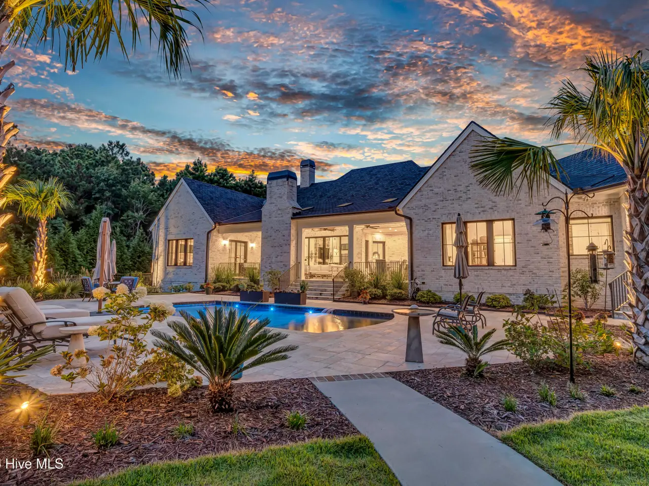 Combine a one of a kind location in the heart of Landfall with a quality built, nearly new, modern French country design with impeccable features and you will arrive at the secluded address of 1800 Newington Court.A quiet cul-de-sac with only 5 houses on the street and surrounded by over 300 acres of wooded conservation preserve, this thoughtfully designed, custom built residence by Mac Braxton of RMB Designs was completed in 2024 and features over 4500 square feet; including 3800 on the first floor alone. Few houses will stun you like this one! The low maintenance oversized Riviera all brick exterior and black clad Marvin windows give the home a stately presence with a circular driveway and lush tropical landscaping. As you enter the front door you will be amazed by the open great room with vaulted beamed ceiling; the chef's kitchen with huge quartz island and handsome stone accent wall in the kitchen and opposite fireplace wall. Custom cabinets from Hollingsworth and Thermador stainless appliances including a hybrid natural gas and induction cooktop, double ovens and multiple beverage drawers are the dream of every cook!The first floor features engineered hardwood flooring throughout including the 3 first floor bedrooms. The 2 guest bedrooms each have private ensuite baths on the far right side of the house and the 21x16 vaulted and beamed ceiling primary suite on the opposite side to provide everyone with privacy. Each bedroom has walk-in closets and custom designed shelving systems. There is additional 700 sq ft upstairs in a 29x21 bonus room with full bath over the 3 car garage. The garage also has a work shop and includes a half bath that opens to the backyard for easy pool access. On the first floor, the primary suite and one of the guest suites has access to the heart and soul of the home...over 700 sq ft of covered open air porch with vaulted ceilings and skylights; double sliding glass doors to allow seamless indoor-outdoor living and an outdoor