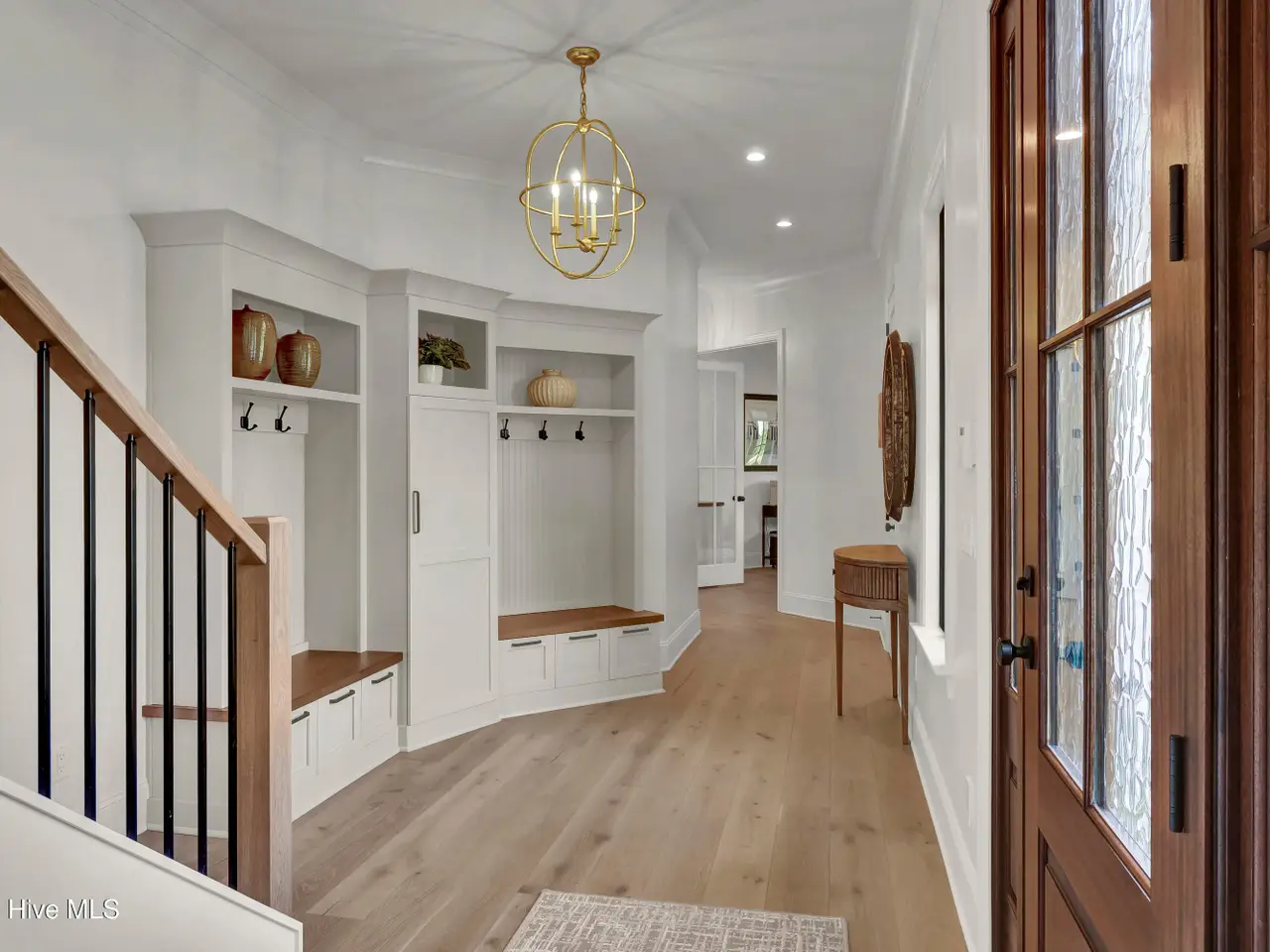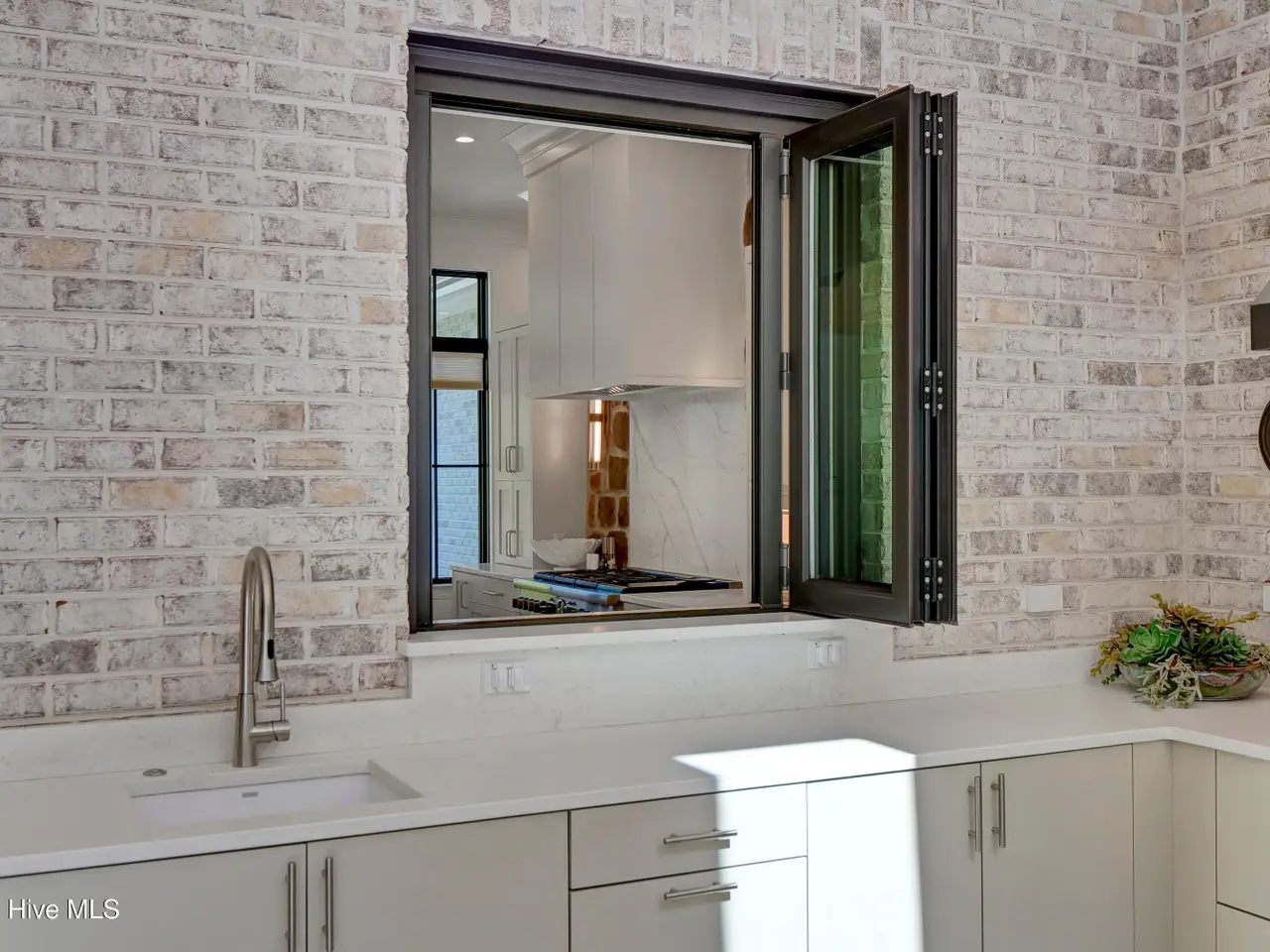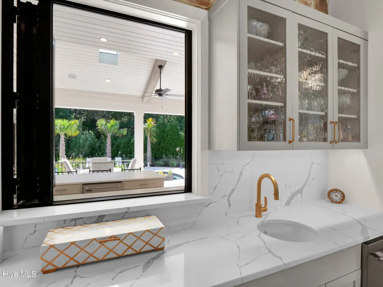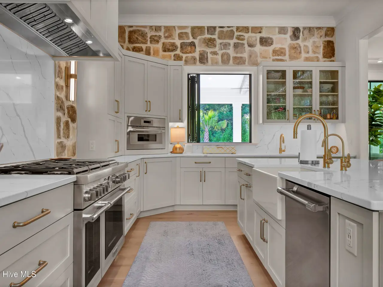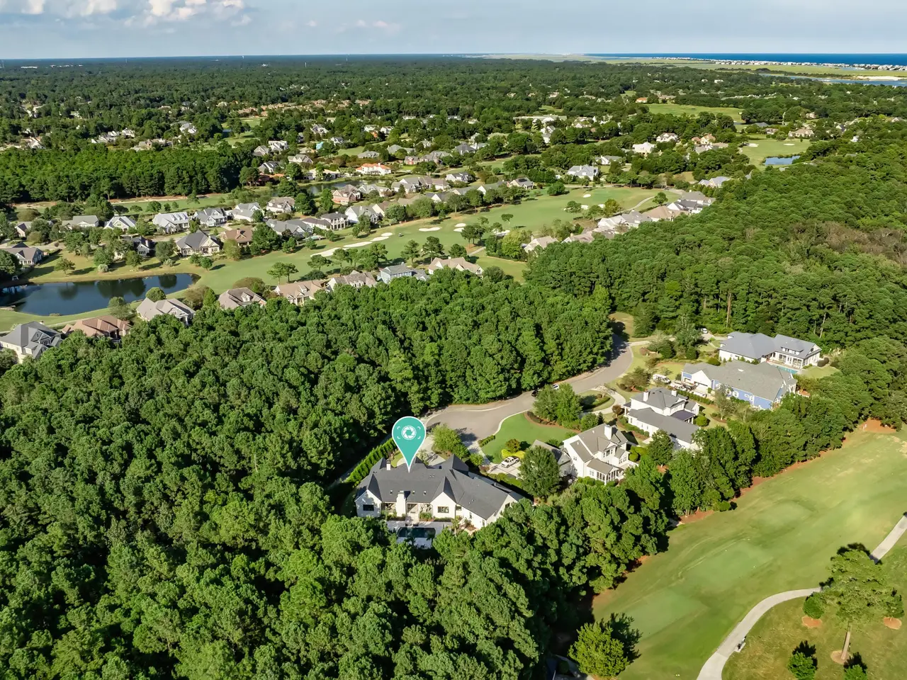 Combine a one of a kind location in the heart of Landfall with a quality built, nearly new, modern French country design with impeccable features and you will arrive at the secluded address of 1800 Newington Court.A quiet cul-de-sac with only 5 houses on the street and surrounded by over 300 acres of wooded conservation preserve, this thoughtfully designed, custom built residence by Mac Braxton of RMB Designs was completed in 2024 and features over 4500 square feet; including 3800 on the first floor alone. Few houses will stun you like this one! The low maintenance oversized Riviera all brick exterior and black clad Marvin windows give the home a stately presence with a circular driveway and lush tropical landscaping. As you enter the front door you will be amazed by the open great room with vaulted beamed ceiling; the chef's kitchen with huge quartz island and handsome stone accent wall in the kitchen and opposite fireplace wall. Custom cabinets from Hollingsworth and Thermador stainless appliances including a hybrid natural gas and induction cooktop, double ovens and multiple beverage drawers are the dream of every cook!The first floor features engineered hardwood flooring throughout including the 3 first floor bedrooms. The 2 guest bedrooms each have private ensuite baths on the far right side of the house and the 21x16 vaulted and beamed ceiling primary suite on the opposite side to provide everyone with privacy. Each bedroom has walk-in closets and custom designed shelving systems. There is additional 700 sq ft upstairs in a 29x21 bonus room with full bath over the 3 car garage. The garage also has a work shop and includes a half bath that opens to the backyard for easy pool access. On the first floor, the primary suite and one of the guest suites has access to the heart and soul of the home...over 700 sq ft of covered open air porch with vaulted ceilings and skylights; double sliding glass doors to allow seamless indoor-outdoor living and an outdoor
