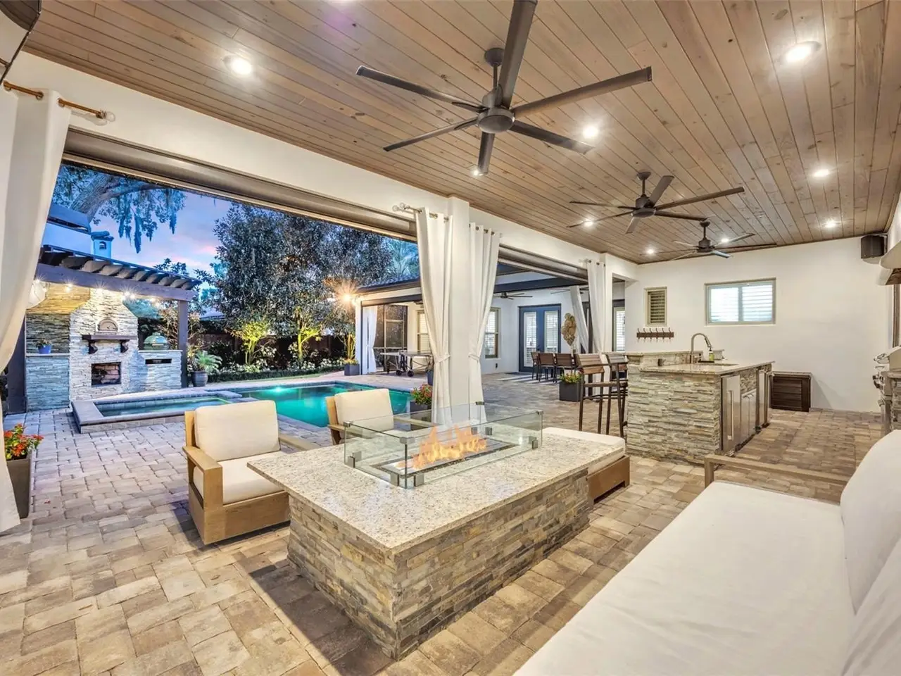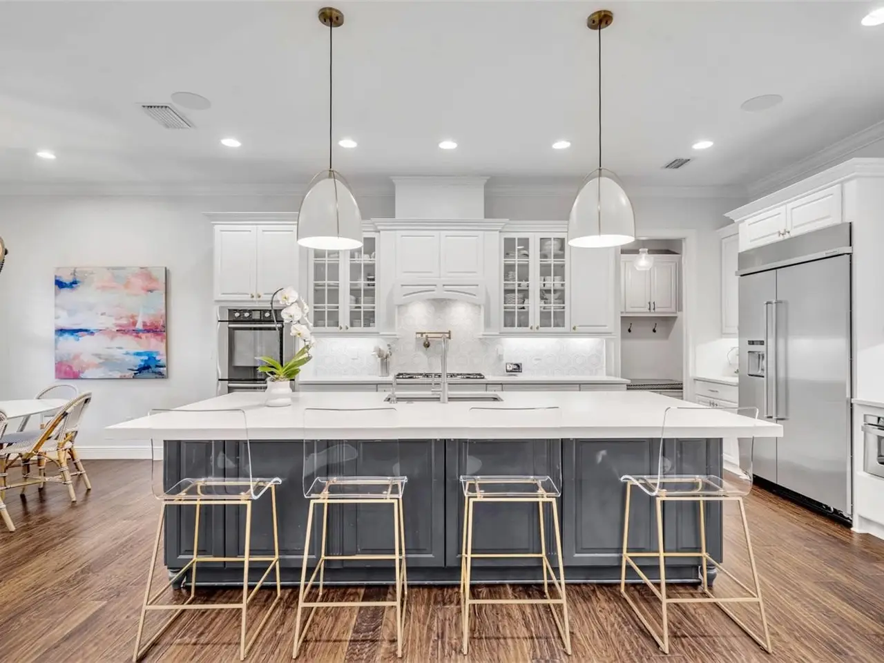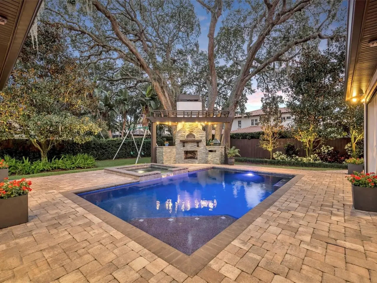 This stunning LunDev-built pool home has been meticulously maintained and thoughtfully updated, blending timeless craftsmanship with modern style. The ideal floorplan features a first-floor primary suite, a private office, and an open kitchen and family room that flow effortlessly to the home’s exceptional outdoor living space. Outside, the spacious backyard is a private retreat complete with an oversized covered patio, gas firepit, and a fully equipped summer kitchen with a pizza oven, all surrounding a sparkling pool and heated spa. In 2022, the kitchen received a major renovation, showcasing a new island, updated countertops and backsplash, fresh fixtures and cabinet hardware, and elegant lighting that elevate the space. The primary bath renovation mirrors the same level of quality, with new custom vanities topped with quartz countertops, all-new tile, a glass-enclosed shower, a relaxing soaking tub, and classic lighting and mirrors. Additional improvements include a new roof (2021), newer hardwood floors throughout the 2nd floor, updated brick paver driveway, newer pool equipment, and fresh interior and exterior paint, each reflecting consistent care and attention to detail. Designed for both everyday comfort and effortless entertaining, this home is truly move-in ready and radiates pride of ownership inside and out.