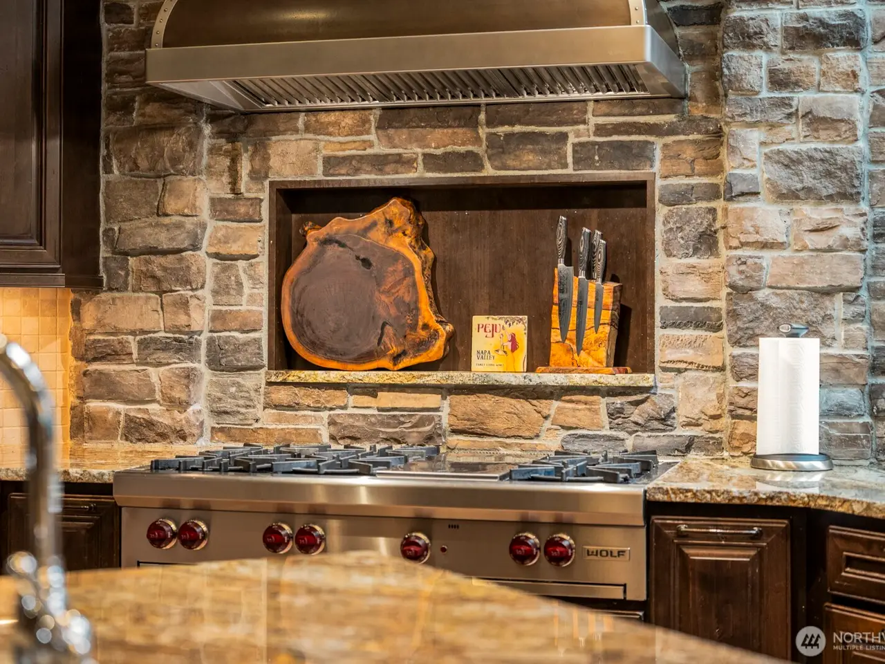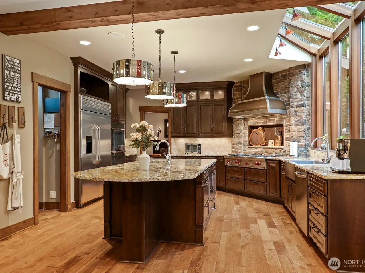 Captivating European Inspired Estate in sought after Lake of the Woods. A distinctive warm color palette offering rustic vibes in a symphony of stone, slate, knotty alder & exposed timber beamed ceilings. An enchanting 5770* sf boasting a main floor entertaining wing w/a billiard room, media room, dining room w/slate inlaid floor, multiple sets of doors to the awesome covered outdoor kitchen & lounge areas. Professional kitchen w/Wolf appliances, live edge slab granite, espresso stained distressed wood cabinetry. Upstairs-4 large en-suite bedrooms, primary w/air jetted tub & huge walk-in closet. Bonus w/slab stone work table. Fenced 1.3 AC w/waterfall, covered hot tub, raised beds, AC, generator, Sonos sound sys, 2 laundry rooms, Huge RV garage!