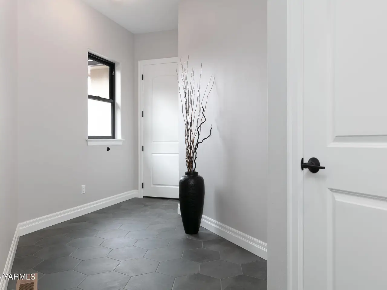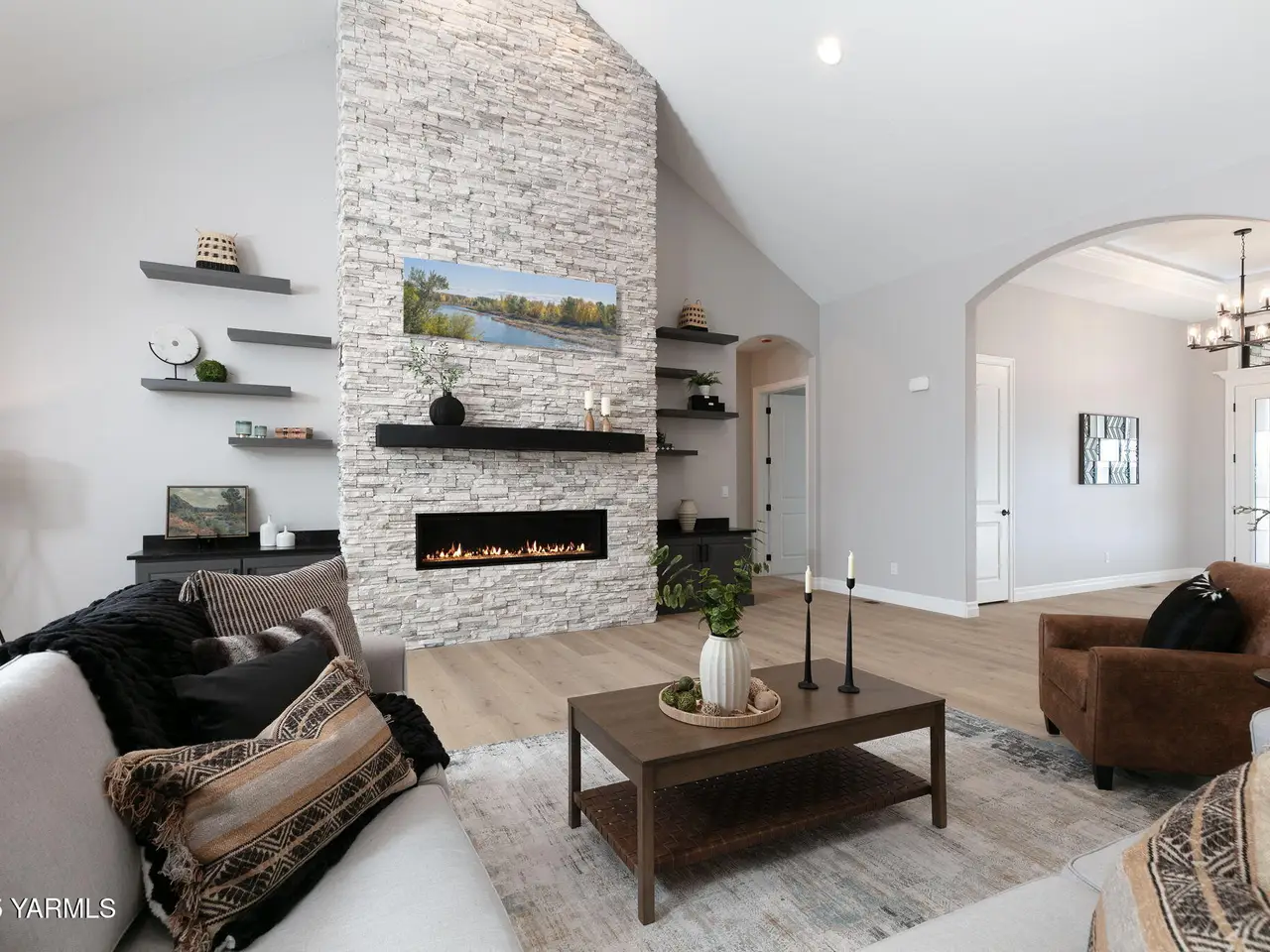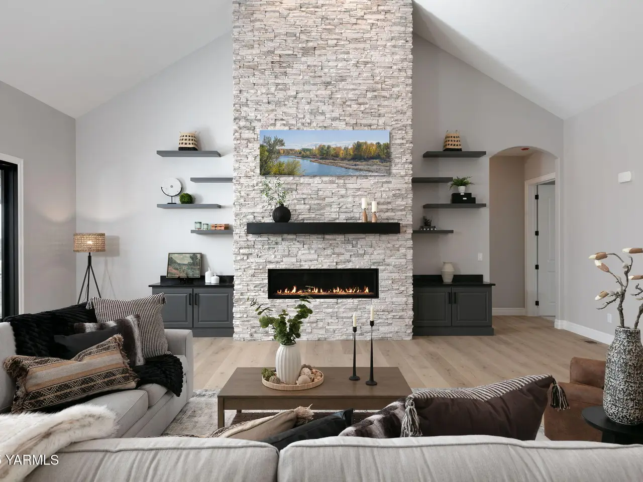Vaulted foyer with stunning floor-to-ceiling gas fireplace