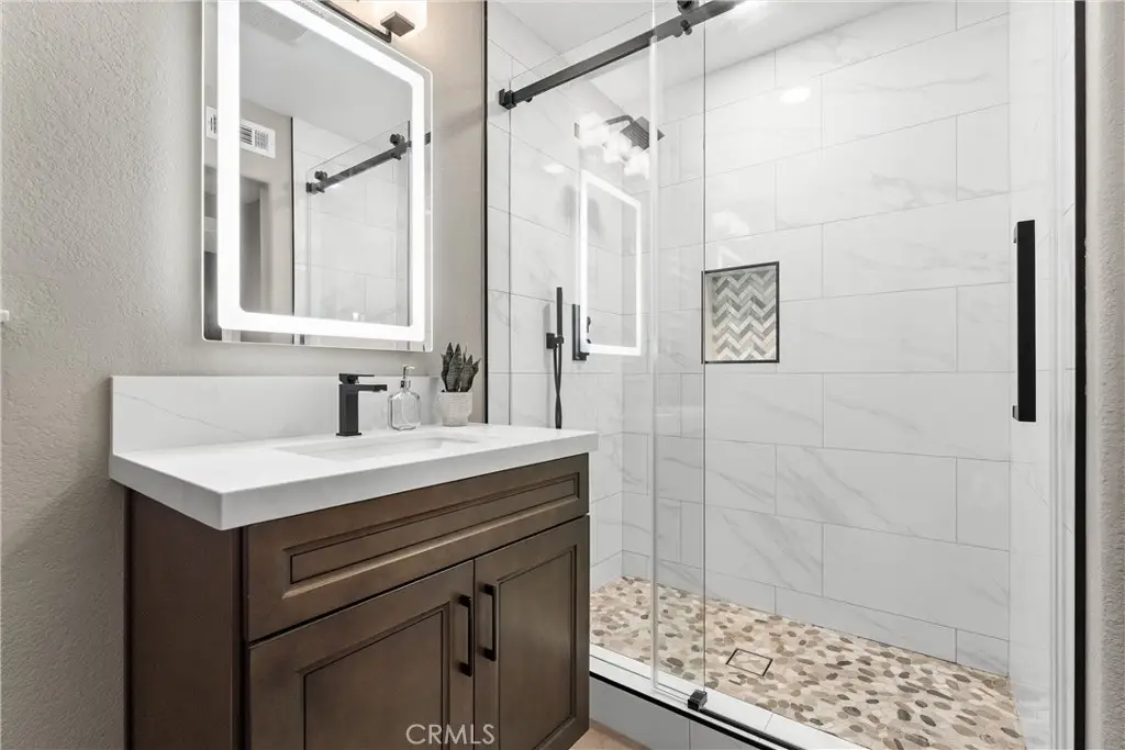 Welcome to Fairmont Terrace, a highly sought-after gated community in Yorba Linda. This beautifully remodeled two-story home blends modern design, smart upgrades, and comfortable living in one seamless package. Step inside and you'll be greeted by high ceilings, a brand-new custom staircase, and a fireplace featuring a statement marble mosaic design. Every detail in this home has been upgraded, including solid wood doors, elegant casings, recessed lighting throughout, and custom closet organizers in all bedrooms. The heart of the home is the chef's kitchen, redesigned for both entertaining and everyday living. Quartzite countertops and a marble backsplash pair beautifully with high-end appliances, including a Wolf range and hood, Wolf M Series double ovens, and a Bosch dishwasher. The kitchen features a spacious island and cabinetry with endless storage, as well as custom solid oak shelving in the generous pantry. Retreat upstairs to a primary suite designed to feel like a luxury spa. High ceilings and a stunning bath create a true escape, with custom cabinetry and quartz countertops, a high-end Japanese soaking tub, pebble-stone shower floor, marble mosaic flooring throughout, and a separate space with a remote-controlled Toto toilet. Two additional upstairs bedrooms share a hall bath that has also been fully redesigned, with quartz counters, a custom tub and shower, and a Toto toilet. The downstairs bedroom and full bath have likewise been fully remodeled, providing comfort and flexibility for guests or multi-generational living. Efficiency and convenience are built in with paid-off solar panels, a Tesla Powerwall, whole-home water filtration, reverse osmosis in the kitchen, dual-zoned HVAC with new ducting, and a whole-house fan. The exterior is also newly painted. Step outside to a spacious backyard with a patio and fruit trees, perfect for gatherings or quiet evenings at home. The back slider also features a convenient remote-controlled shade. This home is more than move-in ready -- it's a rare opportunity to own a highly upgraded, energy-smart property in one of Yorba Linda's most desirable communities, close to top-rated schools, shopping, and dining. Don't miss this incredible opportunity!