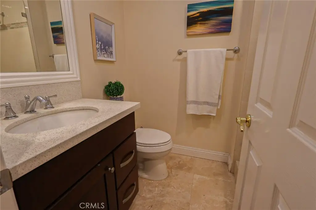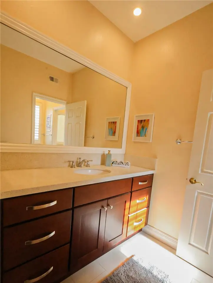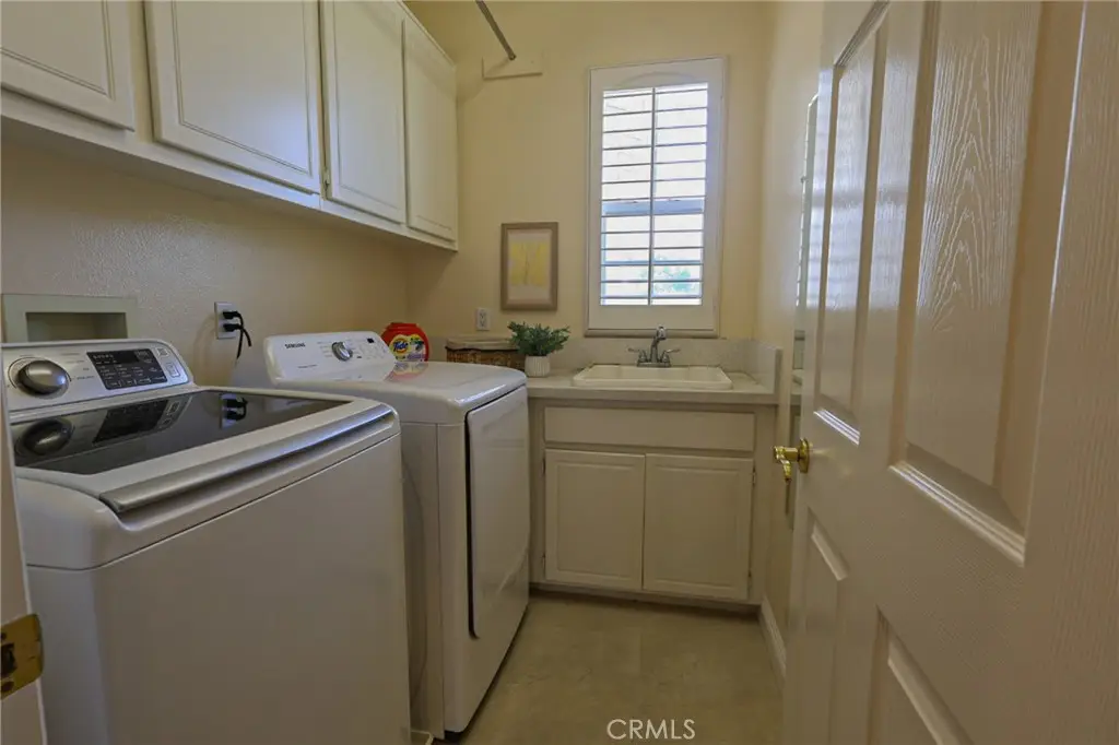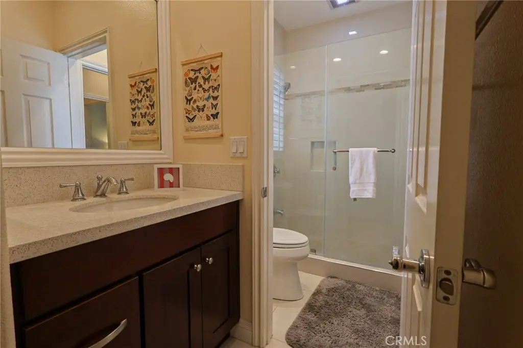 This meticulously designed five-bedroom, four-bathroom home offers an exceptional blend of luxury and function. Upon entry, you are greeted by 20-foot ceilings and polished travertine flooring that flows throughout the main level. The floor plan includes formal living and dining rooms, a dual-sided fireplace, and a desirable downstairs bedroom with a full bathroom. The gourmet kitchen is appointed with granite countertops, a massive center island, and a butler's pantry, opening to a spacious family room. A circular stairway leads to the second level, which hosts three full bathrooms and four additional bedrooms, including the expansive master suite. This private retreat features a large walk-in closet, a separate tub and shower with dual sinks, and a private balcony with a gorgeous view. The property is complete with a built-in backyard BBQ, a putting surface for recreation, and a three-car tandem garage for ample parking and storage.