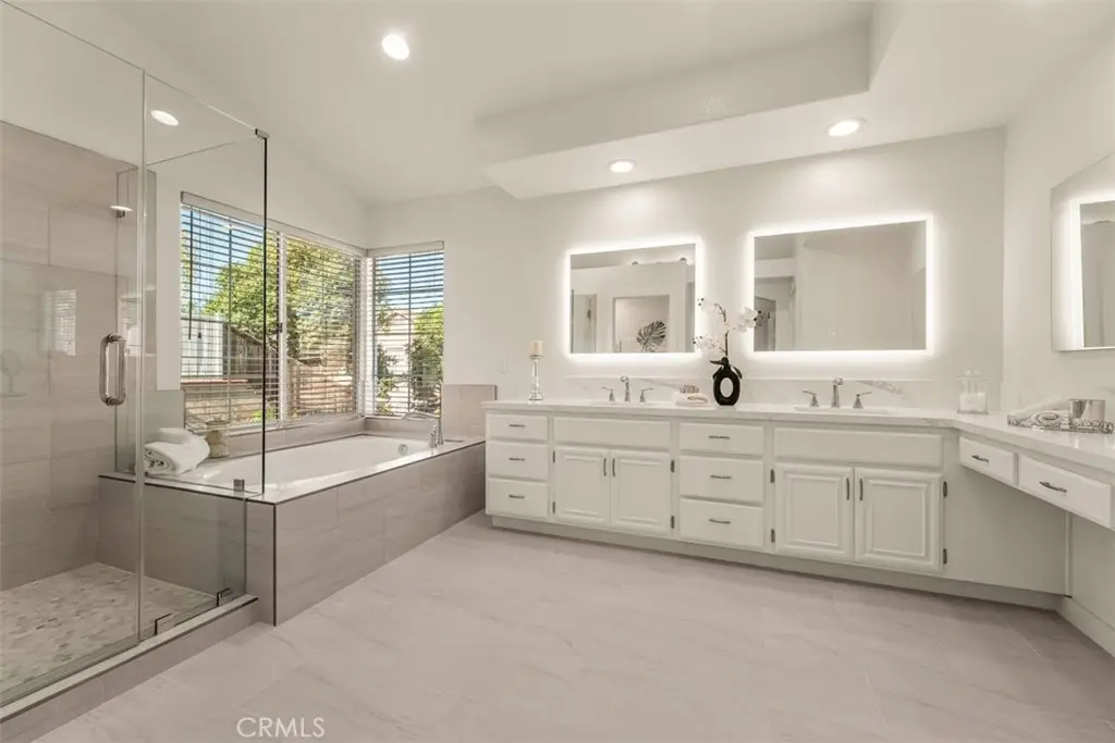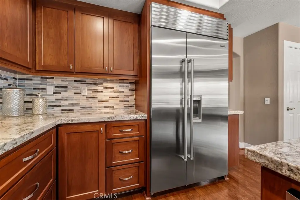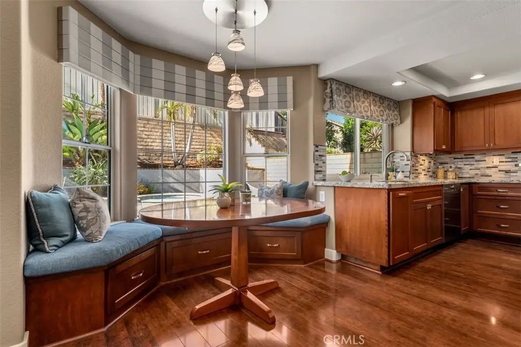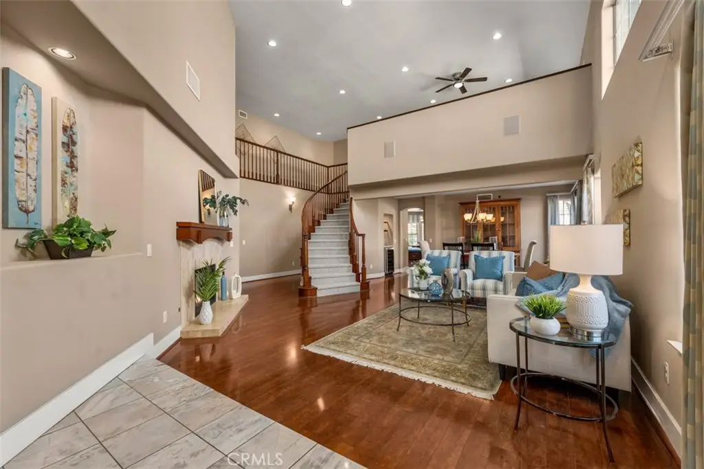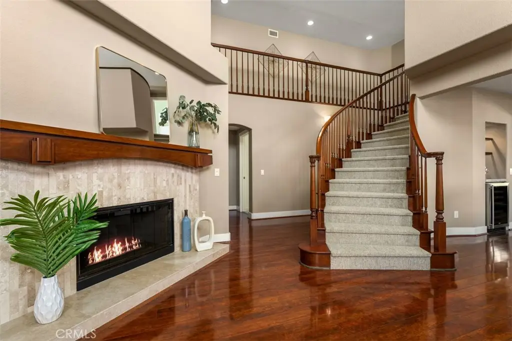 Welcome to Fairmont Terrace, a gated community offering privacy and convenience. This spacious 4 bedroom home, 3 baths with a loft and three-car garage showcases an open floor plan with thoughtful upgrades throughout. The main level features a bedroom and bath, perfect for guests or multigenerational living. Enjoy gatherings in the living room with a custom-tiled fireplace and wood mantle, a formal dining room with a dry bar and wine fridge, and a family room complete with fireplace, built-ins, and French doors that open to the backyard retreat. The remodeled chef's kitchen boasts custom cabinetry, granite countertops, designer tile backsplash, stainless steel appliances including a Wolf six-burner cooktop, built-in Sub-Zero refrigerator, Sharp drawer microwave, walk-in pantry, and a cozy breakfast nook. Upstairs, a versatile loft with ceiling fan complements two secondary bedrooms and the luxurious primary suite, featuring vaulted ceilings, dual closets including a custom walk-in, and a spa-like bath with quartz countertops, soaking tub, walk-in shower, and light-up mirrors. Step outside to a private oasis with a saltwater pool and spa with waterfall accents, fire pit, and plenty of room to relax or entertain. Additional highlights include: steamer shower downstairs, interior laundry, surround sound, water softener and reverse osmosis system, updated HVAC upgrade, Lenox furnace/AC/ducting, new carpet, vinyl flooring, garage with built-in cabinets, Generac 24w generator and two EV chargers. Ideally located within the award-winning Plac/Yorba Linda school district and walking distance to parks and schools, this home combines elegance, function, and lifestyle in one perfect package. Your home search is over!