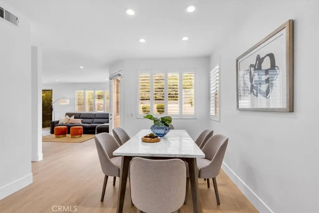 Welcome to this stunning 4-bedroom, 2.5-bathroom home in the desirable Harvest community of Aliso Viejo, where homes rarely come on the market. Perfectly situated on a corner lot at the end of a quiet cul-de-sac, this nearly 1,900 sq. ft. residence blends comfort, style, and functionality in every detail. From the moment you enter, you're greeted by soaring ceilings, abundant windows, and natural light, creating an inviting and airy atmosphere. Plantation shutters add timeless elegance while maintaining privacy. The open-concept main level is designed for modern living, featuring brand-new laminate flooring throughout and a remodeled kitchen with recessed lighting, quartz countertops, shaker cabinetry, a Viking 6-burner gas range, and Bosch stainless steel refrigerator and microwave--ideal for both everyday meals and entertaining guests. The peaceful backyard, accessible directly from the kitchen, feels like a true extension of the living space. Complete with a built-in grill and plenty of room for gatherings, it's the perfect spot for summer barbecues, weekend entertaining, or simply relaxing outdoors. Upstairs, you'll find all four bedrooms along with a conveniently located laundry room. The secondary bathroom is generously sized, offering dual sinks, crown molding, tile floors, and a shower/tub combination. The primary suite is a luxurious retreat with a mirrored closet door, a large walk-in closet, and a spa-inspired bathroom showcasing dual sinks with granite counters, a soaking tub, a step-in glass shower, crown molding, and custom lighting. The Harvest community is known for its pride of ownership and peaceful setting. Enjoy being within walking distance to neighborhood parks, hiking, and biking trails, and just a short drive to shopping, dining, entertainment, and convenient freeway and toll road access. Families will especially appreciate the home's location within the award-winning Aliso Viejo school district. Don't miss this rare opportunity to own in Harvest--schedule your private showing today!