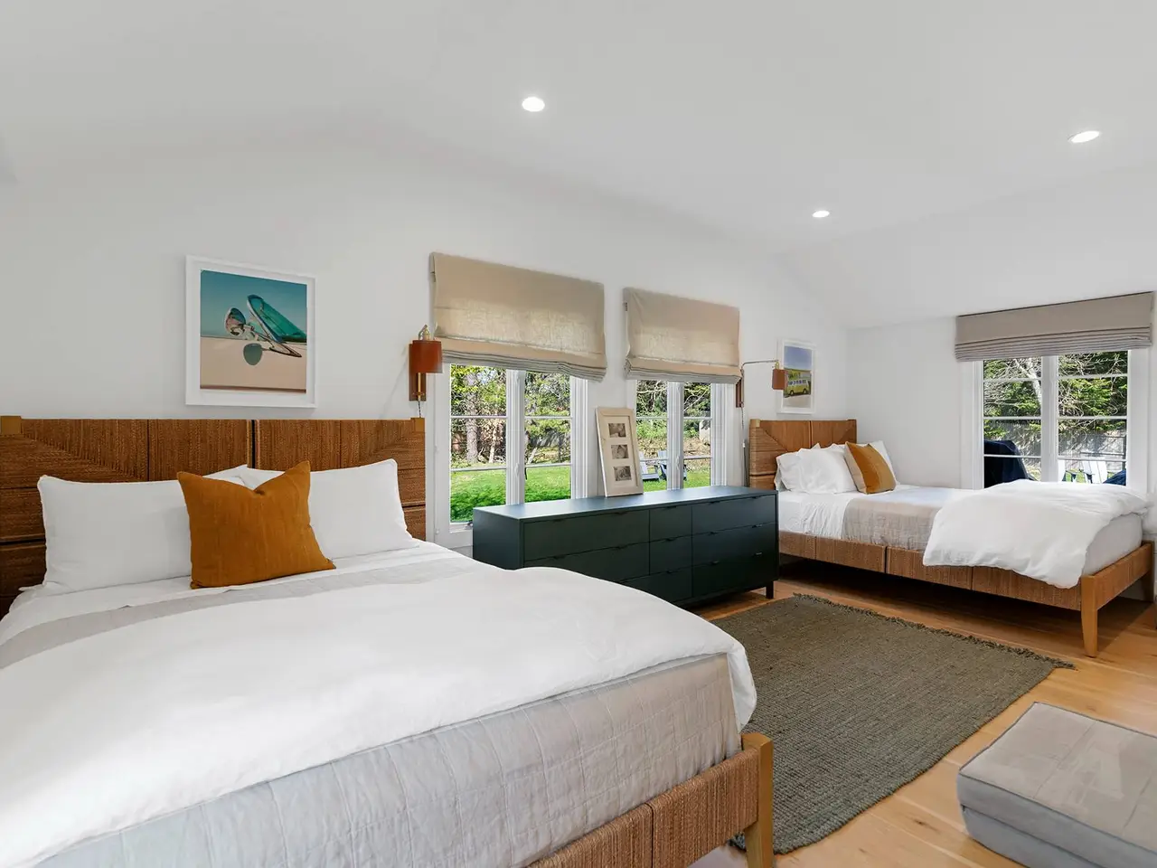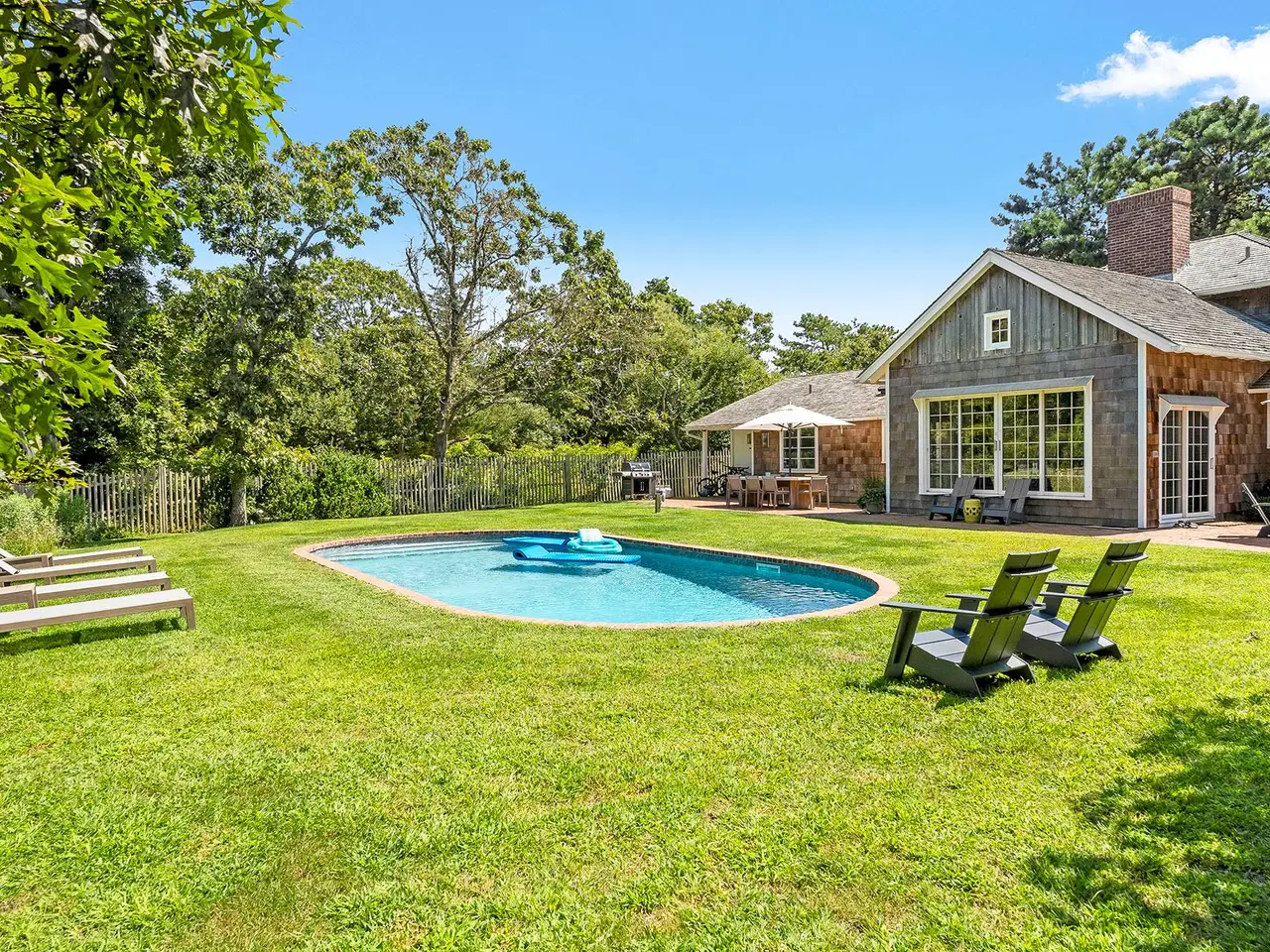 Rental Registry #23-1242 Located in Beach Hampton, Amagansett Dunes on a spacious 0.74+- acre parcel, this very special traditional cedar residence features 4 bedrooms and 3.5 bathrooms across 2,500+- sf of living space. Thoroughly renovated in 2022 with a professional kitchen, stunning marble bathrooms, and new hardwood flooring, the heart of the home is an expansive central living/dining room with a soaring vaulted, exposed-beam ceiling and brick fireplace. Fully open to the sparkling new kitchen, it is flooded with light from a wall of paned windows and sliding doors that lead to the back grounds and pool. A primary ensuite with an original refinished wood-burning masonry fireplace, 3 spacious guest bedrooms, a denTV room, and a dedicated laundry room with a utility sink complete the interior. A large brick patio perfect for dining, lounging, or entertaining overlooks the pool which backs up to mature plantings. With a private Atlantic Ocean beach entrance only one block away, this South of the Highway location also includes beach rights. Beach Hampton is a uniquely magical community of homes set amidst the natural beauty of the dunes and the vastness of the Atlantic Ocean. Great holiday get away, two weeks $30k.