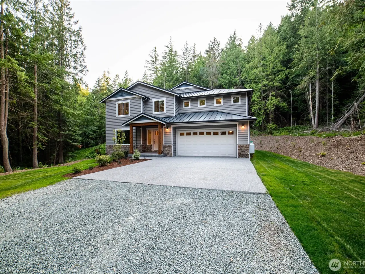 Brand new home on a secluded 4.49 acre lot. 3 car Tandem garage. Neighborhood is gated with an unattended guard house for added security and privacy. Trails lead to Whistle Lake. Metal roof and cedar siding. The home is completed with white painted cabinets, LVP and tile floors, slab granite counters, full height backsplash, white painted millwork, wood wrapped windows, double panel white painted doors and stainless steel KitchenAid appliances. High ceilings in the huge family room, formal dining room, downstairs office and a huge master bedroom make this home extremely functional. Hybrid heat pump water heater, High Efficiency ductless mini splits provide both heating and air conditioning to the entire living space.